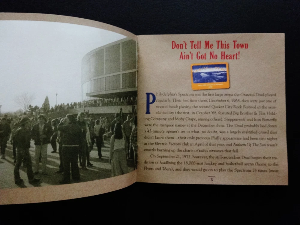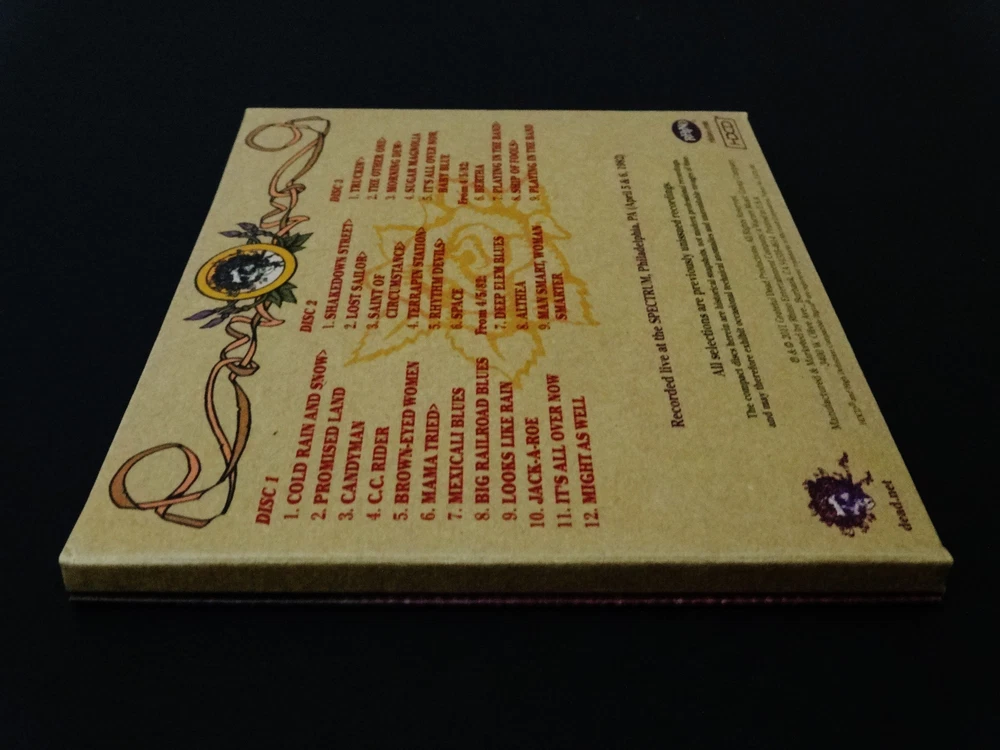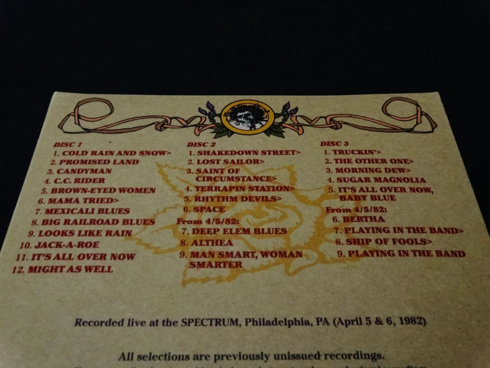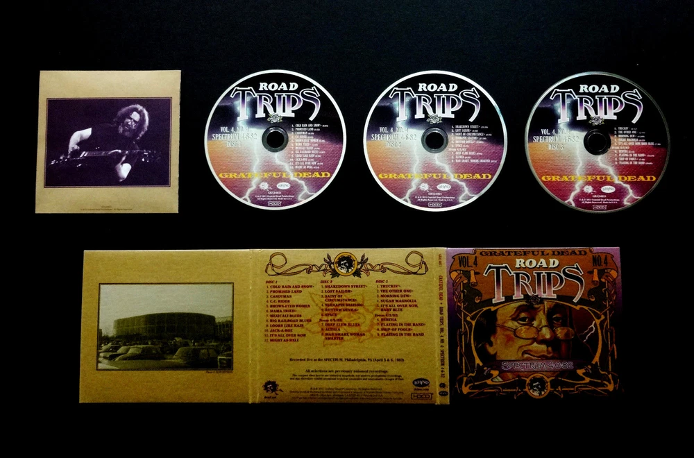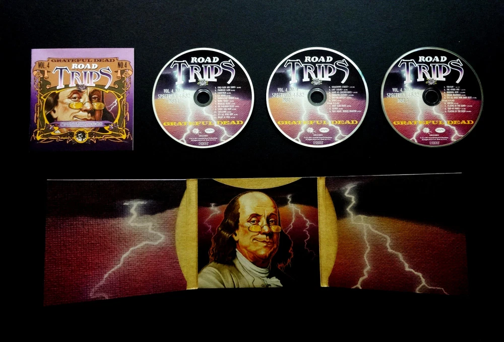 Grateful Dead : Road Trips Vol. 4 No. 4 - Spectrum 4-6-82 !! ( + 4-5-82 ! ) : The Spectrum - Philadelphia, Pennsylvania ( PA ) - April 6, 1982 + April 5, 1982 ( 4/5/1982 + 4/6/1982 ) : 3 CD : 2011 (1982/2011) Grateful Dead Productions, Inc. / Rhino ( GDP / Rhino ) - ' Original ! ' First ( 1st ! ) Edition Printing ! : Philadelphia Benjamin Franklin / Ben Franklin Cover Art ! : Red-Hot ! '82 Spring Tour ! ... at the Good Ol' Philly Spectrum !!!| A Smokin-Hot !!! ' Early-'80's ' Grateful Dead just Muscling ! the Philly Spectrum on Spring Tour 1982 !!! - Fellow '80's Dead Fans ... this one is just a flat-out Heater !!! ... and is what You ! have been waiting for. Whoa !!!!! Holy Pro-release !! & in ' Cassette-Master ' Style !!! Fellow Lovers of " 80's Dead " !!! ... You had better just fall-in for this one. Whoa !!! If perhaps you're on the hunt looking-out for some of the Absolute-Best ! Grateful Dead 1980's professional digitally-remastered releases -- well, look no further ! As far as this now-completed " Road Trips Series " goes, this was the Big-One ! for the fans that love their 80's G.D. ! Most of us Good Ol' Analoggers ( is that a word ? ) have all had pieces and/or parts of this fine Spring Spring Tour '82 show at the Philly Spectrum, and many of the 90 minute tapes circulating over the years were of above average soundboard quality -- but certainly not this !! And even after ' multiple ' tape upgrades, through the years & years. Garcia's vocal tracks & Brent's Fender-Rhoads keyboard tones appear to have been very-nicely " doctored ", or at least to my ears. A lot of the master soundboard tapes ( from my understanding ) had equalization issues which led to a real shortness of the professional releases from this fine & powerful period / Era of the Band. And, as of this 2011 release ... I believe we have actually only seen four ( 4 ) previous " Early-'80's ! " Series-Releases ever ! from that mighty-Vault ? I think this here Two-Set Philly '82 Heater -- the 10/15/83 Hartford Dick's Picks # 6 -- the 5/6/81 Nassau Dick's Picks # 13 -- & the magnificent Alpine Valley 8/7/82 Dick's Picks # 32 are it ??!? Am I missing one here, just off the top of my ( Dead ) head ??! Ha ! Well, anyhow ... the Spring Tour '82 run at the Spectrum ?!!! ... a stellar choice indeed - no doubt, and certainly one that I would have strongly recommended on my " Top 25 " that we fans Definitely-Need ! pro-released from the great & far-underrated G.D. year of '82. Not only does this release offer the entire 4/6/82 show, but you are also treated to seven ( 7 ) additional Bonus Tracks from the 4/5/82 Show, just the night prior. The sound was mighty-pure during this Pre-Midi Era to my ear, and it really tested the band to create magic with their minds & communication much more then relying on their tech-tools. Brent's rig is the most synthesized during this period, but in a good-way to my ear -- much more then in mid-'83 through '84 : the period I've heard some more negative-type fans refer to as the " cheese-keys " period. Whatever ... But I do recognize the point they are trying to make. Ace's vocals are just choice throughout this release, and that's quite possibly why it was picked ! Either that, or the mind-blowing & monumental " Shakedown !!! " kicking off Set 2 ( Disc 2 ) that Garcia just right-out manhandles. A Childhood Favorite ! Shakedown of mine personally ... You too ?! He just heavy-muscles the jam in this one, Jerry-fans - so do-not fail to hear or get this one in your possession ! The Mutron-envelope certainly pays the price & probably had to have some batteries & cords changed after he smokes these jams. " Where's Steve ? " ... Ha !! Also, it is to note that Garcia's tone is heavy & glassy ( Silver-Face !! ) not only throughout this Show, but also this whole Spring Tour '82. You are treated to slightly more overdrive than gravely / fuzzy distortion ( MXR D+ ! ), and you can just hear the Magical-Happiness ! that Jerry is feeling & directly channeling. He can get " Big " when needed, but he does not lose any of the necessary amp-pop on the 1st set material ( i.e. Brown Eyed Women & Big RxR Blues ). The set lists are just mighty-perfect for this '82 period, and outside of this Killer-Shakedown !! - Bobby's Sailor > Saint - and the Truckin' > Other One > Dew > Sugar Mag is probably ( arguably ? ) the center-point of this very ... Very-Fine ! Road Trips Series release. I'm glad they did not neglect the 80's through the life cycle of this very-beloved Road Trips Series, or I might have been quite sad. But ... alas !!! For me, this is one I always dreamed would be a pro-release, and I was just super-fired-up ! when it actually happened. In fact, this is the type of CD Set that you probably should opt to keep forever & ever -- right in that " A " Rack !!! Awesome !!!!! -- Enjoy !!!!!!! TRACK LISTING >>> Grateful Dead ' Live ' at The Spectrum in Philadelphia, Pennsylvania ( PA ) on April 6th, 1982 ( 4/6/1982 ) - also including Tracks from April 5th, 1982 ( + 4/5/1982 ) ) >>> DISC 1 : Cold Rain And Snow Promised Land Candyman C.C. Rider Brown-Eyed Woman Mama Tried > Mexicali Blues Big Railroad Blues Looks Like Rain Jack-A-Roe It's All Over Now Might As Well DISC 2 : Shakedown Street > Lost Sailor > Saint Of Circumstance > Terrapin Station > Rhythm Devils > Space From 4/5/82 : Deep Elm Blues Althea Man Smart, Woman Smarter DISC 3 : Truckin' > The Other One > Morning Dew > Sugar Magnolia Encore : It's All Over Now Baby Blue From 4/5/82 : Bertha Playing In The Band > Ship Of Fools > Playing In The Band Item Condition : This Very-Rare ! Out of Print ( 2011 GDP / Rhino release ) Grateful Dead Road Trips Vol. 4 No. 4 : Spectrum 4/6/82 (+ 4/5/82) 3-CD Set is in Like New (Near Mint/Mint!) condition. CD's ( Disc 1, Disc 2, Disc 3 ) are in Like New (Near Mint/Mint!) condition (please see photos). Liner Notes ( Inside Insert Booklet ) are in Like New (Near Mint/Mint!) condition (please see photos). CD Case ( 3-CD Tri-Fold