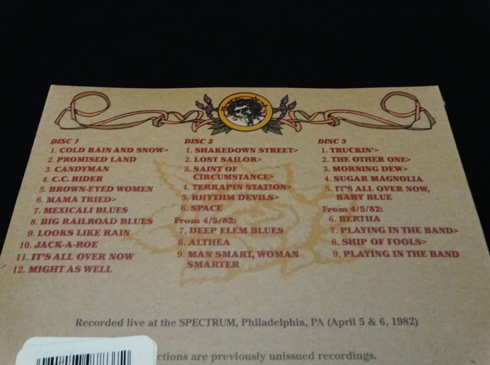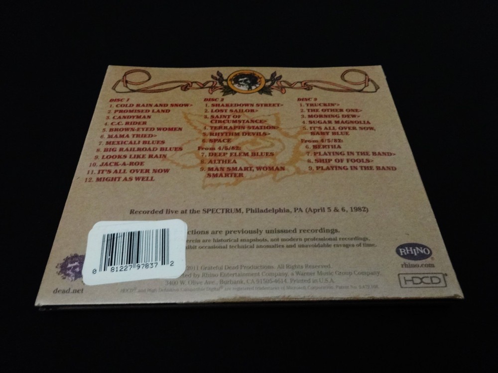 Grateful Dead : Road Trips Vol. 4 No. 4 - Spectrum 4-6-82 !! ( + 4-5-82 ! ) : The Spectrum - Philadelphia, Pennsylvania ( PA ) - April 6, 1982 + April 5, 1982 ( 4/5/1982 + 4/6/1982 ) : 3 CD : 2011 (1982/2011) Grateful Dead Productions, Inc. / Rhino ( GDP / Rhino ) - GRA2-6021 : ' Original ! ' First ( 1st ! ) Edition Printing ! : Brand New / Factory Sealed ! : Philadelphia Benjamin Franklin / Ben Franklin Cover Art ! : Red-Hot ! '82 Spring Tour ! ... at the Good Ol' Philly Spectrum !!! A Smokin-Hot !!! ' Early-'80's ' Grateful Dead just Muscling ! the Philly Spectrum on Spring Tour 1982 !!! - Fellow '80's Dead Fans ... this one is just a flat-out Heater !!! ... and is what You ! have been waiting for. Whoa !!!!! Holy Pro-release !! & in ' Cassette-Master ' Style !!! Fellow Lovers of " 80's Dead " !!! ... You had better just fall-in for this one. Whoa !!! If perhaps you're on the hunt looking-out for some of the Absolute-Best ! Grateful Dead 1980's professional digitally-remastered releases -- well, look no further ! As far as this now-completed " Road Trips Series " goes, this was the Big-One ! for the fans that love their 80's G.D. ! Most of us Good Ol' Analoggers ( is that a word ? ) have all had pieces and/or parts of this fine Spring Spring Tour '82 show at the Philly Spectrum, and many of the 90 minute tapes circulating over the years were of above average soundboard quality -- but certainly not this !! And even after ' multiple ' tape upgrades, through the years & years. Garcia's vocal tracks & Brent's Fender-Rhoads keyboard tones appear to have been very-nicely " doctored ", or at least to my ears. A lot of the master soundboard tapes ( from my understanding ) had equalization issues which led to a real shortness of the professional releases from this fine & powerful period / Era of the Band. And, as of this 2011 release ... I believe we have actually only seen four ( 4 ) previous " Early-'80's ! " Series-Releases ever ! from that mighty-Vault ? I think this here Two-Set Philly '82 Heater -- the 10/15/83 Hartford Dick's Picks # 6 -- the 5/6/81 Nassau Dick's Picks # 13 -- & the magnificent Alpine Valley 8/7/82 Dick's Picks # 32 are it ??!? Am I missing one here, just off the top of my ( Dead ) head ??! Ha ! Well, anyhow ... the Spring Tour '82 run at the Spectrum ?!!! ... a stellar choice indeed - no doubt, and certainly one that I would have strongly recommended on my " Top 25 " that we fans Definitely-Need ! pro-released from the great & far-underrated G.D. year of '82. Not only does this release offer the entire 4/6/82 show, but you are also treated to seven ( 7 ) additional Bonus Tracks from the 4/5/82 Show, just the night prior. The sound was mighty-pure during this Pre-Midi Era to my ear, and it really tested the band to create magic with their minds & communication much more then relying on their tech-tools. Brent's rig is the most synthesized during this period, but in a good-way to my ear -- much more then in mid-'83 through '84 : the period I've heard some more negative-type fans refer to as the " cheese-keys " period. Whatever ... But I do recognize the point they are trying to make. Ace's vocals are just choice throughout this release, and that's quite possibly why it was picked ! Either that, or the mind-blowing & monumental " Shakedown !!! " kicking off Set 2 ( Disc 2 ) that Garcia just right-out manhandles. A Childhood Favorite ! Shakedown of mine personally ... You too ?! He just heavy-muscles the jam in this one, Jerry-fans - so do-not fail to hear or get this one in your possession ! The Mutron-envelope certainly pays the price & probably had to have some batteries & cords changed after he smokes these jams. " Where's Steve ? " ... Ha !! Also, it is to note that Garcia's tone is heavy & glassy ( Silver-Face !! ) not only throughout this Show, but also this whole Spring Tour '82. You are treated to slightly more overdrive than gravely / fuzzy distortion ( MXR D+ ! ), and you can just hear the Magical-Happiness ! that Jerry is feeling & directly channeling. He can get " Big " when needed, but he does not lose any of the necessary amp-pop on the 1st set material ( i.e. Brown Eyed Women & Big RxR Blues ). The set lists are just mighty-perfect for this '82 period, and outside of this Killer-Shakedown !! - Bobby's Sailor > Saint - and the Truckin' > Other One > Dew > Sugar Mag is probably ( arguably ? ) the center-point of this very ... Very-Fine ! Road Trips Series release. I'm glad they did not neglect the 80's through the life cycle of this very-beloved Road Trips Series, or I might have been quite sad. But ... alas !!! For me, this is one I always dreamed would be a pro-release, and I was just super-fired-up ! when it actually happened. In fact, this is the type of CD Set that you probably should opt to keep forever & ever -- right in that " A " Rack !!! Awesome !!!!! -- Enjoy !!!!!!! TRACK LISTING >>> Grateful Dead ' Live ' at The Spectrum in Philadelphia, Pennsylvania ( PA ) on April 6th, 1982 ( 4/6/1982 ) - also including Tracks from April 5th, 1982 ( + 4/5/1982 ) ) >>> DISC 1 : Cold Rain And Snow Promised Land Candyman C.C. Rider Brown-Eyed Woman Mama Tried > Mexicali Blues Big Railroad Blues Looks Like Rain Jack-A-Roe It's All Over Now Might As Well DISC 2 : Shakedown Street > Lost Sailor > Saint Of Circumstance > Terrapin Station > Rhythm Devils > Space From 4/5/82 : Deep Elm Blues Althea Man Smart, Woman Smarter DISC 3 : Truckin' > The Other One > Morning Dew > Sugar Magnolia Encore : It's All Over Now Baby Blue From 4/5/82 : Bertha Playing In The Band > Ship Of Fools > Playing In The Band Item Condition : This Very-Rare ! ( 2011 GDP, Inc. / Rhino release ) Grateful Dead Road Trips Vol. 4 No. 4 Spectrum 4/6/82 ( The Spectrum - Philadelphia, Pennsylvania ( PA ) - April 6, 1982 ( 4/6/1982 ) + April 5, 1982 ( 4/5/1982 ) Tracks ) is Brand New / Factory Sealed ! Please see all photos provided. Photos included are of the actual item you will receive. G.D. Spring Tou