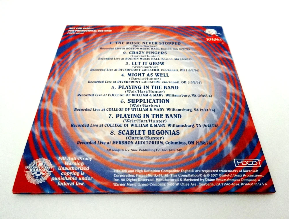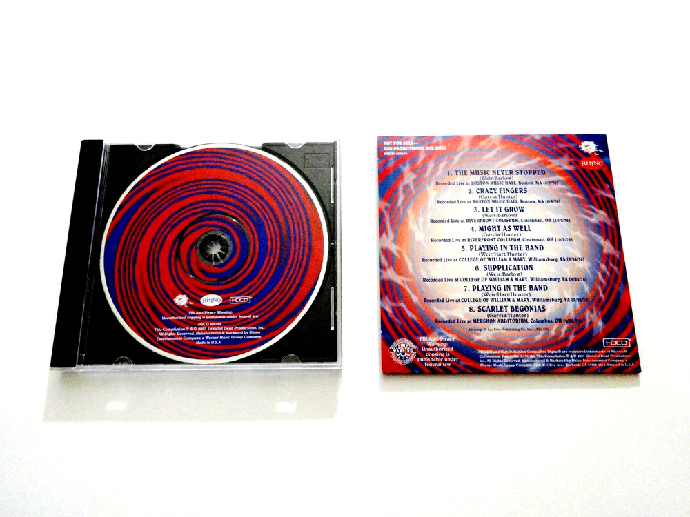 Grateful Dead : Spirit Of '76 - Live At The Cow Palace - Bonus Disc CD !!! : 2007 (1976/2007) Grateful Dead Productions, Inc. / Rhino ( GDP / Rhino ) - PRCD400168 : 1-CD : Four ( 4 ) Venue ! 1976 Tour Grateful Dead ' Bonus Disc CD ! ' Rarity !! : Very-Rare !!!!! The Very-Rare ! " Spirit of '76 " Bonus Disc CD ! 1976 Grateful Dead recorded ' Live ' in Boston, MA ( 6/9/1976 ) ! - Cincinnati, OH ( 10/2/1976 ) !! - Williamsburg, VA ( 9/24/1976 ) !!! & Columbus, OH ( 9/30/1976 ) !!!! The ! " Live At The Cow Palace " Bonus Disc CD !!!!! Dead Fans !!! Offered here is the Very-Rare ! - Elusive !! & Amazing !!! Grateful Dead " Spirit of '76 " Bonus Disc CD ( 1-CD ) which was included ' Only ! ' with the Pre/Early Order releases of the Grateful Dead - Live at the Cow Palace - 3-CD Set way back in 2007 ! This Amazing ! " Spirit of '76 " Bonus Disc CD consists of Eight ( 8 ) rare tracks from Four ( 4 ) different Shows / Venues on the 1976 Summer & Fall Tours !!! Wow ... pretty much, Wow !?!! That's about all I could think when I first heard this release upon its debut way back in 2007. As with much of 1976 during the Summer & Fall Tours, that Good Ol' ' saying ' definitely holds true with the Live-Magic ! contained on this " Spirit of '76 " Bonus Disc - - - When Phil's On The Band's On !!!!! After I listened to this one in entirety for the very first time, I vividly remember playing it again! in entirety the very next day - because it was just that good, or at least to my ears. I usually never do that ( rarely ! ), because there is just so much other worthy music to get to - especially today, in this digital age. You know, so much Grateful Dead - and so little time !! But my goodness ... the musical tones and creative versions ( & segue-transitions ! ) here just fully-demonstrate that the Band was thrilled to be back & rip-roaring after their brief Late '74-Early '75 brief group ' Hiatus ', and this is truly one of the neatest ' transitional ' periods of all-time for the Grateful Dead ! Their sound as a unit was genuinely changing, and whoever thought any change was even needed !?! Just some really amazing " evolution " here ... right on the heels of '77 !!! My focus always seemed to be on the Spring through Fall / Winter Tour in 1977 ( arguably at their very-best ) in this Prime-era overall, but there is some real freshness & creativity to these " Spirit of '76 " tracks that really shines through & through - before set lists got a bit more " settled-into " throughout '77, which is really the only worthy criticism of that period that I have ever heard and/or discussed ( i.e. only 3 Morning Dews played in 1977, etc.. ). In my personal opinion this one is way-beyond a " Must-Have ! ", with all Dead Fan seriousness. It is very rare, extremely scarce, and of course ... Extremely-Hot !! ( Naturally ... ) The Band is Ultra-Tight, Fluid & just ' On ' ... and if you really liked the 3-CD " Cow Palace " release itself, well - then this one here is a complete no-brainer. And probably the neatest part ( other than the caliber of the performances, obviously ... ) is that there are tracks from 4 different Venues right on this release ! -- inside Boston - Cincinnati - Williamsburg ( Virginia ) & Columbus ( Ohio ) !!!! Always fun to compare & contrast the energy, mood, and all of that other Grate ! Live G.D. stuff - you know ... the most vital & important info !! You bet ... I'm a " Spirit of '76 " Fan ! A Totally !! impressive G.D. ' Bonus Disc CD ' release ... Enjoy !!!!! TRACK LISTING >>> Grateful Dead recorded ' Live ' at Four ( 4 ) different Venues ( East Coast & Midwest ) during the 1976 Summer & Fall Tours ! : Spirit of '76 Live At The Cow Palace Bonus Disc ( 1-CD ) ) : The Music Never Stopped : ( Boston Music Hall, Boston, MA ( 6/9/1976 ) ) Crazy Fingers : ( Boston Music Hall, Boston, MA ( 6/9/1976 ) ) Let It Grow : ( Riverfront Coliseum, Cincinnati, OH ( 10/2/1976 ) ) Might As Well : ( Riverfront Coliseum, Cincinnati, OH ( 10/2/1976 ) ) Playing In The Band : ( College of William & Mary, Williamsburg, VA ( 9/24/1976 ) ) Supplication : ( College of William & Mary, Williamsburg, VA ( 9/24/1976 ) ) Playing In The Band : ( College of William & Mary, Williamsburg, VA ( 9/24/1976 ) ) Scarlet Begonias : ( Mershon Auditorium, Columbus, OH ( 9/30/1976 ) ) Item Condition : This Very-Rare !! ( 2007 GDP / Rhino release ) Grateful Dead Spirit of '76 Live At The Cow Palace Bonus Disc CD ( 1-CD ) featuring Eight ( 8 ) 1976 Summer & Fall Tour Live Tracks ! is in Very Good condition - close to Very Good/Like New overall. CD is in Very Good condition with light scratches/marks on the playing surface (cosmetic-only) - please see photos. CD Case ( ' Artistic ' Single-Sleeve 1-CD Case ) is in Like New (Near Mint/Mint!) condition (please see photos). This Bonus Disc CD has been very-carefully stored inside my professional CD rack, and will also be sent along inside a brand new CD Jewel Case for proper protection & safe storage as shown in photos. Please see all photos provided. Photos included are of the actual item you will receive. The " Spirit Of '76 " - Live at the Cow Palace Bonus Disc CD !!! ... Enjoy !!!!! Please Note : This Grateful Dead " Spirit of '76 " - Live At The Cow Palace Bonus Disc ( 1-CD Bonus Disc CD ! ) includes essential song tracks from all of the following Grateful Dead 1976 Summer & Fall Tour performances : Boston Music Hall ( Boston, MA ) 6/09/76 - Riverfront Coliseum ( Cincinnati, OH ) 10/02/76 - William & Mary ( Williamsburg, VA ) 9/24/76 - Mershon Auditorium ( Columbus, OH ) 9/30/76. Please also note : The " Live at the Cow Palace New Year's Eve 1976 " ( 3-CD Set ) is not-included in this listing -- One ( 1 ) Bonus Disc CD only. Enjoy !!! Please ask any questions before bidding/buying & Best of Luck ! ( also ... please feel free to click the 'see other items' button above to check-out my other related live listings - Thanks ! ) U.S. & International buyers welcome (additional shipping charges & delive