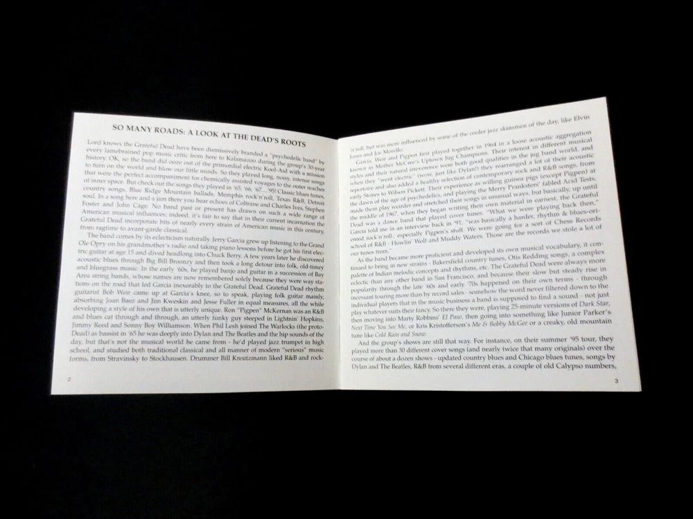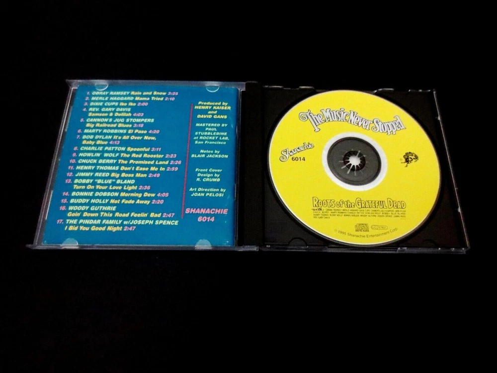 Grateful Dead : " The Music Never Stopped - Roots of the Grateful Dead !!! " : 1995 : Produced by Henry Kaiser & David Gans : Featuring Robert Crumb ( R. Crumb ) Cover Art !! : 1995 Shanachie Entertainment Group / Grateful Dead Records ( GDR ) " The Roots !! ... of the Grateful Dead !!! " ... from Merle Haggard ! - to Reverend Gary Davis ! - to Marty Robbins ! - to Bob Dylan ! - to Charlie Patton ! - to Howlin' Wolf ! - to Chuck Berry ! - to Jimmy Reed ! - to Buddy Holly ! - to Woodie Gutherie ! & More !! Produced by Sanchie & Grateful Dead Records ( GDR ) !! ... & Featuring Cover Artwork from the one & only ... " R. Crumb !!! ". Wow !!!!! Offered here is an Absolute ' No-Brainer ' ... Must-Have !! - for any Grateful Dead Fan out there !!! Printed in 1995, and you still don't own ? Whoa ... If you love your Good Ol' Grateful Dead, then this CD here is one you will find a fabulous listen -- with some serious shelf life ! No matter what level of Music Fan, or G.D. Fan that you are ... you can learn new things daily ! from this awesome release. We are talking original versions of G.D. tunes from the likes of Merle Haggard ( Mama Tried ), the Dixie Cups ( Iko Iko ), the Rev. Gary Davis ( Samson & Delilah ), Marty Robbins ( El Paso ), Bob Dylan ( Baby Blue ), Charlie Patton ( Spoonful ), Howlin' Wolf ( Little Red Rooster ), Chuck Berry ( Promised Land ), Jimmy Reed ( Big Boss Man ), Buddy Holly ( Not Fade Away ), Woodie Gutherie ( Goin' Down The Road Feelin' Bad ), and Many More !!!!! Wow, right ? Yeah ... tell my about it. Pretty Incredible assortment - of Greats ! ... and " Grates !!! ". Learn more than ever about the songs you love, the Grateful Dead loved, and that they loved to cover & play live ! That's all from me, now here's what the Liner Notes say - on the back of the CD ! Oh, and not to forget ... a Great ! Book ( Insert ) is inside too ! >>> " In their 30-year career, The Grateful Dead have taken inspiration and material from a stunning variety of American musical artists and traditions along the continuum from blues to country to rock to folk - some of the most exciting and heartfelt music ever recorded. Here are the original versions of 17 of the Dead's best-loved cover tunes that will surprise and delight you with their musical depth, originality and feeling. " TRACK LISTING >>> The Music Never Stopped : Roots of the Grateful Dead : Obray Ramsey - Rain And Snow Merle Haggard - Mama Tried Dixie Cups - Iko Iko Rev. Gary Davis - Samson & Delilah Cannon's Jug Stompers - Big Railroad Blues Marty Robbins - El Paso Bob Dylan - It's All Over Now Baby Blue Charlie Patton - Spoonful Howlin' Wolf - The Red Rooster Chuck Berry - The Promised Land Henry Thomas - Don't Ease Me In Jimmy Reed - Big Boss Man Bobby " Blue " Bland - Turn On Your Lovelight Bonnis Dobson - Morning Dew Buddy Holly - Not Fade Away Woody Gutherie - Goin' Down The Road Feelin' Bad The Pindar Family w/ Joseph Spence - I Bid You Good Night Item Condition : This " The Music Never Stopped - Roots of the Grateful Dead " ( 1995 Shanachie Entertainment Corp. / Grateful Dead Records ( GDR ) ) CD ( 1-CD ) is in Very Good condition - close to Very Good/Like New overall. CD is in Very Good condition - close to Very Good/Like New with faint-light marks/scratches on the playing surface ( cosmetic-only ) - please see photos. Liner Notes ( 24-Page Booklet Insert & Back Insert Card ) are in Very Good condition - close to Very Good/Like New with light surface wear/indentations (please see photos). CD Case ( 1-CD Jewel Case ) is in Like New (Near Mint/Mint) condition, and has been carefully stored inside protective plastic in my professional CD rack (please see photos). Please see all photos provided. Photos included are of the actual item you will receive. " The Music Never Stopped - The Roots of the Grateful Dead !!! " ... Enjoy !!!!! Please ask any questions before bidding/buying & Best of Luck ! ( also ... please feel free to click the 'see other items' button above to check out my other related live listings - Thanks ! ) U.S. & International buyers welcome (additional shipping charges & delivery time will apply for international destinations). Shipping charges include delivery confirmation on every item. Returns accepted within 14 days of purchase if item is returned unused/unplayed & undamaged (buyer pays return shipping). All items will be shipped as merchandise with the winning bid entered as item value (2023-2024).