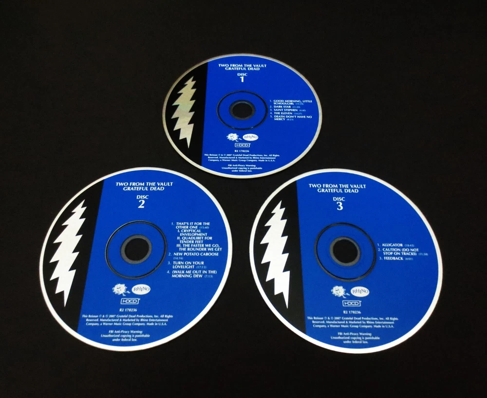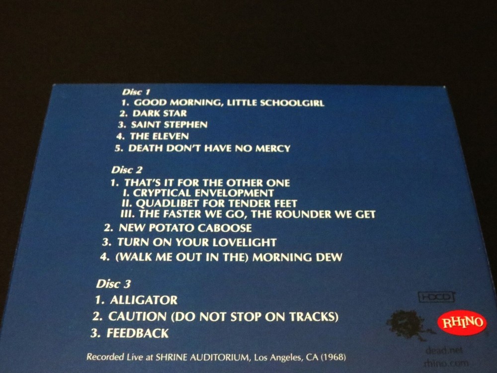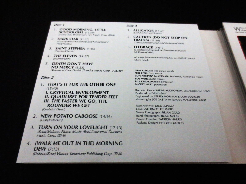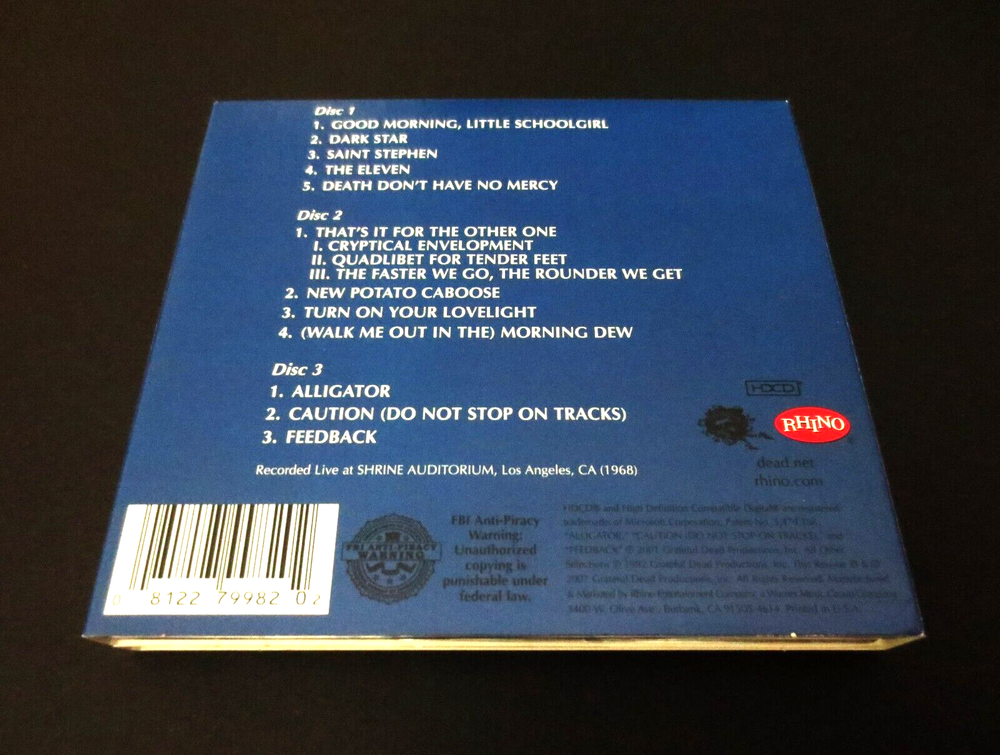 Grateful Dead : Two From The Vault : Shrine Auditorium - Los Angeles, California ( CA ) : August 23-24, 1968 ( 8/23/1968 & 8/24/1968 ) : 3 CD : " Remastered / Expanded " Three ( 3 ) CD Set : GDP / Rhino Issue ( Original 1992 & 2001 GDP, Inc. Issue(s) were 2-CD’s ' Only ! ' ... and this 2007 Issue is a 3-CD Set ! - " Remastered & Expanded !! " ) : 2007 (1968/1992/2001/2007) Grateful Dead Productions, Inc. / Rhino ( GDP, Inc. / Rhino ) - R2 170236 : 3-CD ' Remastered ! ' & ' Expanded !! ' ( 2007 ) Version !!! : Very Rare ! A Beyond-Incredible ! & Now ... Beyond-Legendary !! 1968 Grateful Dead Performance & Recording ... at the Shrine Auditorium ! - in Los Angeles, California !! on the '68 Summer Tour !!! – The " Remastered ! & Expanded !! " ( 3-CD ! ) 2007 GDP / Rhino release !!! " Alright it's time to either get up, sit down, shake your leg, or go for yourself because the Grateful Dead are here ! " Good Ol' Grateful Dead Fans !!! Yeah, that's how this one starts - meaning business, and that's exactly what the Dead does during every-track selected from these Fantastic ! August '68 nights at The Shrine in Los Angeles. I mean just look at these track selections, and as usual words really can't add a thing >>> Schoolgirl - Dark Star - St. Stephen - The Eleven - Death Don't Have No Mercy - The Other One - New Potato Caboose - Lovelight - Morning Dew. Yeah, the heavy and rough-stuff played in Pristine ! 1968 " Evolved " Live fashion. Personally, I've always felt that Summer '68 was the 1st unofficial period that marked The Grateful Dead as a Truly ' Great Band ' - and one of the Best-Ever ! regardless of what happened beyond this point. Only three ( 3 ) years in at this point - to my ear this is when it all came together musically when playing live. Powerful, poised & at times a tad raw - which really was the secret-sauce to making this fine G.D. Era unique, and like no-other. I know many Fans believe Summer of '67 marked the true beginning, and many others believe Feb / March '69 was the beginning of the Best, but for me personally - I've been hooked on this concept since I first heard this eagerly anticipated release when it originally hit stores way back in 1992. Every member of the Band is an equal part & everybody is actively cognizant of hearing each other cleanly. What members of the Band hear, musically-guides the direction of what they play - and tempo is spot on throughout, regardless of changes in gears. The Billy & Mickey timekeeping is groundbreaking, no band had that then. It's so interesting to analyze the fact that Phil & Bob are really the ' Cosmic-glue ' that steer the direction of the Ship in this Era. Jerry is really just still learning to control the exact tone & bridge / string gauge action on the electric guitar -- which I believe was the Gibson SG ? Right after the Guild Starfire / Les Paul combo order of appearance. Don't quote me, but that is the tone that my ears hear. Garcia is only what I would call 85% developed as a lead-player, but Mr. Lesh is probably in the 90% ! I mean just listen to the Electric Bass Thunder ! during the Other One Suite ( Cryptical > Quadlibet > Faster We Go ... ). However, Jerry's raw, yet buttery tone & at times + high-volume Gibson tone really melts your mind. He plays Insanely-tight ! electric leads - and some of them really take-you-there ... seriously. And who says overplay can't be beautiful ?! I love this stuff & will bet my last dollar that you will too. The " Remastered ! & Expanded !! " 3-CD Version !!! So ... " Turn On Your Light !!! & Leave It On !!!!! ". Enjoy !!!!!!! TRACK LISTING >>> CD One : Good Morning Little Schoolgirl Dark Star Saint Stephen The Eleven Death Don't Have No Mercy CD Two : That's It For The Other One I. Cryptical Envelopment II. Quadlibet For Tender Feet III. The Faster We Go The Rounder We Get New Potato Caboose Turn On Your Lovelight Morning Dew CD Three : Alligator Caution ( Do Not Stop On Tracks ) Feedback Item Condition : This Very Rare ! ( 2007 GDP, Inc. / Rhino release ) Grateful Dead Two From The Vault - Live at the Shrine Auditorium in Los Angeles, California ( CA ) on August 23 & 24, 1968 ( 8/23/1968 & 8/24/1968 ) 3-CD Remastered / Expanded Issue is in Very Good condition - close to Very Good/Like New overall. CD's are in Very Good condition - close to Very Good/Like New with faint-light marks/scratches on the playing surfaces (please see photos). CD Case ( 3-CD Quad-section fold-out / plastic disc trays ) is in Very Good/Like New condition with a small light ( white ) discoloration mark on the right/inside ( external ) spine area, and very-slight surface wear (please see photos). Please see all photos provided. Photos included are of the actual item you will receive. The Grateful Dead Live ! on '68 Summer Tour !! - at the L.A. Shrine !!! - ' Two !! From the Vault !!! ' … the " 3-CD Remastered ! & Expanded !! " Version !!! ... Enjoy !!!!! Please ask any questions before bidding/buying & Best of Luck ! ( also ... please feel free to click the ‘see other items’ button above to check out my other live listings - Thanks ! ) U.S. & International buyers welcome (additional shipping charges & delivery time will apply for international destinations). Shipping charges include delivery confirmation on every item. Returns accepted within 14 days of purchase if item is returned unused & undamaged (buyer pays return shipping). All items will be shipped as merchandise with the winning bid entered as item value (2025-2026).