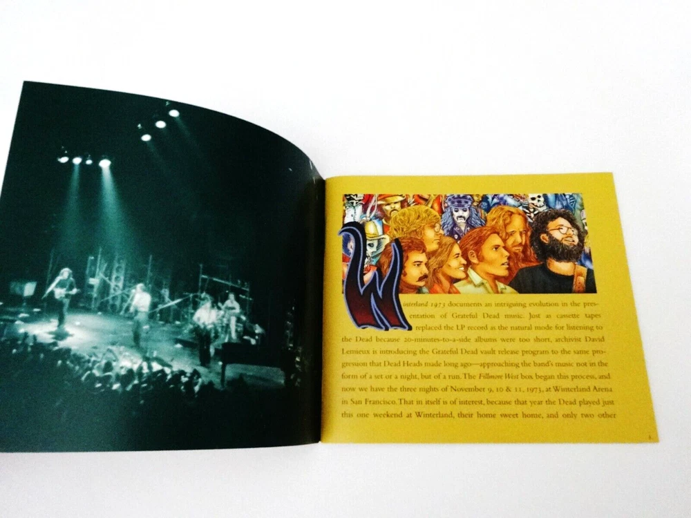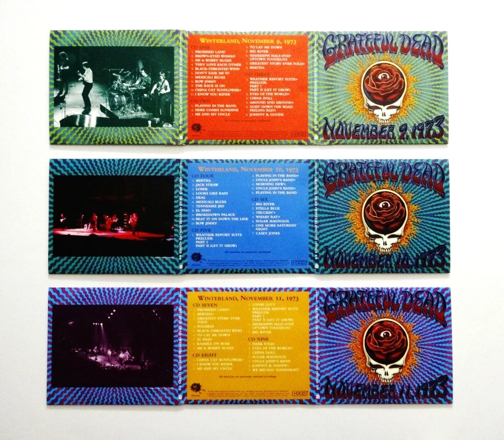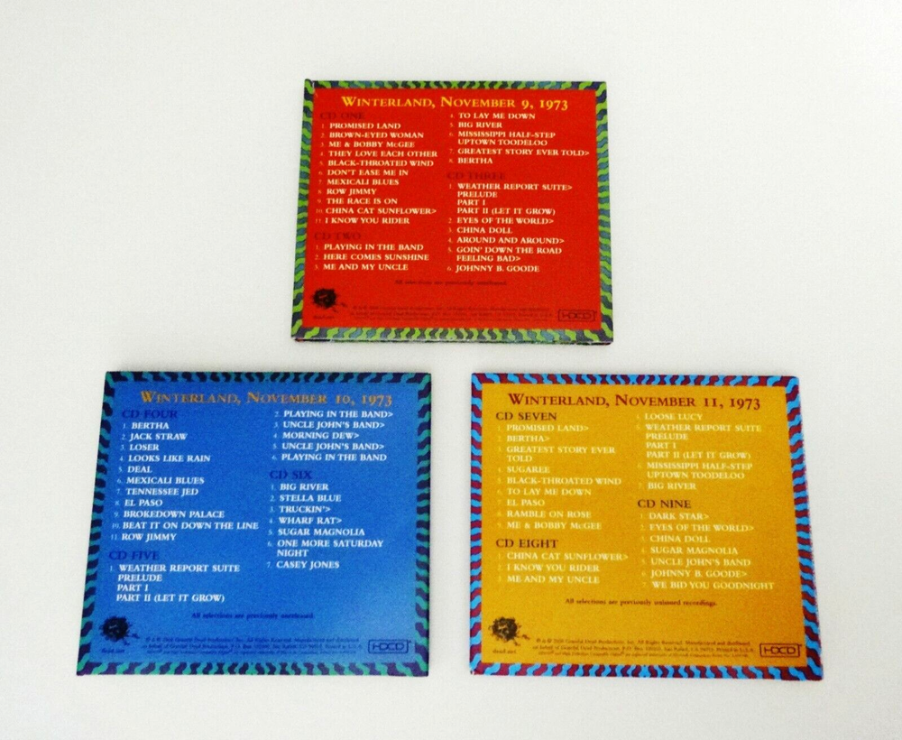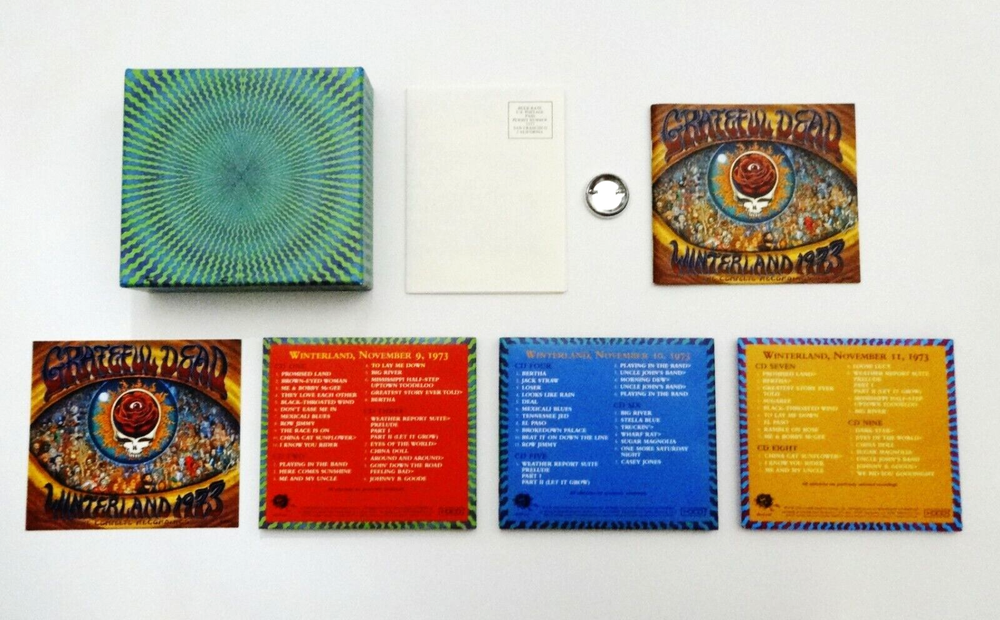 Grateful Dead - Winterland 1973 The Complete Recordings - Box Set ( 9 CD's - EMEK Art - Collectibles ) - Winterland Arena - San Francisco, California ( CA ) - November 9, 10, 11, 1973 ( 11/9/1973 - 11/10/1973 - 11/11/1973 ) - 9 CD Box Set - 2008 Grateful Dead Productions - Rhino (1973/2008) - GRA2-6101 1973 Grateful Dead ( Jerry Garcia / Bob Weir / Phil Lesh / Bill Kreutzmann / Keith Godchaux / Donna Jean Godchaux ) - 11/9/73 - 11/10/73 - 11/11/73 November 9, 1973 ( 11/9/1973 ) - Winterland Arena - San Francisco, California ( CA ) November 10, 1973 ( 11/10/1973 ) - Winterland Arena - San Francisco, California ( CA ) November 11, 1973 ( 11/11/1973 ) - Winterland Arena - San Francisco, California ( CA ) The Grateful Dead - Winterland Arena - 1973 - The Complete Recordings Box Set ( 9 CD's - EMEK Art - Collectibles ) Grateful Dead Winterland 1973 Box Set Featuring EMEK Artwork - ( Box Set Includes : EMEK Art Designed Box, 3 CD Cases, 9 CD's & Art Card - Good Ol' Grateful Dead Pin - Newsletter - 28 Page Liner Notes Book ) Very Good condition - near Very Good/Like New overall ( very-light marks on CD's ( Very Good/Like New - very close to Like New ) / small corner-tear on 11/9/73 CD case ( photo #11 ) / light surface wear, rippling & small ink marks on outer box - back cover ( photo #2 ) / slight ' internal ' separation of black support material inside box ( photo #12 ) / Like New (Near Mint/Mint) components otherwise / All items originally issued with this 9-CD Box Set are included inside ( Three 3-CD Sets ( 9-CD's ) - Liner Notes Book ( 28-Pages ) - Art Card - Newsletter - Pin ) - please see photos / all CD's play perfect - entirely tested ).
