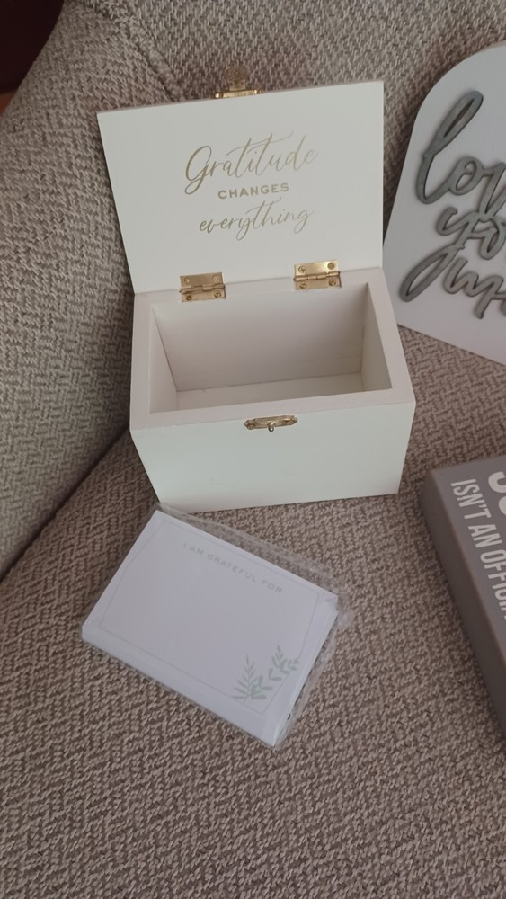 The Gratitude Box is a decorative trinket box with matching paper. It is suitable for all occasions and can be placed in any room. The box features a press fastening closure, is original, and comes unboxed. It is a perfect addition to any collection of decorative collectibles and can be cleaned with a damp cloth for easy maintenance. This Gratitude Box is a beautiful and practical item that can add a touch of elegance to any space.