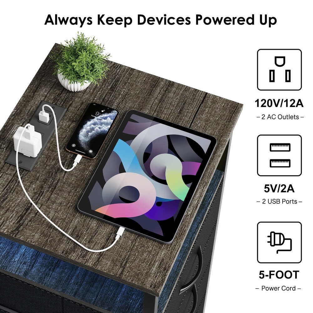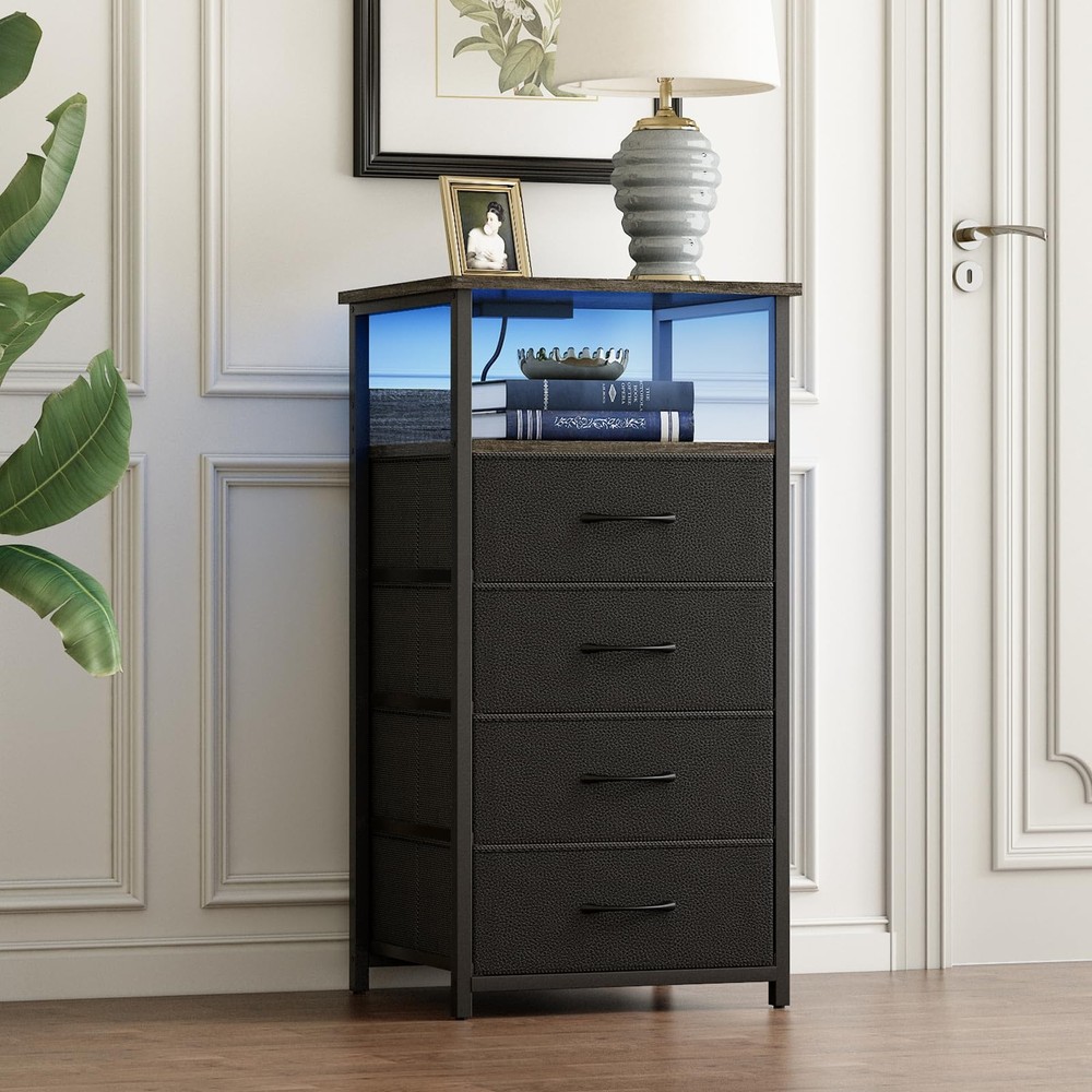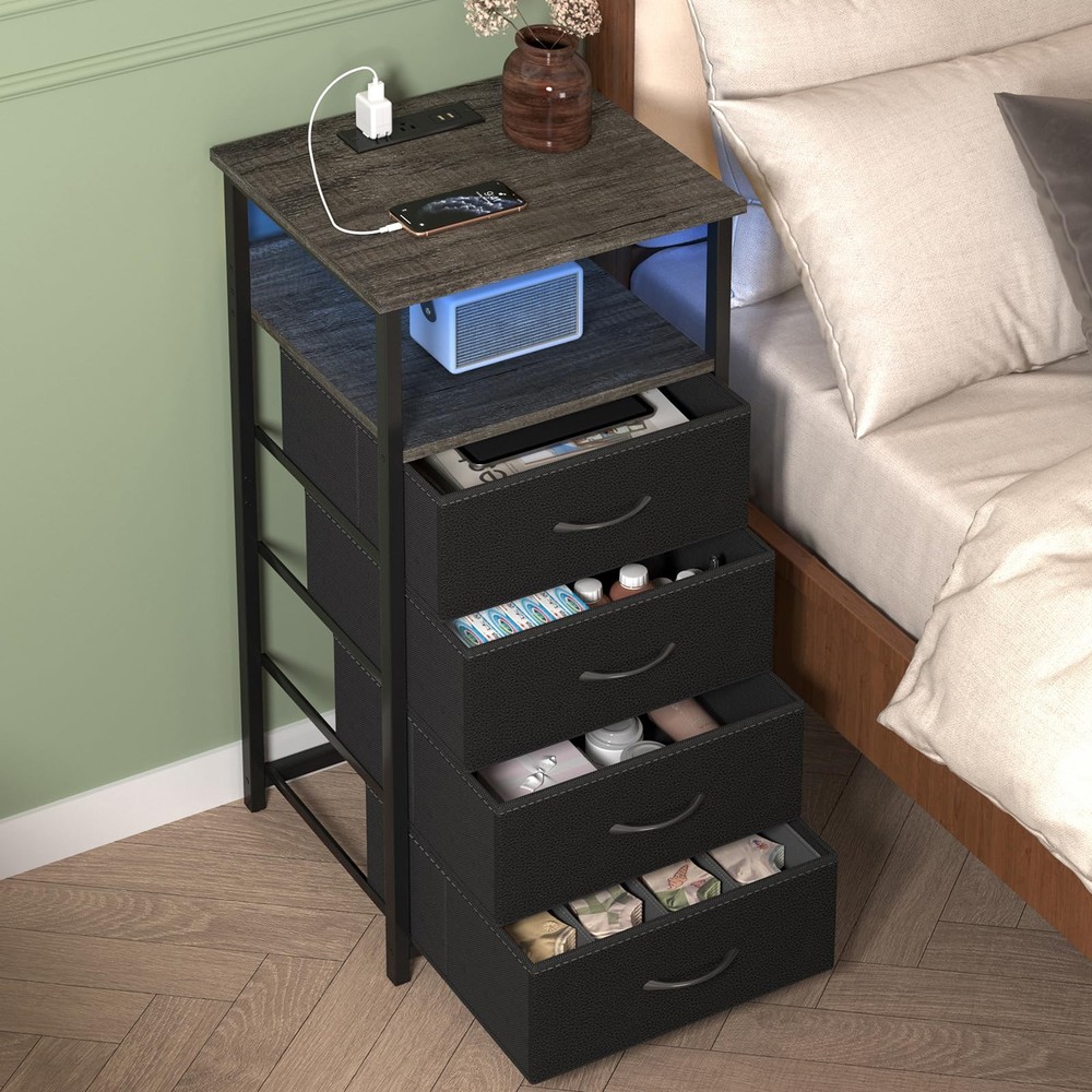 Night Stand with Charging Station, Tall Nightstand with U-S-B Ports and Outlets, 4 Fabric Storage Drawers with PU Finish, Small Dresser Bed Side Table, Gray