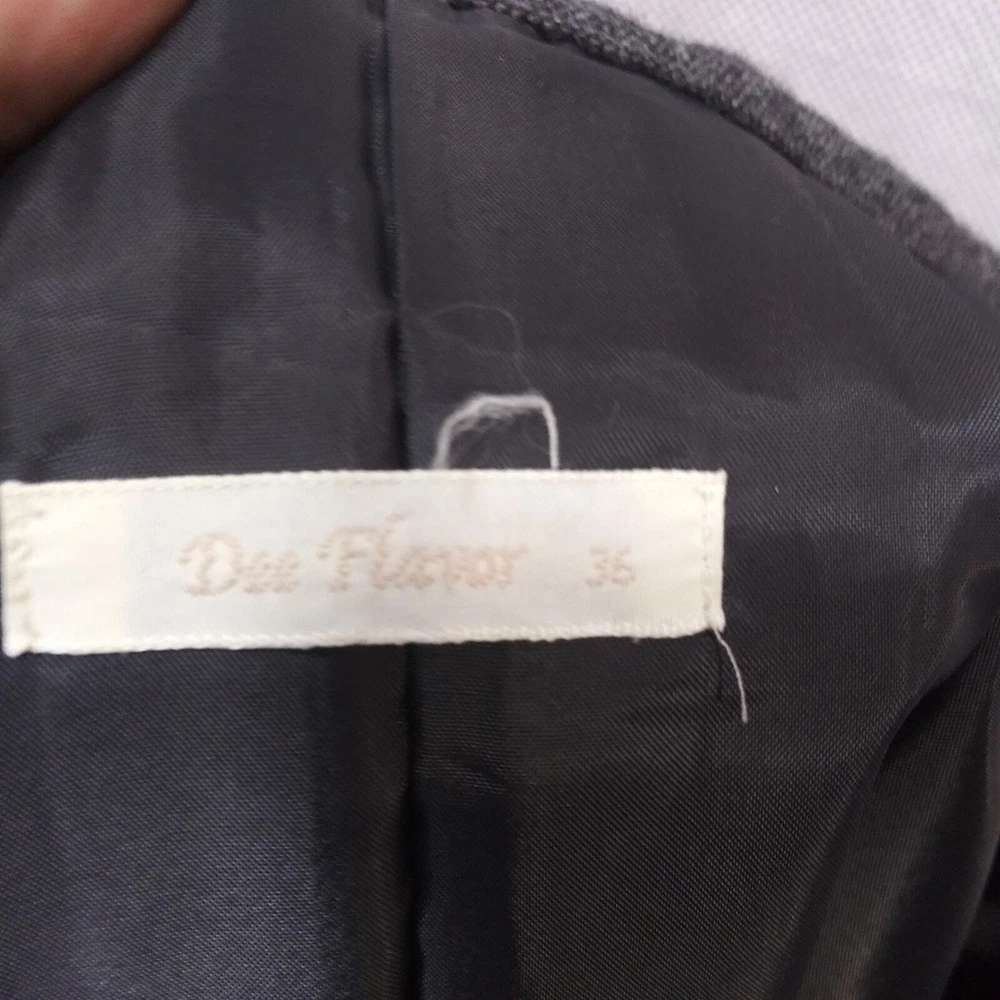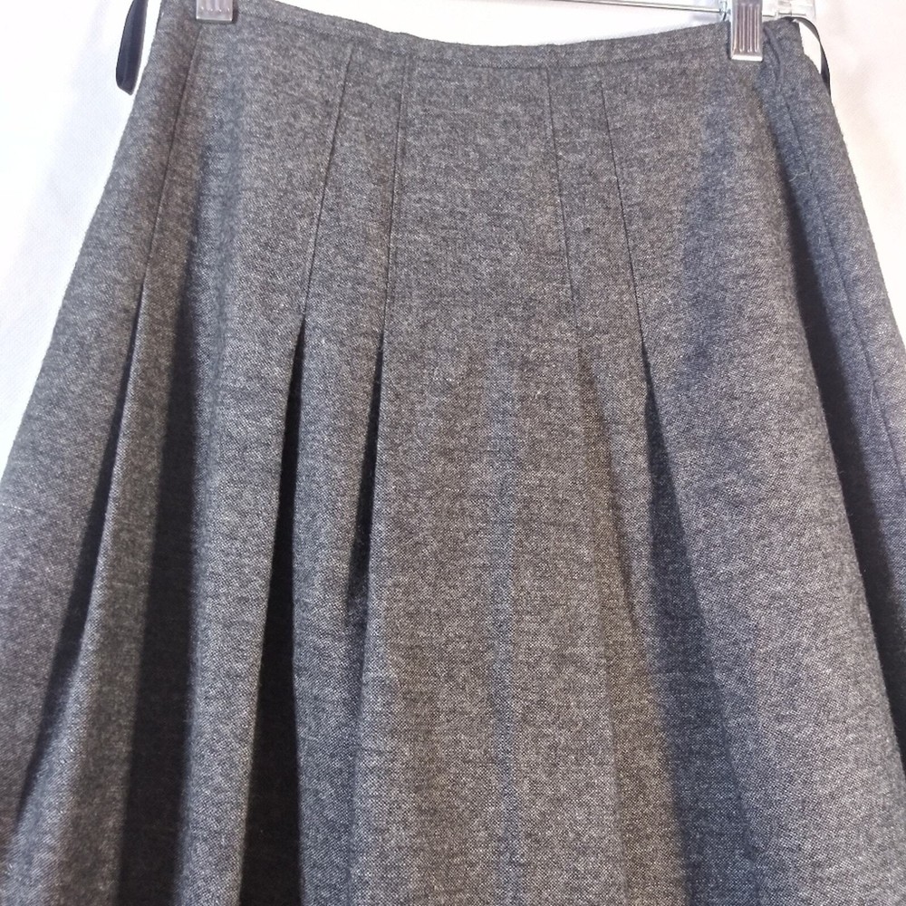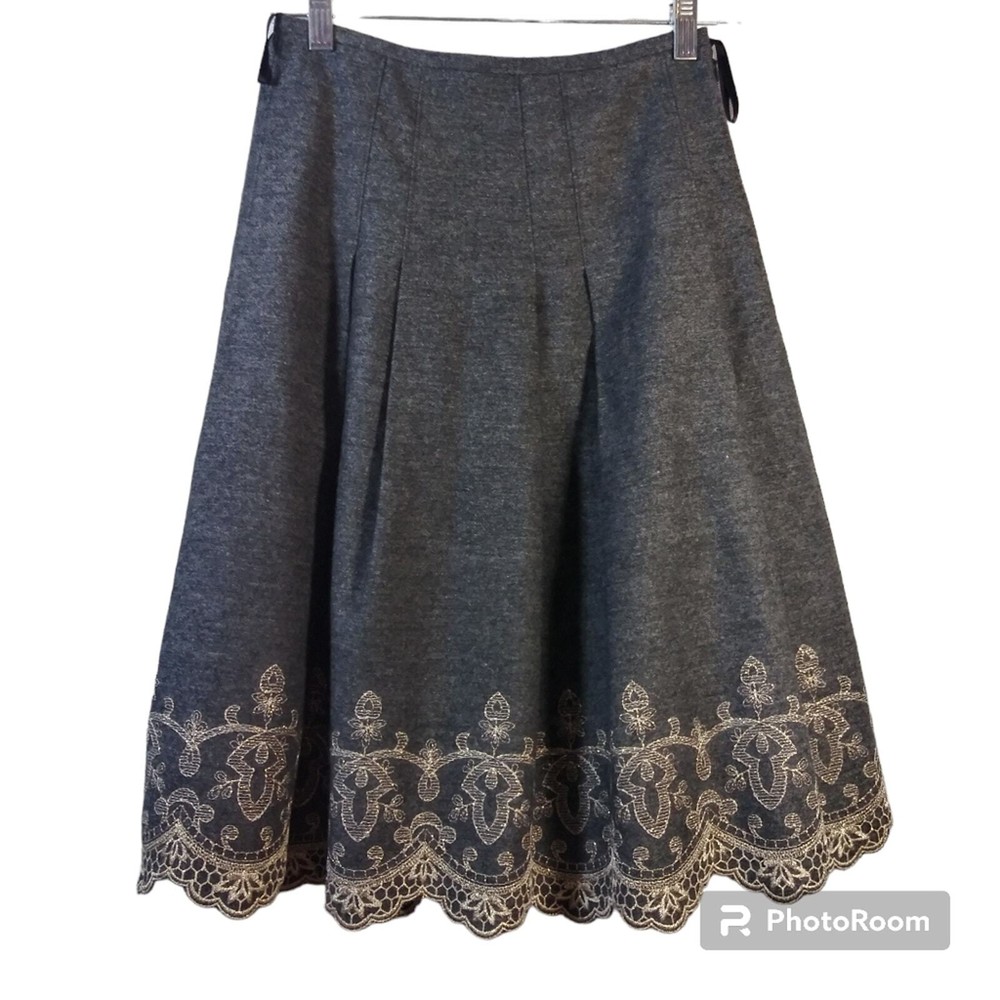 Dee Flavor Gray Pleated Gold Embroidered Skirt Wool Size Small Size Translation is a small (4-6) See measurements Wool blend skirt Pleated Gold metallic thread embroidered detail Lined Side zip Gently worn approximate measurements waist across 13" length 24"