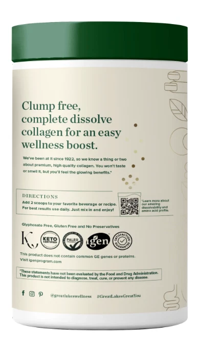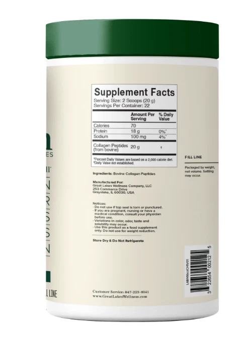 About This Item We aim to show you accurate product information. Manufacturers, suppliers and others provide what you see here, and we have not verified it. Gelatin, Unflavored, Jar 16 OZ Collagen Dietary Supplement. Hot or cold liquid soluble. Pure unflavored protein. Kosher beef. Great Lakes gelatin. Collagen Protein: Hydrolyzed collagen can help regulate the body's metabolism by providing protein of low molecular weight that is quickly absorbed in the digestive tract. The rapid absorption and distinctive amino acid groups in this formula will impact a large number of metabolic pathways. The body's natural ability to repair supporting connective tissue (bone, tendons, ligaments, cartilage, skin, hair, and nails) diminishes in one's mid-twenties. Collagen contains amino acids such as glycine, lysine, and proline, which are important amino acids and can be used by the body to build connective tissue structures to support the functions of the cells. Hydrolyzed collagen is the same collagen found naturally in bones, skin, and cartilage. It is a bioactive product containing 90% protein and is easily assimilated by the body. Hydrolyzed collagen is the unique combination of amino acids in concentrated levels. This low molecular weight protein is easily digested which supports the body's natural healing. Collagen Hydrolysate will not congeal because it has been hydrolyzed for quick assimilation into the body. Collagen is important to nitrogen balance, and may prevent age related cartilage damage and collagen loss. Gluten free. No MSG. No GMO. General Analysis: Protein 90-92%; Bloom 0; Viscosity 5.5-7.5; pH 5.0-6.5; Moisture less than 10%; Ash less than 2%; Sodium 100 mg/100 gm; Carbohydrates 0%; Fat 0%; Heavy Metals less than 0.005%; Bacteria Test USP/NF bacteria; Calories per Ounce 103.0 calories; Molecular Weight less than 5000. Maximum Amino Acid Content: Alanine 11.0% (1210 mg); Arginine 9.3% (1023 mg); Aspartic acid 6.7% (737 mg); Cystine 0.1% (11 mg); Glutamic Acid 11.4% (1254 mg); Glycine 29.0% (3190 mg); Histidine 1.0% (110 mg); Hydroxyproline 14.5% (1595 mg); Hydroxylysine 1.2% (132 mg); Isoleucine 1.8% (198 mg); Leucine 3.4% (374 mg); Lysine 4.6% (506 mg); Methionine 1.0% (110 mg); Phenylalanine 2.6% (286 mg); Proline 17.6% (1936 mg); Serine 3.8% (418 mg); Threonine 2.2% (242 mg); Tryptophane 0.0% (0 mg); Tyrosine 1.0% (110 mg); Valine 3.3% (363 mg). Manufactured under Great Lakes Gelatin Company's specifications. (These statements have not been evaluated by the Food and Drug Administration. This product is not intended to diagnose, treat, cure, or prevent any disease.) Do not refrigerate. Recommended Dosage: Take two rounded tablespoons (12 gm) twice a day. Recommended Uses: This product has a low molecular weight so it will dissolve in cold, warm, or hot liquids. Collagen Hydrolysate as a pure protein taken before meals may help curb appetite. Enjoy when added to your favorite drink such as coffee, smoothies, non-carbonated beverages or juice. 16 oz (1 lb) 454 g Grayslake, Collagen Hydrolysate, Unflavored Collagen Dietary Supplement. Hot or cold liquid soluble. Pure unflavored protein. Kosher beef. Great Lakes gelatin. Collagen joint care. Collagen Protein: Hydrolyzed collagen can help regulate the body's metabolism by providing protein of low molecular weight that is quickly absorbed in the digestive tract. The rapid absorption and distinctive amino acid groups in this formula will impact a large number of metabolic pathways. The body's natural ability to repair supporting connective tissue (bone, tendons, ligaments, cartilage, skin, hair, and nails) diminishes in one's mid-twenties. Collagen contains amino acids such as glycine, lysine, and proline, which are important amino acids and can be used by the body to build connective tissue structures to support the functions of the cells. Hydrolyzed collagen is the same collagen found naturally in bones, skin, and cartilage. It is a bioactive product containing 90% protein and is easily assimilated by the body. Hydrolyzed collagen is the unique combination of amino acids in concentrated levels. This low molecular weight protein is easily digested which supports the body's natural healing. Collagen Hydrolysate will not congeal because it has been hydrolyzed for quick assimilation into the body. Collagen is important to nitrogen balance, and may prevent age related cartilage damage and collagen loss. Gluten free. No MSG. No GMO. General Analysis: Protein 90-92%; Bloom 0; Viscosity 5.5-7.5; pH 5.0-6.5; Moisture less than 10%; Ash less than 2%; Sodium 100 mg/100 gm; Carbohydrates 0%; Fat 0%; Heavy Metals less than 0.005%; Bacteria Test USP/NF bacteria; Calories per Ounce 103.0 calories; Molecular Weight less than 5000. Maximum Amino Acid Content: Alanine 11.0% (1210 mg); Arginine 9.3% (1023 mg); Aspartic acid 6.7% (737 mg); Cystine 0.1% (11 mg); Glutamic Acid 11.4% (1254 mg); Glycine 29.0% (3190 mg); Histidine 1.0% (110 mg); Hydroxyproline 14.5% (1595 mg); Hydroxylysine 1.2% (132 mg); Isoleucine 1.8% (198 mg); Leucine 3.4% (374 mg); Lysine 4.6% (506 mg); Methionine 1.0% (110 mg); Phenylalanine 2.6% (286 mg); Proline 17.6% (1936 mg); Serine 3.8% (418 mg); Threonine 2.2% (242 mg); Tryptophane 0.0% (0 mg); Tyrosine 1.0% (110 mg); Valine 3.3% (363 mg).Manufactured under Great Lakes Gelatin Company's specifications. (These statements have not been evaluated by the Food and Drug Administration. This product is not intended to diagnose, treat, cure, or prevent any disease.) Indications: Health Concern: Joint Health & Support Skin Support Beauty Support Ingredients: Ingredients: Hydrolyzed Collagen. Directions: Dosage: Recommended Dosage: Take two rounded tablespoons (12 g) twice a day.Recommended Uses: Collagen Hydrolysate from Great Lakes Gelatin will easily dissolve in your favorite beverages such as coffee, tea, juice or a smoothie. Instructions: Do not refrigerate. Recommended Dosage: Take two rounded tablespoons (12 gm) twice a day. Recomme