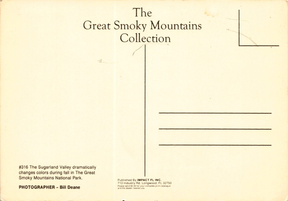 MAKE AN OFFER. THE MORE YOU BUY THE BETTER DEAL I WILL ACCEPT The postcard features a photograph of the Sugarland Valley in the Great Smoky Mountains National Park during the fall season. The image showcases the valley's vibrant changing colors during autumn, a popular and visually stunning phenomenon in the park. The photograph is credited to photographer Bill Deane and published by IMPACT FL INC.