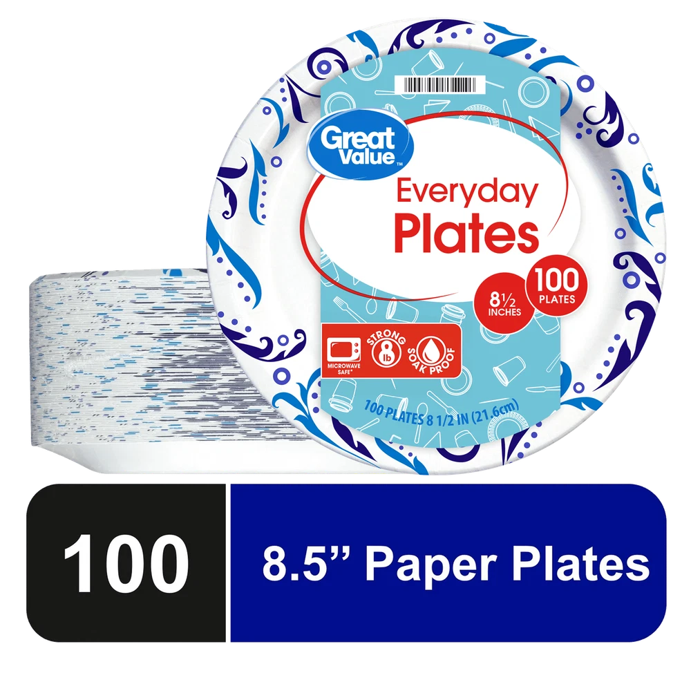 Serve food with ease using Everyday Paper Plates. They're perfect for everyday use or for special occasions. These round plates are extra-strong and soak proof. Use these plates at your next residential barbecue, birthday party, while you're watching the game, at your next pool party or any get together. They are suitable for barbecue dishes, snacks, dinner, lunch, desserts and more. They offer quick and easy disposal and clean-up for when the party is over. This package comes with 100 pleasantly decorated plates making it easy to stock up. These everyday plates are also microwave safe so you can easily re-heat food. Serve up your next meal with Everyday Paper Plates. products provide families with affordable, high quality grocery and household consumable options. With our wide range of product categories spanning grocery and household consumables, we offer you a variety of products for your family's needs. Our products are conveniently available online and in stores nationwide, allowing you to stock up and save money at the same time. Everyday Disposable Paper Plates, 8.5", 100 Count Strong and durable Soak proof Microwave safe Convenient way to serve meals or snacks Ideal for everyday use or special occasions like residential barbecues Makes clean up a breeze Round plates measure 8.5"