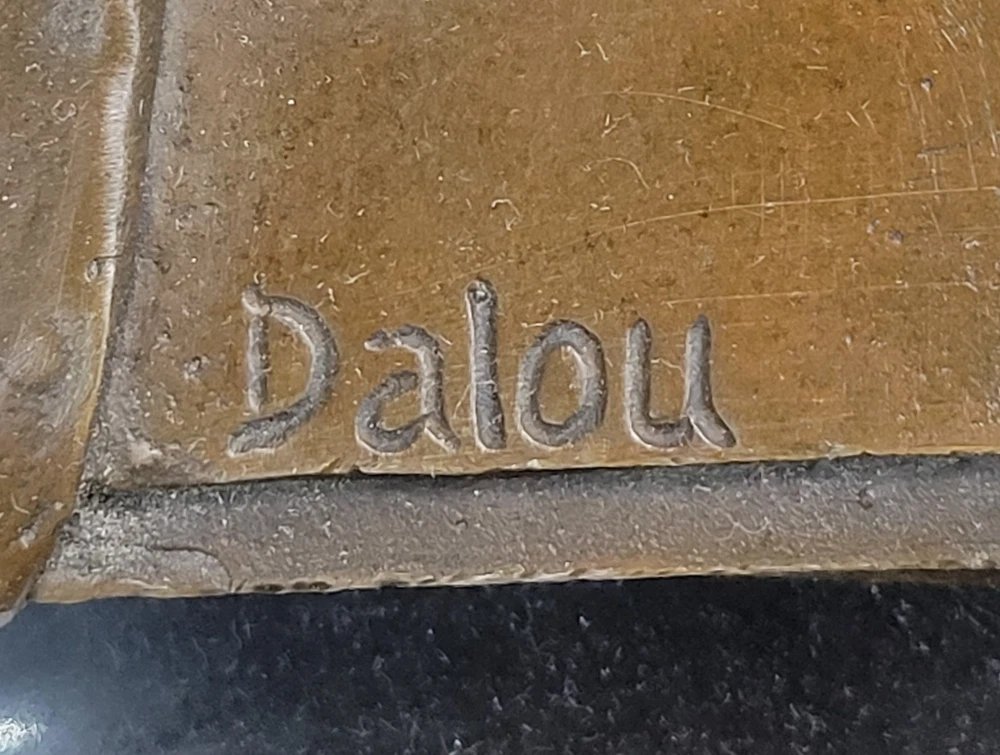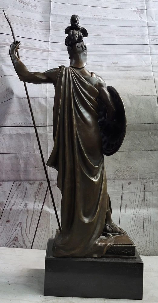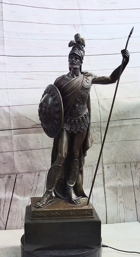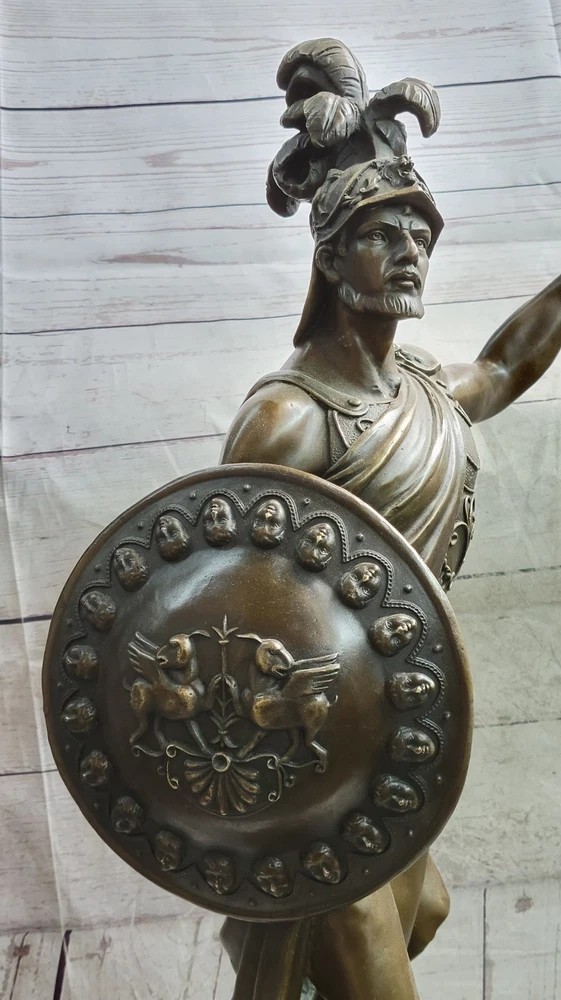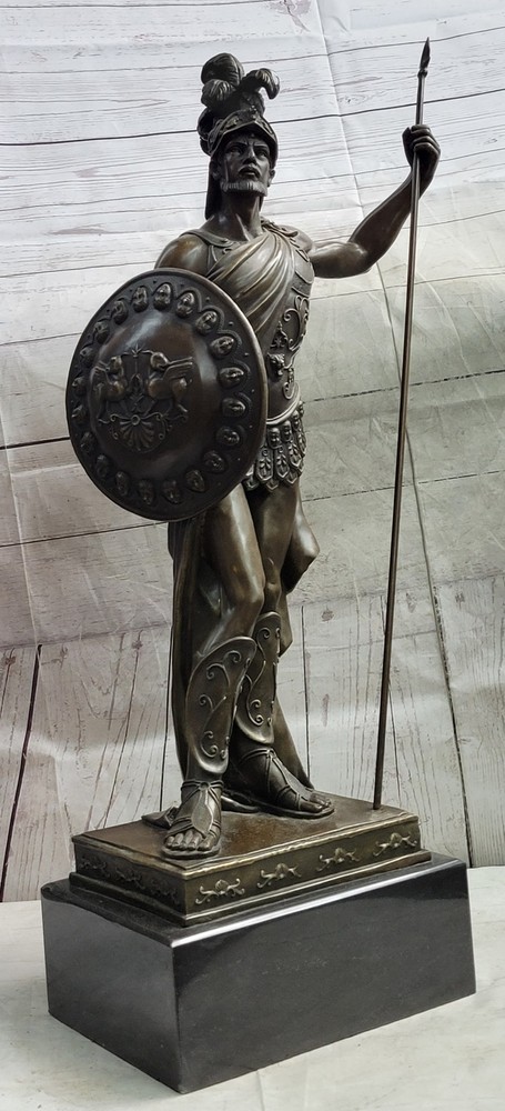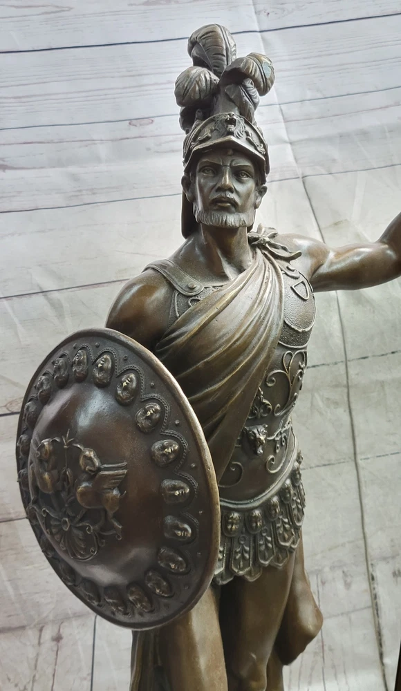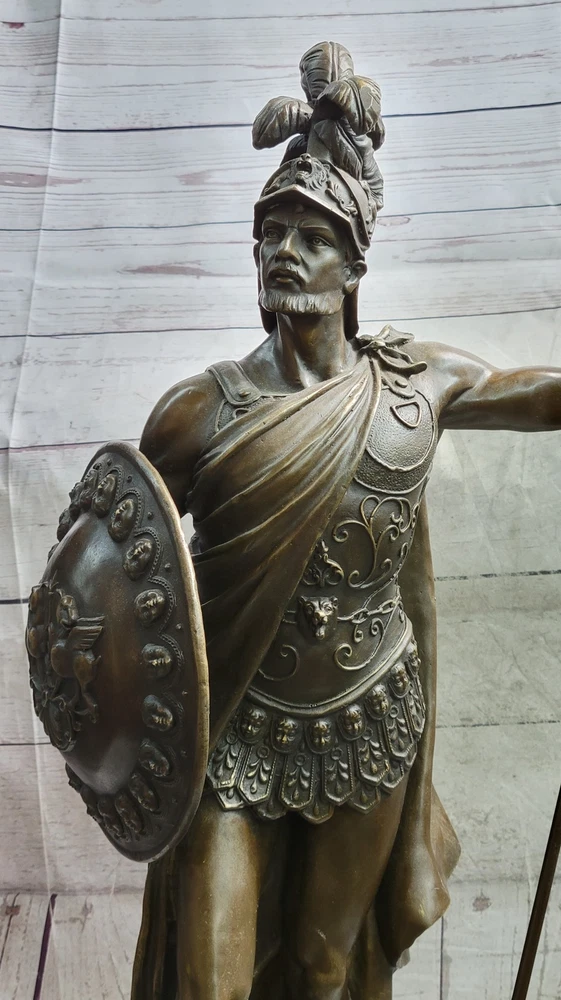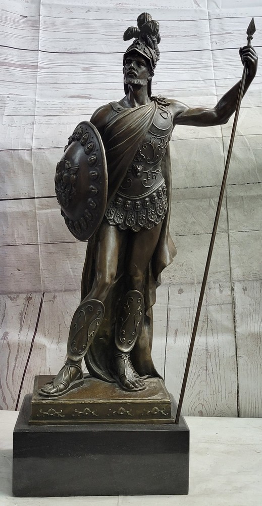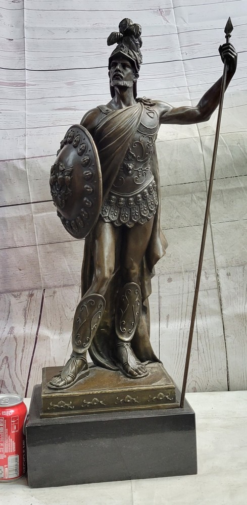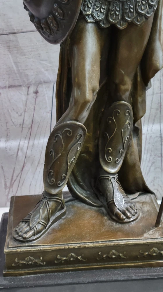 Condition : This sculpture is in perfect condition. Bronze Dimensions with Marble Base: Height 30" x Width 15" Marble Dimensions: 10" X 8" Height without base: 26 " Weight:60 LBS Inventory: 14Y822B17941 This stunning bronze sculpture immortalizes the valor and unwavering spirit of a Roman knight. Standing proudly with his armor glistening and weapons at the ready, he exudes an aura of unyielding confidence. Every meticulously crafted detail, from the taut muscles to the intricate battle costume, brings this ancient warrior to life. In one hand, he clutches a long spear, poised for battle. In the other, he firmly grips his shield, ready to protect himself and his comrades. The knight's attire, including his helmet, is a testament to the meticulous craftsmanship that defined the Roman era. His unwavering gaze and steadfast posture serve as a symbol of bravery and honor. Crafted using the revered lost-wax casting method, this sculpture is a work of artistry and endurance, just like the knights of old. It proudly rests upon a black marble base, providing both stability and a striking contrast that enhances its overall appeal. With the artist's signature, Dalou, this sculpture is not only a magnificent addition to any collection but also a reminder of the indomitable spirit of ancient warriors. Signed Daloue Roman Legion Soldier Warrior Bronze Marble Sculpture Statue Figure Video will open in a new window Using the eBay App? Paste link into a browser window: [isdntekvideo]