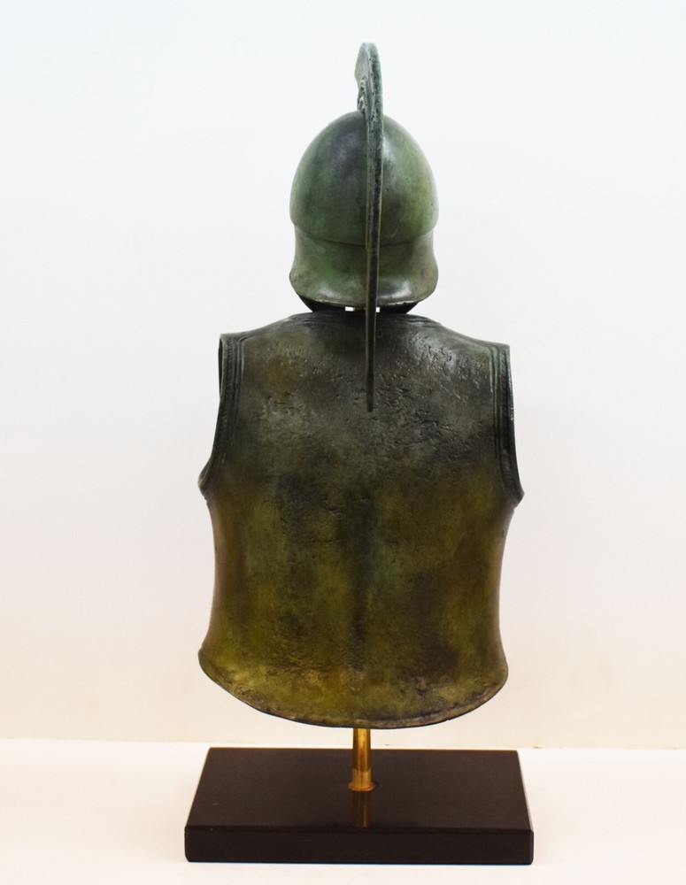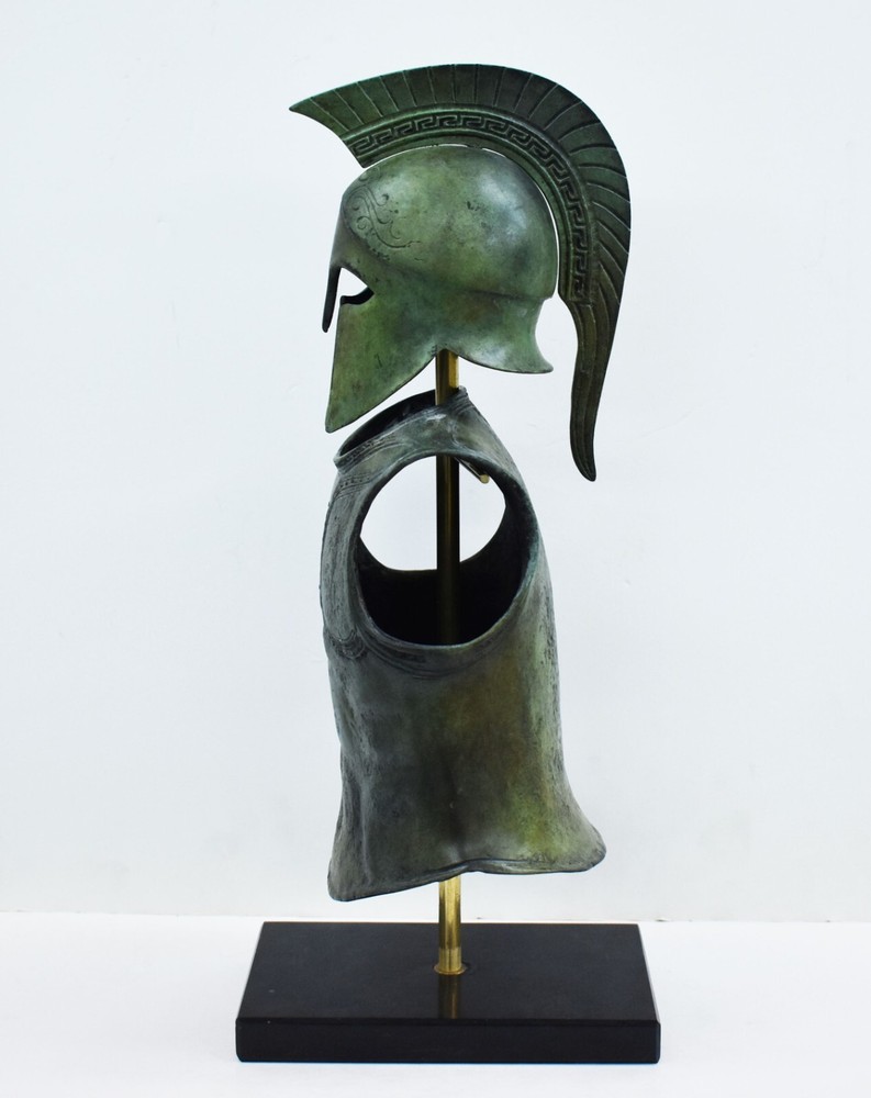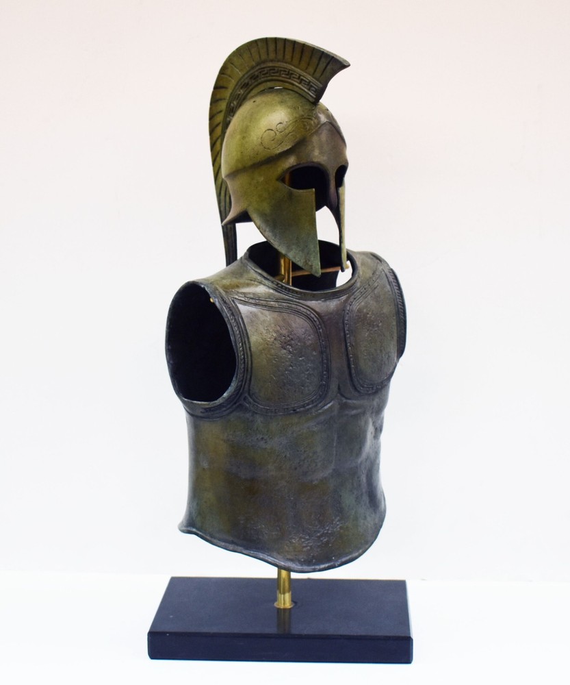 HOPLITE PURE BRONZE ARMOR HELMET SET This is a small size replica of an ancient Corinthian style armor and helmet set made with bronze material like the originals. A hoplite was the most common type of heavily armed foot-soldier in ancient Greece from the 7th to 4th centuries BCE, and most ordinary citizens of Greek city-states with sufficient means were expected to equip and make themselves available for the role when necessary. Hoplites were instrumental in Greek warfare and the victories of Greek armies over Persia at the battle of Marathon (490 BCE) and the battle of Plataea (479 BCE) during the Greco-Persian Wars. All our bronze items, are cast in Greece, using the traditional 'lost wax' method. As nothing is mass-produced, there will inevitably be slight variations in patination and colouring. Each piece is, therefore, unique.(56-504-A) Details: Condition: New, Handmade in Greece Material: Pure Bronze Total Height: 42 cm(16.5 inches) Width : 17 cm(6.7 inches) Length: 14 cm(5.5 inches) Weight of set : 5 kg Helmet Details: Height: 17 cm(6.7 inches) Width : 8 cm(3.1 inches) Length: 14 cm(5.5 inches) Panoply Details: Height: 21 cm(8.2 inches) Width : 17 cm(6.7 inches) Length: 12 cm(4.7 inches)
