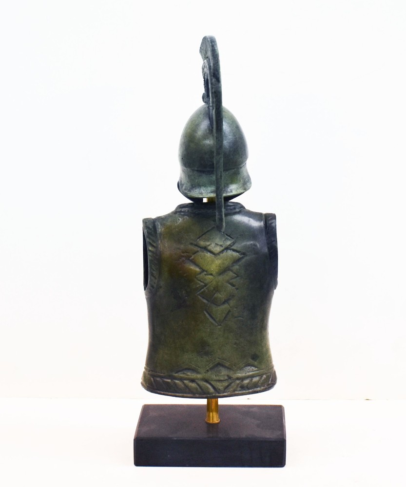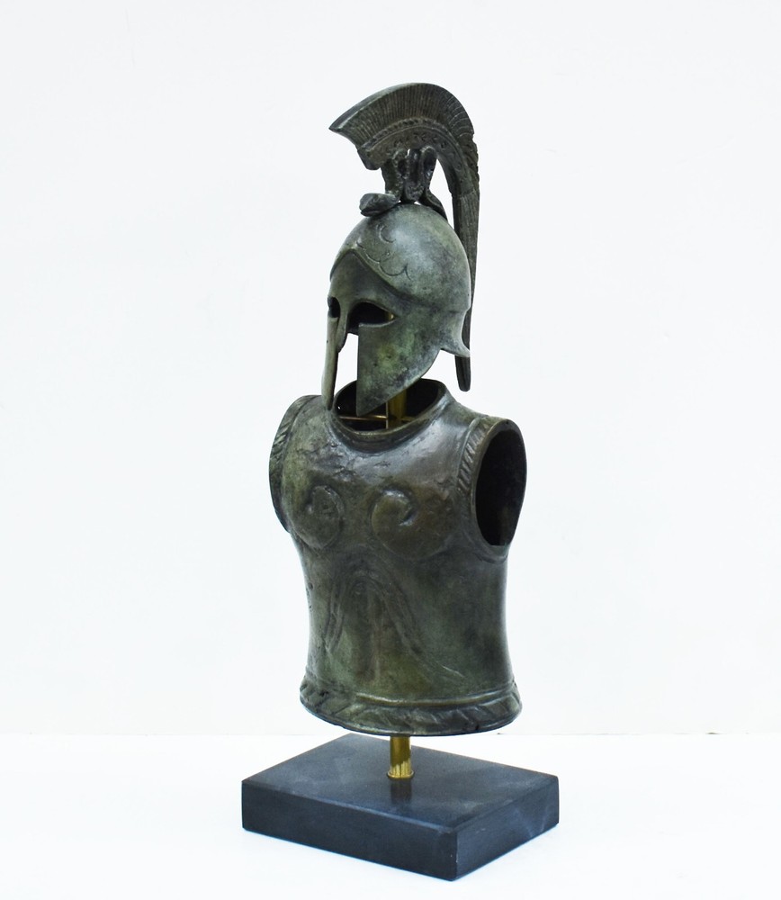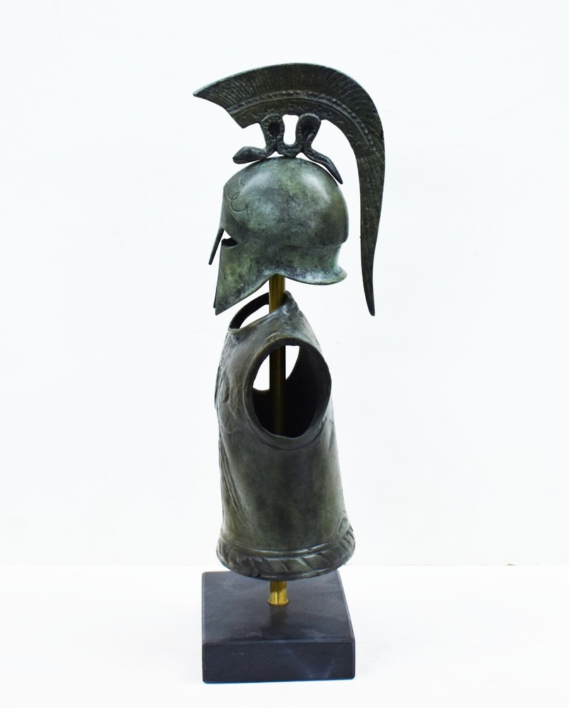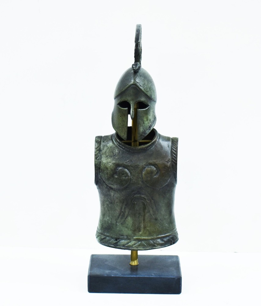HOPLITE BRONZE ARMOR HELMET SMALL SET This is a small size replica of an ancient Corinthian style armor and helmet set made with bronze material like the originals. A hoplite was the most common type of heavily armed foot-soldier in ancient Greece from the 7th to 4th centuries BCE, and most ordinary citizens of Greek city-states with sufficient means were expected to equip and make themselves available for the role when necessary. Hoplites were instrumental in Greek warfare and the victories of Greek armies over Persia at the battle of Marathon (490 BCE) and the battle of Plataea (479 BCE) during the Greco-Persian Wars. All our bronze items, are cast in Greece, using the traditional 'lost wax' method. As nothing is mass-produced, there will inevitably be slight variations in patination and colouring. Each piece is, therefore, unique.(56-507-A) Details: Condition: New, Handmade in Greece Material: Pure Bronze Total Height: 28 cm(11 inches) Width : 9 cm(3.5 inches) Length: 9 cm(3.5 inches) Weight of set : 1.6 kg Helmet Details: Height: 12 cm(4.7 inches) Width : 5 cm(2 inches) Length: 9 cm(3.5 inches) Panoply Details: Height: 13 cm(5.1 inches) Width : 9 cm(3.5 inches) Length: 8 cm(3.1 inches)