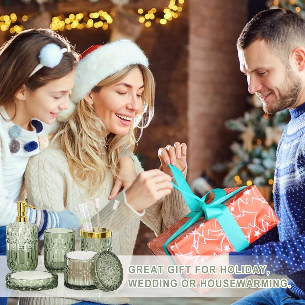 【WONDERFUL BATHROOM STORAGE SOLUTION】Do you want to an elegant and elevating storage solution for bathroom countertops? Our green bathroom accessories include a soap dispenser and toothbrush holder, soap dish, tumbler, and cotton swab jar, perfect for storing your toiletries or cosmetics, and keeping your bathroom counter fully organized and neatly . 【DURABLE HEAVY CUT GLASS】Unlike other fragile ceramic and inferior plastic bathroom accessories on the market, this set is made from high-quality glass material, which is sturdy and resistant to cracks and chips, even with daily use. It also has an easy-to-clean surface, making it simple to maintain and keep looking like new. 【STYLISH BATHROOM SET WITH UNIQUE DESIGN】This green bathroom decor features a unique design that is both stylish and functional. The green soap dispenser is suitable for hand soap, dish soap, conditioner, lotion, etc. The cotton swab jar comes with a lid that effectively prevents dust and water stains from entering, keeping cotton swabs, and cotton balls clean. The glass material and green color add a touch of sophistication to any bathroom decor. 【DECORATIONS FOR HOME OR BATHROOM】The bathroom set is versatile and can fit various styles from traditional to contemporary. It's suitable for modern, rustic, farmhouse and western styles, making it ideal for use in the bedroom, bathroom, kitchen decor, etc. It also can be a great christmas bathroom decor with green. 【ELEGANT GIFT SET FOR ANY OCCASION】This bathroom accessories set is not only a valuable addition to any home, but also a perfect gift for any occasion. It's an excellent choice for housewarming&new home gift, wedding gift, birthday gift, mother’s day gift, valentine’s day gift, Christmas gift, etc. 【PACKAGING UPGRADE&No BREAKING】Adopting high-quality pearl cotton internal packaging to reduce the risk of transportation breakage. Refuse to break the lid! PLEASE ATTENTION! After receiving the item, please open the packaging and check if the glass is broken. If so, please feel free to us and we will make it right immediately. Thanks for your patience. 【WARM TIPS】 Due to the strong or weak reflection of light in the bathroom, it may cause certain color differences in glass bathroom accessories. The brighter the light, the brighter the color of glass products. The weaker the light, the darker the color of the glass products.