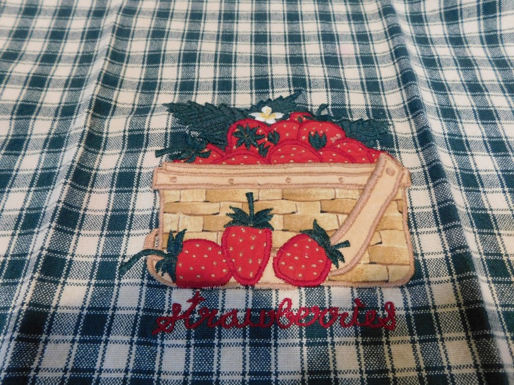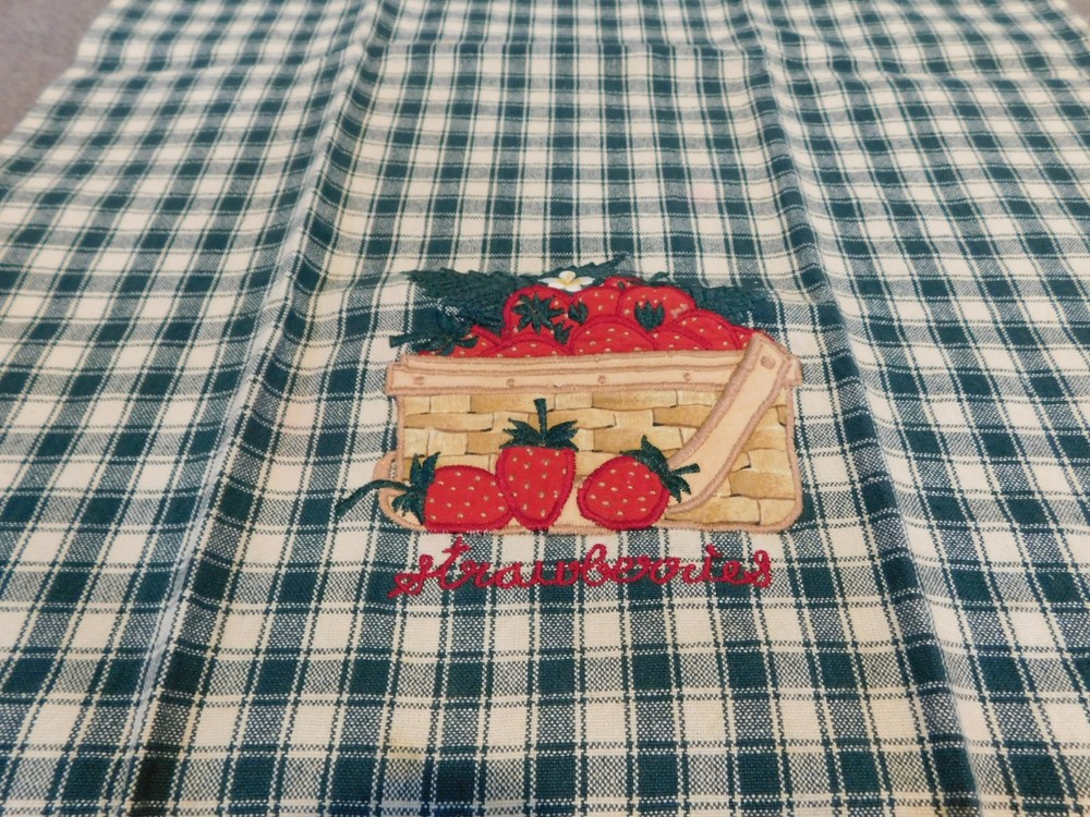 Green Check Dish Towel with Embroidered Strawberry Basket - Tagless