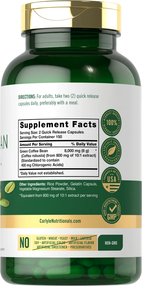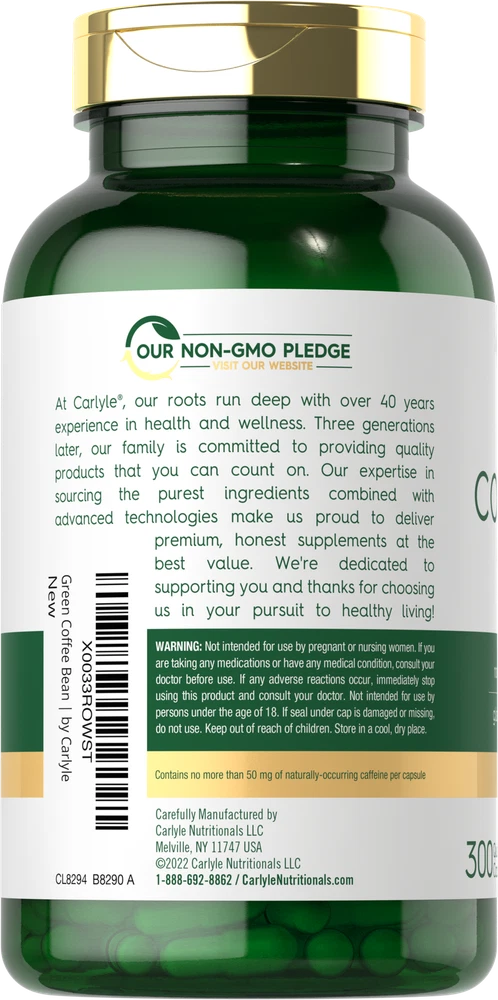 What is Green Coffee Bean? Did you know that your morning cup of coffee is way more than just a source of caffeine? The beans used to make coffee also provide a wide range of naturally occurring antioxidants. Green Coffee Bean (Coffea robusta) is a traditional herb that contains naturally occurring Chlorogenic Acid. Now there’s a way to receive the benefits of this amazing bean with Carlyle Green Coffee Bean. Green Coffee Bean Capsules: Carlyle Green Coffee Bean is a source of this traditional herb, supplying the equivalent of 8,000 mg of Green Coffee Bean per serving in quick-release capsules. Our formula is naturally gluten-free, non-GMO and preservative-free. It's the best way to receive the benefits of Green Coffee Bean on-the-go. Enjoy this herbal supplement and get exceptional value with our 300-capsule supply! Carlyle Green Coffee Bean — Rooted in Wellness: Our expertise in sourcing the purest ingredients combined with advanced technologies makes us proud to deliver premium, honest supplements at the best value. Carlyle Green Coffee Bean is a testament to our commitment to excellence, made with powerful ingredients rooted in wellness. Thanks for choosing us in your pursuit of living healthy. WARNING: Not intended for use by pregnant or nursing women. If you are taking any medications or have any medical condition, consult your doctor before use. If any adverse reactions occur, immediately stop using this product and consult your doctor. Not intended for use by persons under the age of 18. If seal under cap is damaged or missing, do not use. Keep out of reach of children. Store in a cool, dry place.