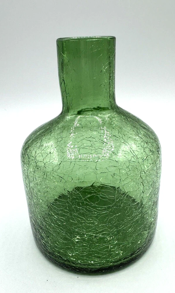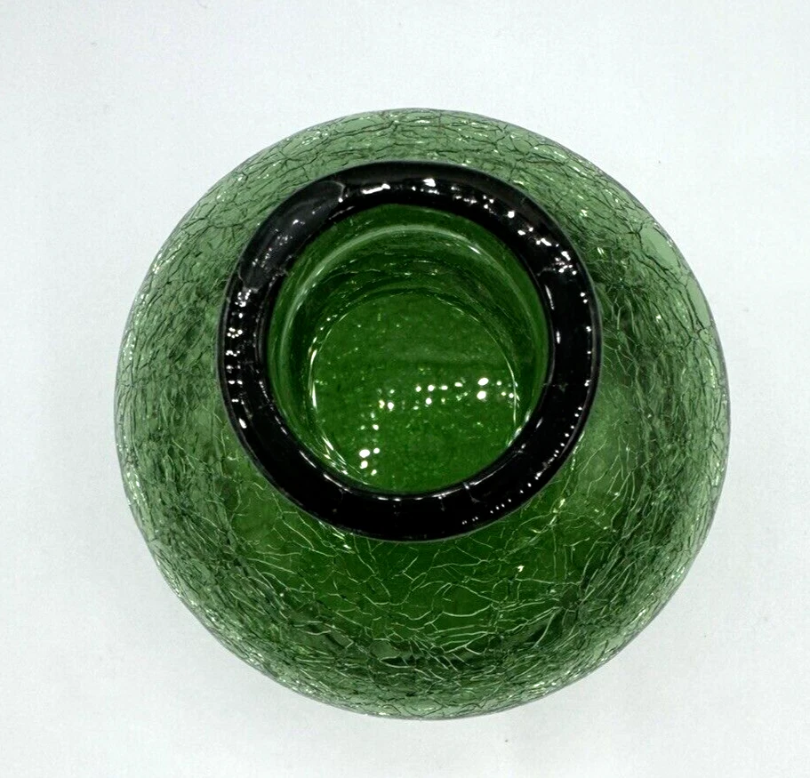 Green Crackle Art Glass Bud Flower Vase 6" tall, 4" wide mouth of bottle is 1.5" across no chips or cracks