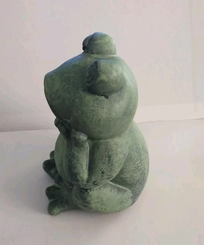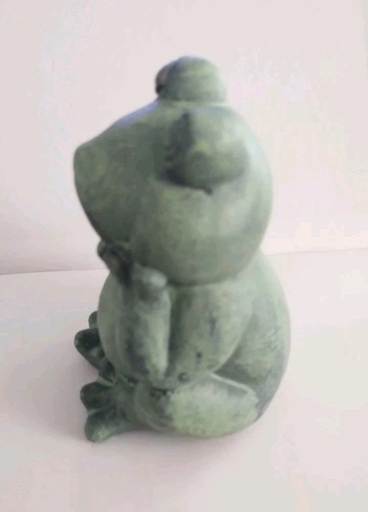 The product is a small green frog-shaped garden gnome made of resin or ceramic. It is suitable for indoor and outdoor use, featuring a modern style and weatherproof design. This cute ornament can be placed in a porch, flower bed, or lawn to add a touch of charm to the garden or home decor.
