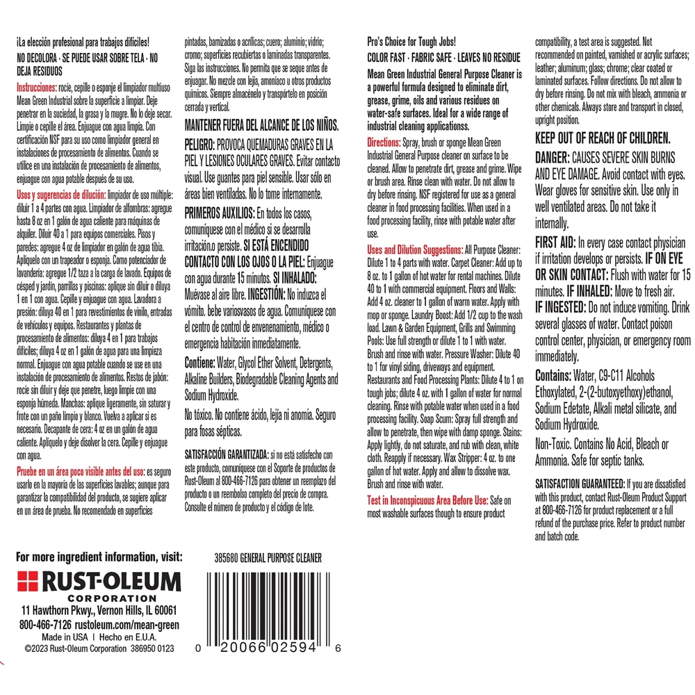 Mean Green Industrial General Purpose Cleaner Spray- 3385680, Gallon: Is a powerful formula designed to eliminate dirt, grease, grim oils and other various residues on water safe surfaces. for a wide range of cleaning apply applications. This product is also NSF register for use as a general cleaner in food processing facilities. Non-Toxic, contains no acid, bleach or ammonia. On Jan 14, 2025 at 19:58:55 PST, seller added the following information: