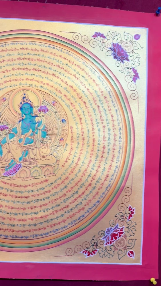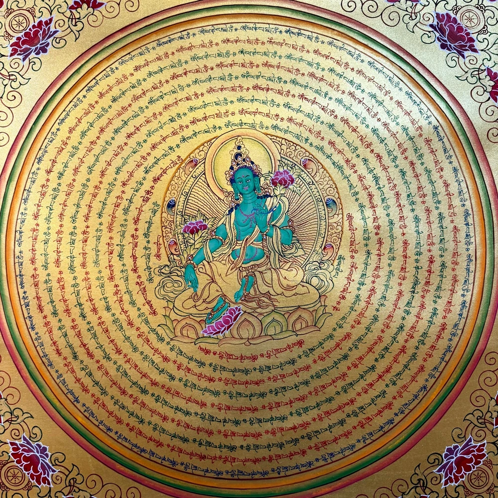 Namaste and Welcome to my Gallery!!! All of the paintings and arts in my gallery are originally handmade and hand-painted by my family members and other local artists who have been practicing their craft for over two decades. My father is Master Artists Nepal with an experience of more than four decades; you can see some of his work in this Gallery. Also you can see some of the beautiful and soulful artwork of talented local artists from Himalayas. ~~Green Tara Mantra Mandala~~ Green Tara is specially known for her power to overcome the most difficult situation, giving protection against danger and all kinds of fear. Her green color body is that of the active Enlightenment of Feminine Compassion and indicates that the Tara is always willing and ready to help. A mandala is a spiritual and ritual symbol in Asian cultures. It can be understood in two different ways: externally as a visual representation of the universe or internally as a guide for several practices that take place in many Asian traditions, including meditation. In Hinduism and Buddhism, the belief is that by entering the mandala and proceeding towards its center, you are guided through the cosmic process of transforming the universe from one of suffering into one of joy and happiness. [Size = 55cm x 55cm] Material Used: • Cotton Canvas • Natural Pigments and colors • Gold leaf ~Excellent for meditation or home/office decor, ~Tibetan Yoga Wall Art ~Genuine 100% hand-painted from Himalayas Please feel free to contact me if you have any question regarding the painting.