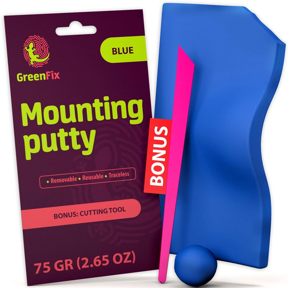 Keep collectibles, figurines and fragile items in place, attach home decor, enjoy crafting - all this is possible with GreenFix adhesive putty! What are the advantages of our sticky putty? PREMIUM QUALITY: GreenFix blue sticky tack is made using the best non-toxic materials on the market meeting the highest standards of quality and completely safe to use. TRACELESS REMOVAL: forget about sticky residues. Our mounting putty can be removed easily without leaving any oil marks or damage, leaving the surfaces intact. REUSABLE: tacky putty is endlessly reusable, providing you with an eco-friendly alternative to traditional tapes and adhesives. Simply remove, reshape, and reuse as needed. Rest assured wall putty is as sticky as it was before! SECURE VALUABLES: use putty to display figurines, collectibles, secure fragile items and prevent them from falling. Great as mounting squares, picture hangers, hanging strips, poster putty, earthquake putty, sticky dots or double sided tape. In our set of Blue Tacky Adhesive Putty except the ticky tack, you receive a cutting tool as a FREE BONUS to help you remove the right amount of putty for your purpose! How to use blue tack putty? - remove needed amount of putty; - knead sticky tack in your palm to make it soft; - paste a piece of adhesive to your item; - attach the item to surface pressing it firmly. In just these few simple steps you are finished! Getting GreenFix Blue Removable Mounting Putty set we guarantee the ⭐ ️ BEST QUALITY and 💯% RESULT! Save yourself some time and trouble! ✅ PREMIUM QUALITY: GreenFix sticky tack set is made from high quality non-toxic materials and includes 2.65oz (75g) blue tack putty. ✅ REMOVABLE & REUSABLE: mounting putty can be easily removed leaving no marks or residue! After removal, you can give poster tack a second chance to live and reuse it. ❇️ SECURE VALUABLES: use museum sticky tack putty to attach collectibles & figurines, secure decorations & fragile items in a neat, safe and non-intrusive way. Wall putty is a perfect alternative to picture hangers, poster tape, sticky dots, earthquake putty. hanging strips, hooks or nails! ❇️ SUITABLE SURFACES: blue tacky adhesive putty is applicable to most smooth surfaces such as metal, plastic, glass, wood, tile, etc. For the best result make sure the surface is clean and do not paste on wet, greasy, patchy surfaces, freshly painted walls or wallpaper. 🎁 FREE BONUS included in the removable poster tacky putty set for convenient use! Find the cutting tool in the box to help you remove the right amount of putty for your purpose avoiding mess.