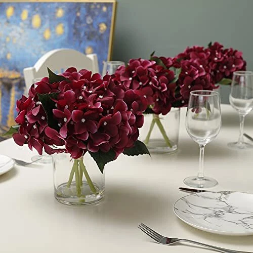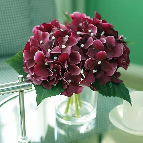 Return Policy Fast Delivery Trusted seller GreenHouzz Artificial Flowers in Clear Glass Vase with Faux Water Silk Hydrangea Arrangement Centerpiece Decorations for Home Wedding Office Table (Burgundy) Product Description Beautiful and Elegant: This Hand crafted hydrangea arrangement with 4pcs silk hydrangeas offers a boost of botanical beauty without any upkeep. Set within a cylindrical clear glass vase with acrylic water. It literally looks like real flowers in water. Natural-looking: This artificial hydrangea silk flower and leave are made of soft silk material, and the stems are iron wire wrapped with durable plastic to mimic the look of hydrangea. This clear glass cylinder vases are crafted of high quality, blemish-free, crystal clear glass to maximize content visibility. Each cylinder features thick glass walls and weighted base to ensure durability. Multi-use: The hydrangea centerpieces are the perfect size for weddings, bridal showers, baby showers, dining table, living room, kitchen and office décor, bathroom decoration, mantel, counter, desk, side table or console. Adds a nice touch to any space. No maintenance or water required. Looks full and fresh every day, wipe clean with a soft dry cloth. Overall Product Dimensions: 10 In. W x 10 In. D x 10 In. H; Planter/Vase Dimensions: 4.3 In. W x 4.7 In H. Pedals and leaves could be squished on arrival due to longtime transition. Please use a hair dryer to fluff up the product to make it to its best shape. Shipping Returns Payment Shipping Shipping is FREE to all addresses other than APO/PO boxes in the lower 48 states. All our stock ships from US-based warehouses. Shipped via USPS or UPS (depending on location and package weight) Unless stated otherwise, all orders will ship within 24-72 hours of your payment being processed. Check our feedback to see the great reviews of FAST shipping we offer. Returns Seller does not accept returns Payment We currently accept payment via eBay managed payments only. Once payment is cleared, we will dispatch your shipment within 1-3 business days. Please refer to the "Shipping" tab for more information regarding shipping speed to your destination.