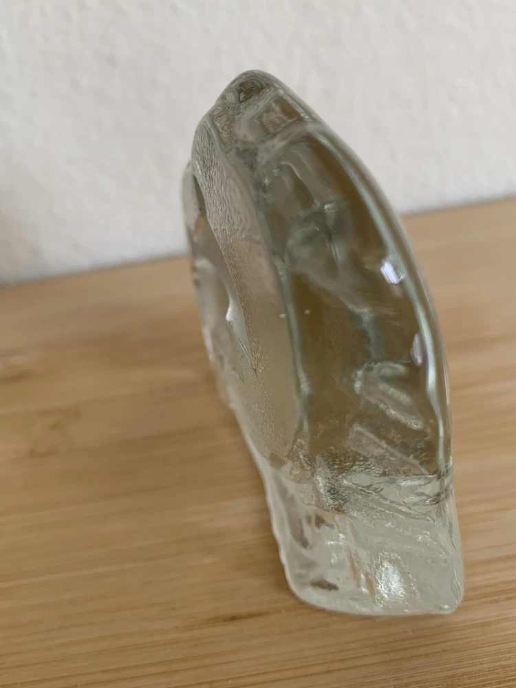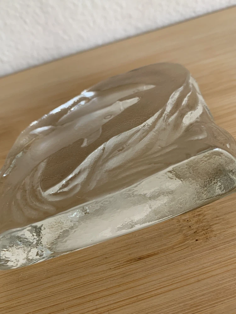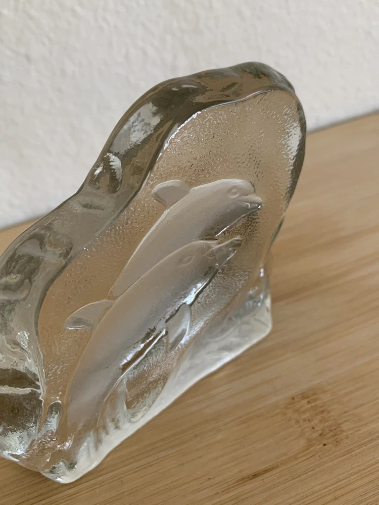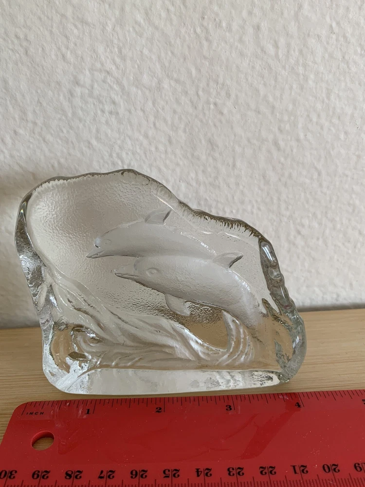 Greenbrier International Art Glass Clear Swimming Dolphins Pressed Etched Paperweight....
