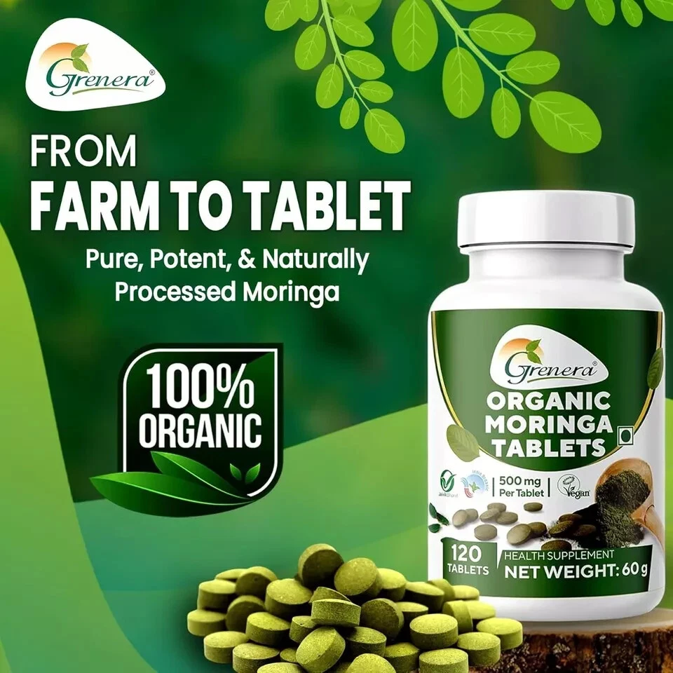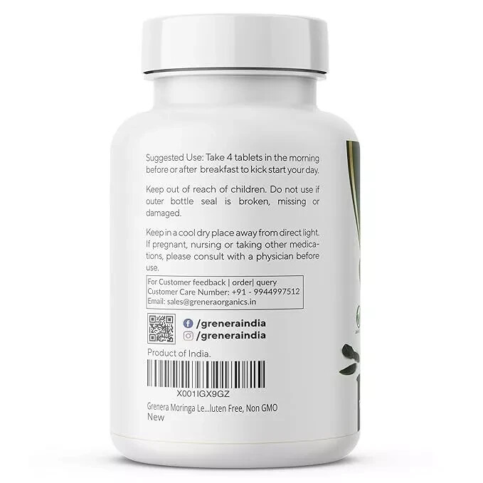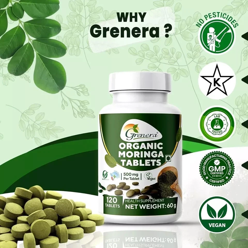 From the brand EXPLORE GRENERA PRODUCTS > Previous page Grenera Nutrients is a company that produces and sells organic super-foods, herbal extracts, and nutritional supplements. Our product line includes moringa, turmeric, amla, ashwagandha, triphala, wheatgrass, spirulina, and other superfoods, as well as herbal extracts such as ashwagandha and turmeric. Our factory operates in adherence to ISO 22000 standards, GMP standards. Guaranteed high quality ingredients delivered to our customers on time. How we get our start? Founded in the year 2010 Grenera Nutrients is the largest vertically integrated manufacturer of Moringa products globally. We pride our self on using only the highest quality, organic ingredients. What makes our products unique? Grenera’s strategy is being focused on providing nutritious, and sustainable products that support the well-being of consumers. Why we love what we do? At Grenera, we believe organic farming is the catalyst for a truly sustainable. We use third-party audits and verification for ensuring that our company’s standards. Next page Product Description ORGANIC MORINGA TABLETS - 120 TABLETS / BOTTLE (500mg PER TABLETS) ORGANIC CERTIFIED MORINGA TABLETS Grenera is a pioneer in manufacturing organic supplement products. Grenera's moringa tablets are certified organic. Moringa is a superfood that means all the parts of the tree are rich in nutrients. We source organic moringa leaves from our own certified organic moringa farms. These leaves are dried in a very hygienic method and we ground the moringa leaves. Each bottle consists of 120 moringa tablets and the weight of each tablet is 500mg. Every bottle is packed in a very hygienic way and properly sealed. We also have a shrink wrap over the bottle which indicates that the bottle is not opened yet. You can check the batch number, manufactured date, expiry date at the bottom of the bottle. CERTIFIED ORGANIC MORINGA TABLETS Moringa leaves have been consumed by the Asian people for millennia. People may add these leaves in their salads and curries. In the modern world everyone would not be able to have the moringa leaves. So Grenera wants everyone to get the benefits of Moringa by launching Organic Moringa Tablets.