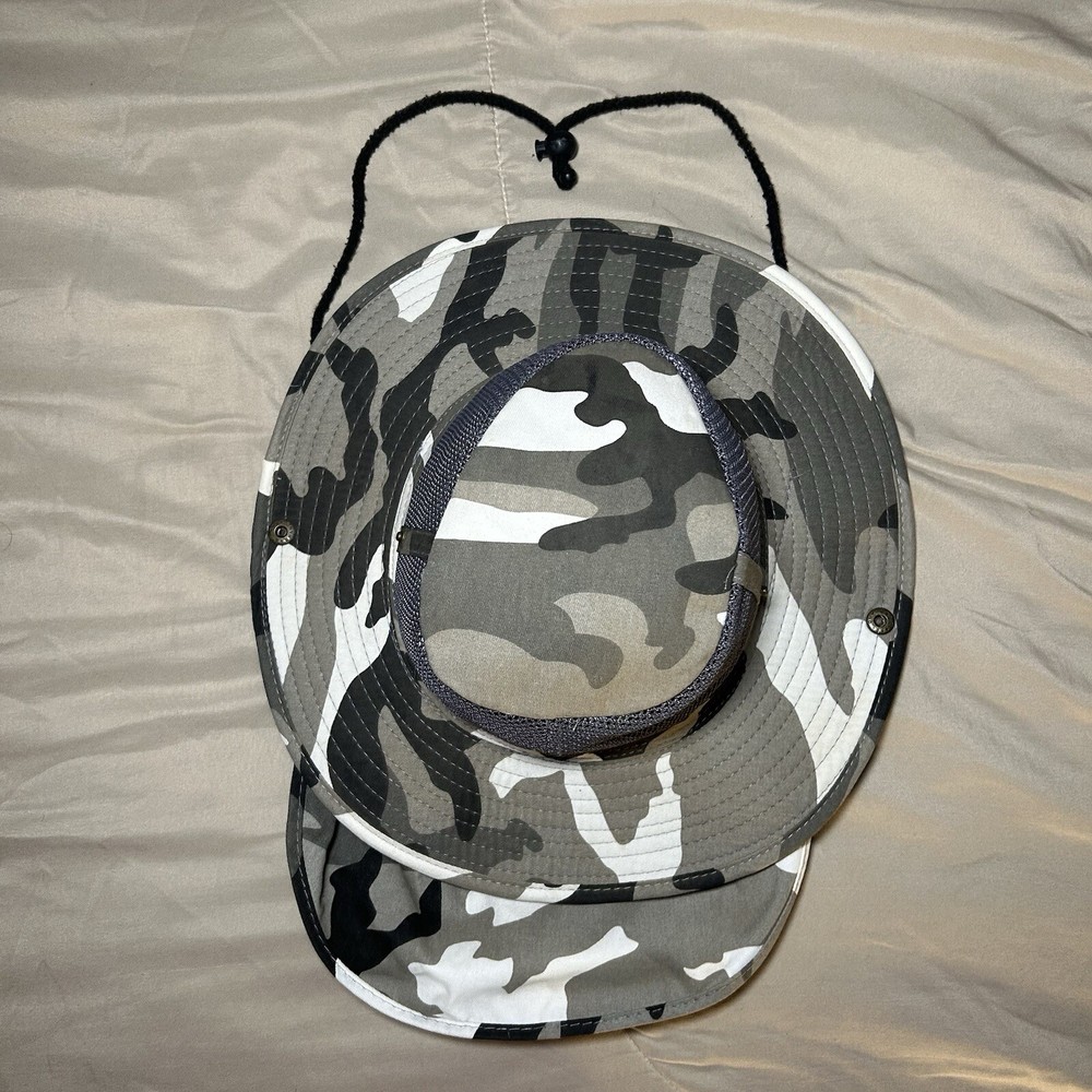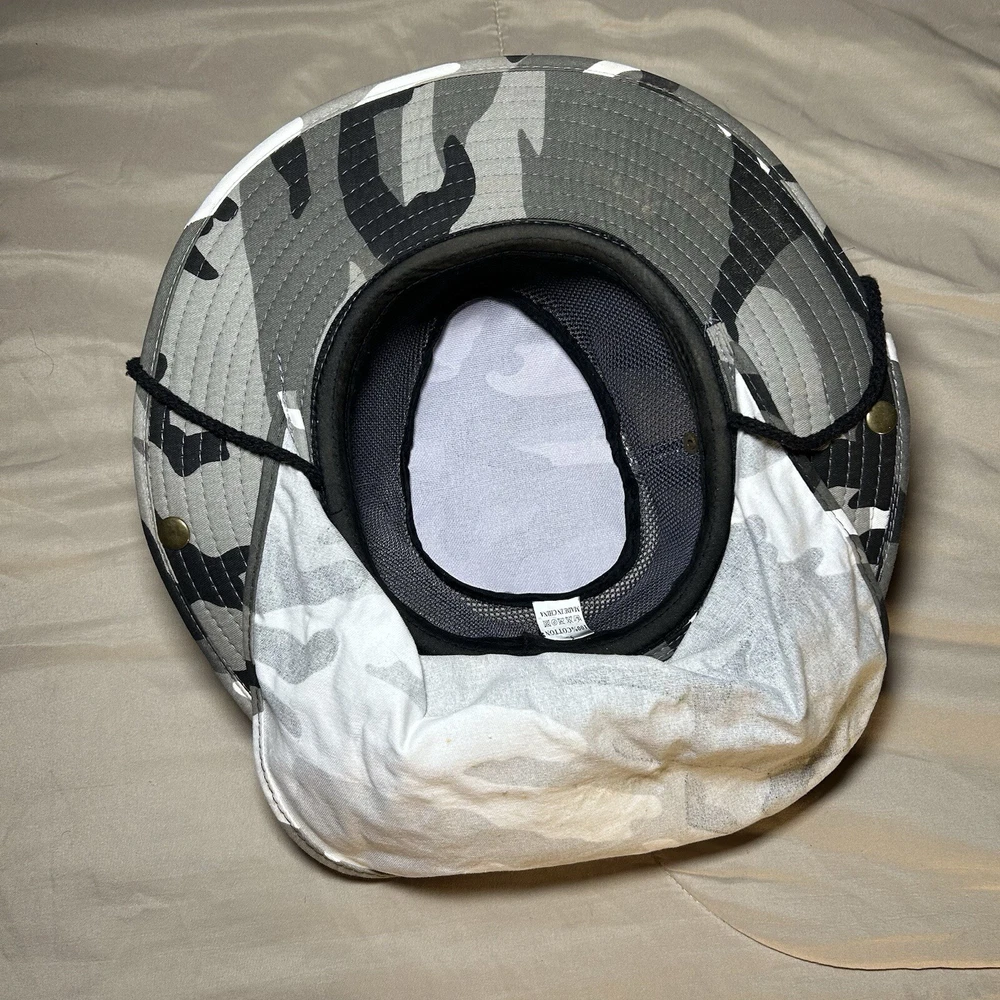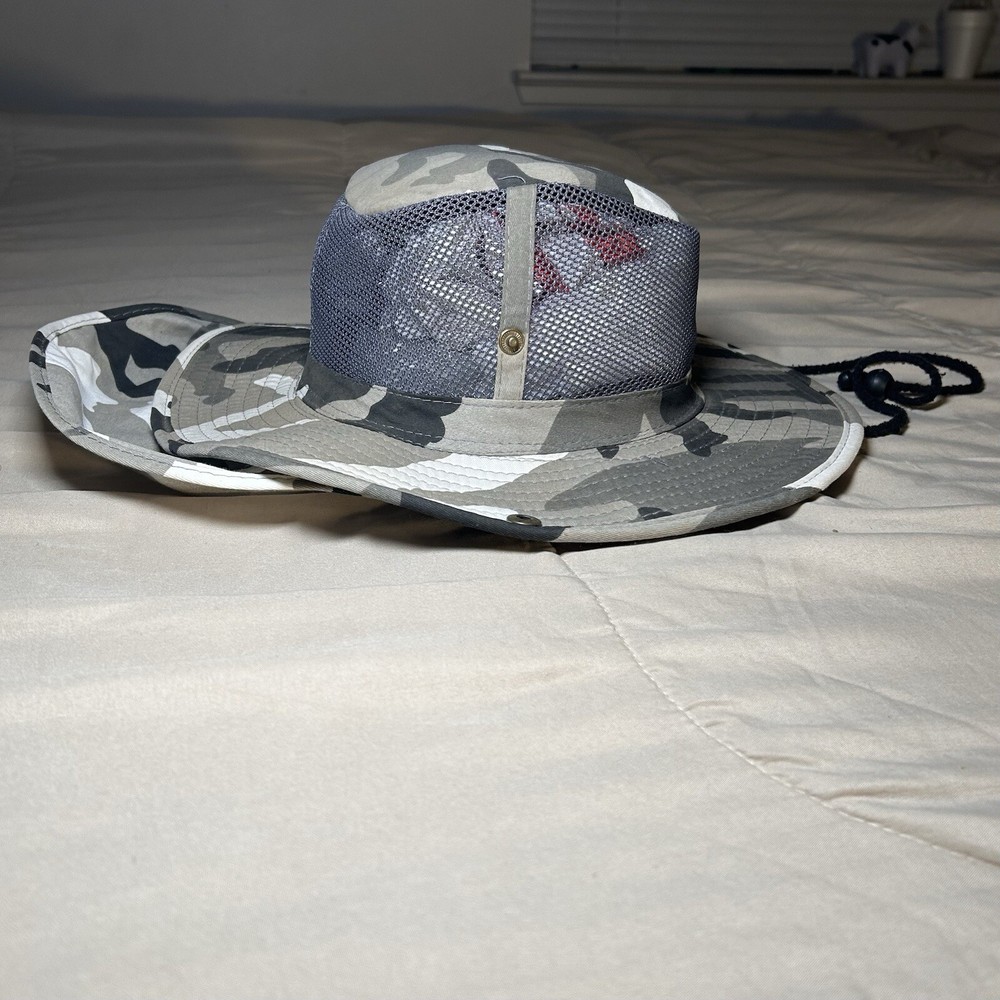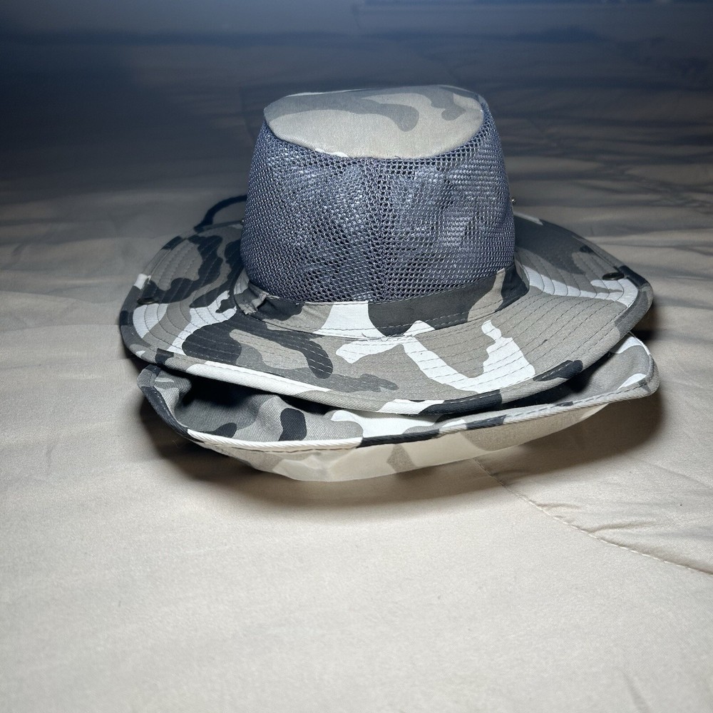 This Grey Camouflage Camo Hunting Fishing Adult Large Hot Weather Bucket Hat cap by Sunsations is perfect for any outdoor enthusiast. The hat is made of lightweight cotton canvas material, making it breathable and comfortable to wear in the summer, spring, or fall seasons. The wide brim and adjustable strap provide additional protection from the sun and heat. The bucket hat features a camouflage pattern, making it a stylish addition to any casual or workwear outfit. It is perfect for hunting, fishing, or any other outdoor activity. The hat is not signed or personalized and is made in China. Get ready to explore the great outdoors with this practical and stylish bucket hat!