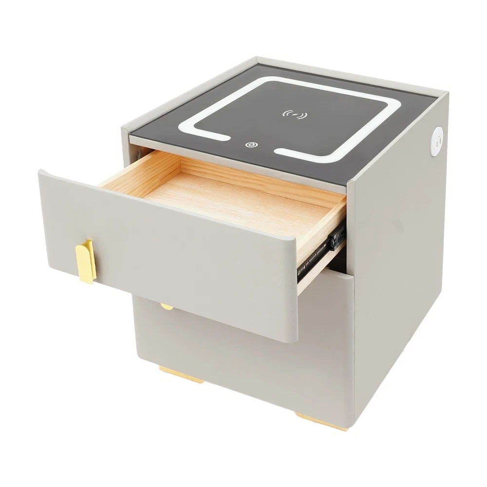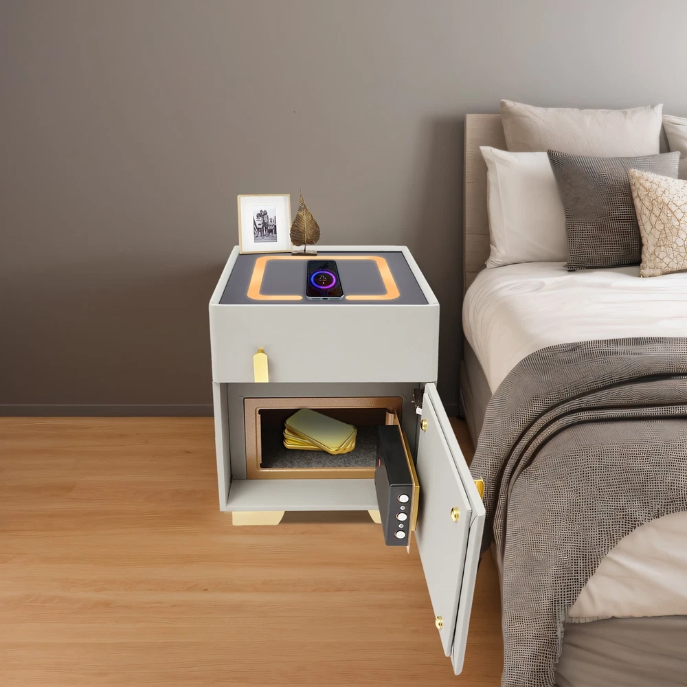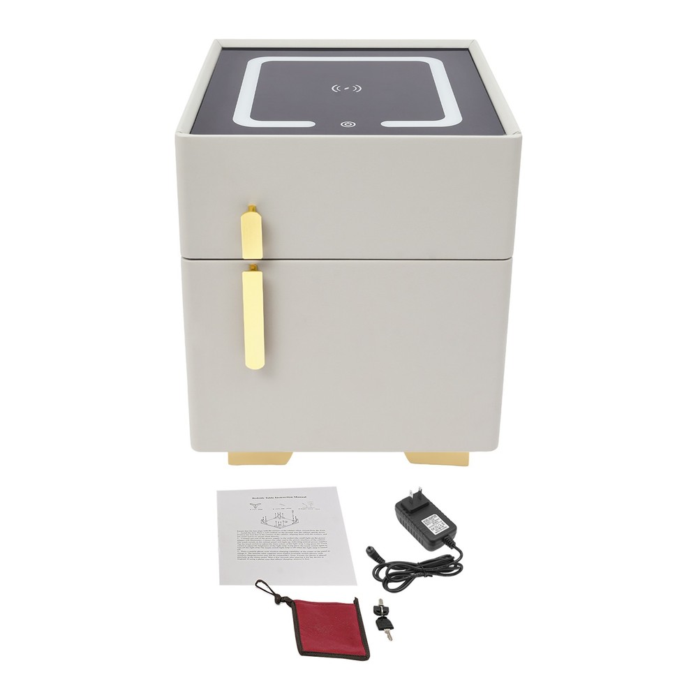 Description This bedside cabinet is not only sturdy and durable but also thoughtfully designed and powerful. The safe design and drawer make it easy for you to store your important items, and the advanced electronic combination locking device supports customized password settings for easy operation and high security. It also integrates charging ports, and Bluetooth speakers, allowing you to say goodbye to extra power strips and reserved space for the speaker. With this product, you can create a neat and cozy bedroom environment. Key Features Sturdy and Durable : Premium tempered glass, pine wood, microfibre, metal, and density board make this product wear-resistant, corrosion-resistant, impact-resistant, and not easy to deform, so it can maintain aesthetics and practicality for a long time. Dual Charging Methods : You can charge your mobile phone by placing it in the corresponding area, getting rid of the bondage and solving the trouble of finding the charging cable. For mobile phones that do not support wireless charging, you can charge them through the USB interfaces with your USB cable. Storage Assistant: The drawer and safe design provide ample space for sorting and storing various items such as documents, cosmetics, and jewelry(all are not included), creating a neat and organized environment. High Security : The password and keys allow you to choose one to unlock the safe according to your actual situation, greatly enhancing the convenience of use. The customizable personal password and triple locking bolts provide extremely high anti-theft performance, ensuring that your valuable items are well protected. Smart Life: The Bluetooth audio allows you to quickly connect your phone's Bluetooth within a 32.81ft range, making it easy to play and transfer music, providing a more relaxed and comfortable listening experience, and creating your private theater. Heavy Duty Design: The heavyweight (37.48lbs) and sturdy screw-fixing design, and heavy-duty feet make it hard to move and carry, preventing theft from easily carrying the whole box. Elegant and Modern: It adopts a classic grey color appearance that can match most decorating styles and color themes, adding elegance and refinement to your bedroom and enhancing the overall style of the space. Ideal Gift : Beautiful appearance and practical function make it can be a housewarming gift for friends. Good Customer Service: We stand behind all our guests and look forward to assisting you with your purchase. It is our pleasure to answer your confusion and questions. The end of the story between us is not "we sell and you buy". Details 3-colour Ambient Light: It lights up with a gentle touch and can be adjusted to white, warm, or neutral so that you can wake up at night without fear of darkness. Practical Handles : They provide a comfortable and safe touch, making it easy for you to push and pull the drawer and door. Raised Edges: They can prevent phones or other items from accidentally falling off, ensuring safe use. Application The product is suitable for offices, homes, and other places for storing all kinds of valuables such as jewelry, documents, passports, and money. Specifications Material: Tempered Glass, Pine Wood, Microfibre, Metal, Density Board Color: Grey Style: Modern Shape: Rectangular Mount Type: Floor Standing Assembly Required: No Plug Type: US Standard Adapter Input: 100-240VAC 50/60HZ Adapter Output: 12V 3A Light Source: LED Light Color: White, Warm, Neutral Color Temperature: 6000K, 4500K, 3000K Unlocking Method: Password/Key Safe Box Battery Type: 4*AA Batteries Initial Password: 159b Bluetooth Connection Distance: 10m/32.81ft Product Size: 40*40*50cm/16*16*20in Package Size: 52*45*45cm/20.47*17.72*17.72in Gross Weight: 18kg/39.68lbs Net Weight: 17kg/37.48lbs Package Included 1*Bedside Cabinet 2*Keys 1* Adapter 1*English Manual 1*Chinese Guide 1*Key Storage Bag Notes Please confirm the installation dimensions before purchasing. Please read the user manual carefully and pay attention to the safety precautions before use. Please note that the USB plug is installed on one side only. Please be careful not to put the key into the safe. If you enter the wrong password 3 times in a row, you must wait 20 seconds and retry. If the wrong password is entered again 3 times, you must wait 5 minutes before retrying. If the battery is low, the red light located in the center of the panel will illuminate. Please allow the slight color difference caused by the shooting light and 1-3 cm error due to manual measurement, and make sure you do not mind before ordering. Payment Delivery details Terms of sales About us Contact us Payment We accept ebay payment 。 Fees such as import duties, taxes are not included in the item price or shipping costs. These charges are the buyer's responsibility. Delivery details Shipping: 2-9 working days to: USA Terms of sales We maintain high standards of excellence and strive for hundred percent customer satisfaction. Feedback is very important to us. We hope that you contact us immediately before you give neutral or negative feedback, so that we can address your concerns. It is impossible to address issues if we do not know about them! About us Your satis faction is our ultimate goal. We work hard to earn your trust and future business. Our certified technicians have tested each item before shipping. The unit comes with 1 year limited warranty on all manufacturing defects. a) If you receive a defective item, you may return it or ask for a discount. Please contact us within 14 days after you receive the package. b) What you returned must be intact and in its original packaging as re? u. Customer is responsible for shipping costs of the returned item. c) We will cover the cost of shipping back t with the shipping rate indicated in the registration page. We will send you a new unit or refund the full payment you paid. Thank you. Contact us Business Hour Business Hour: Monday To Friday: 8:30 AM to 5:00 PM (Beijing