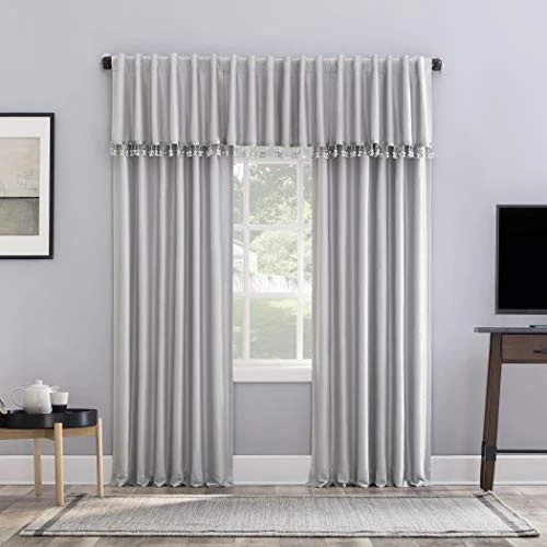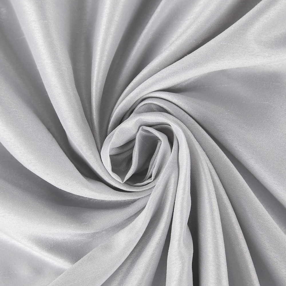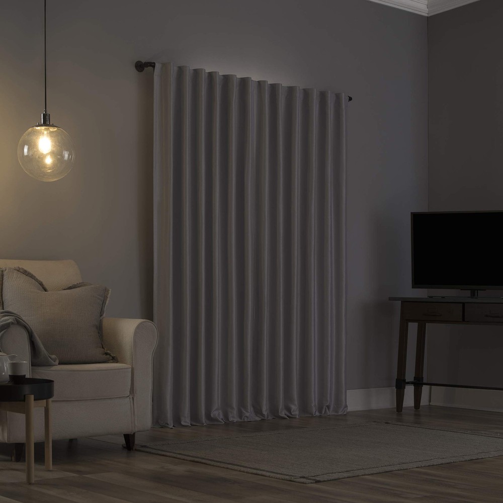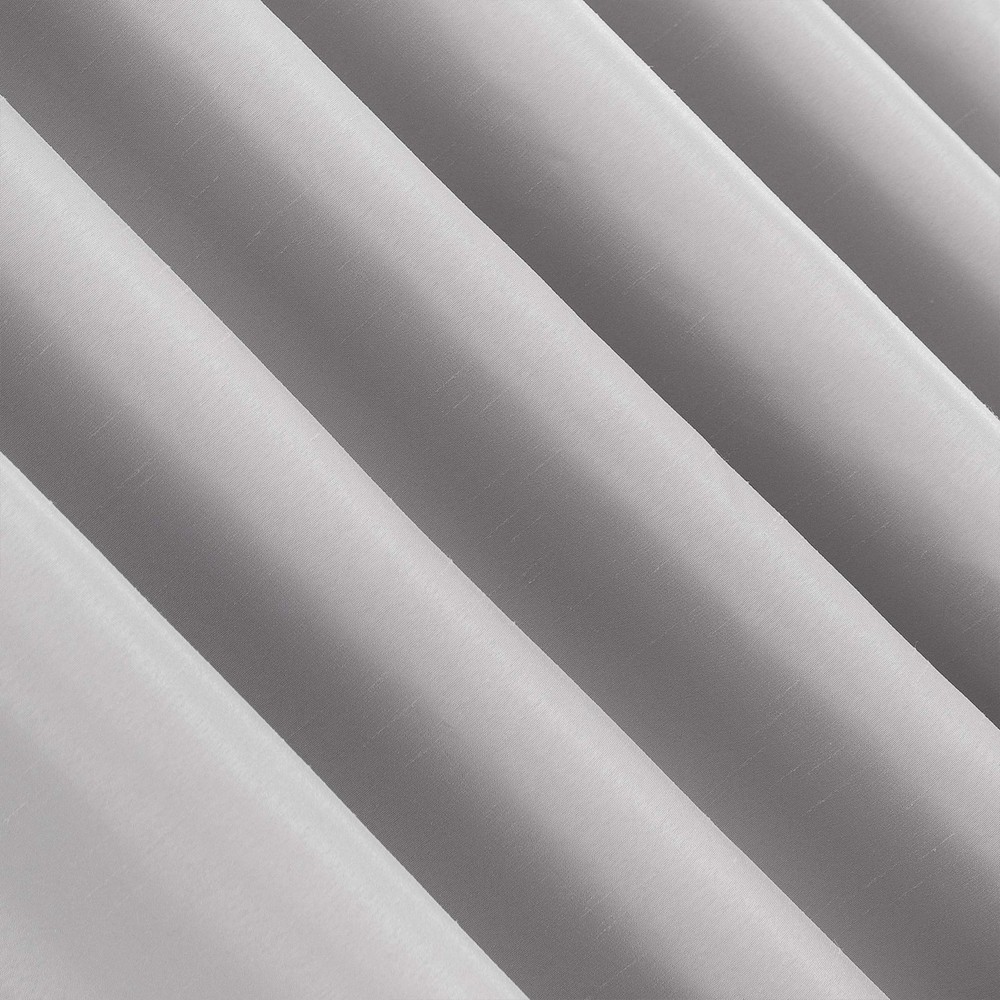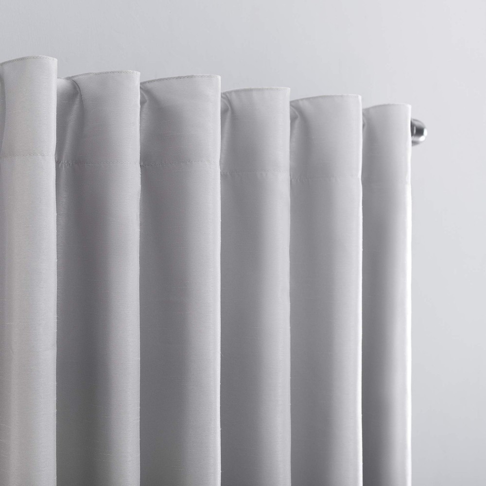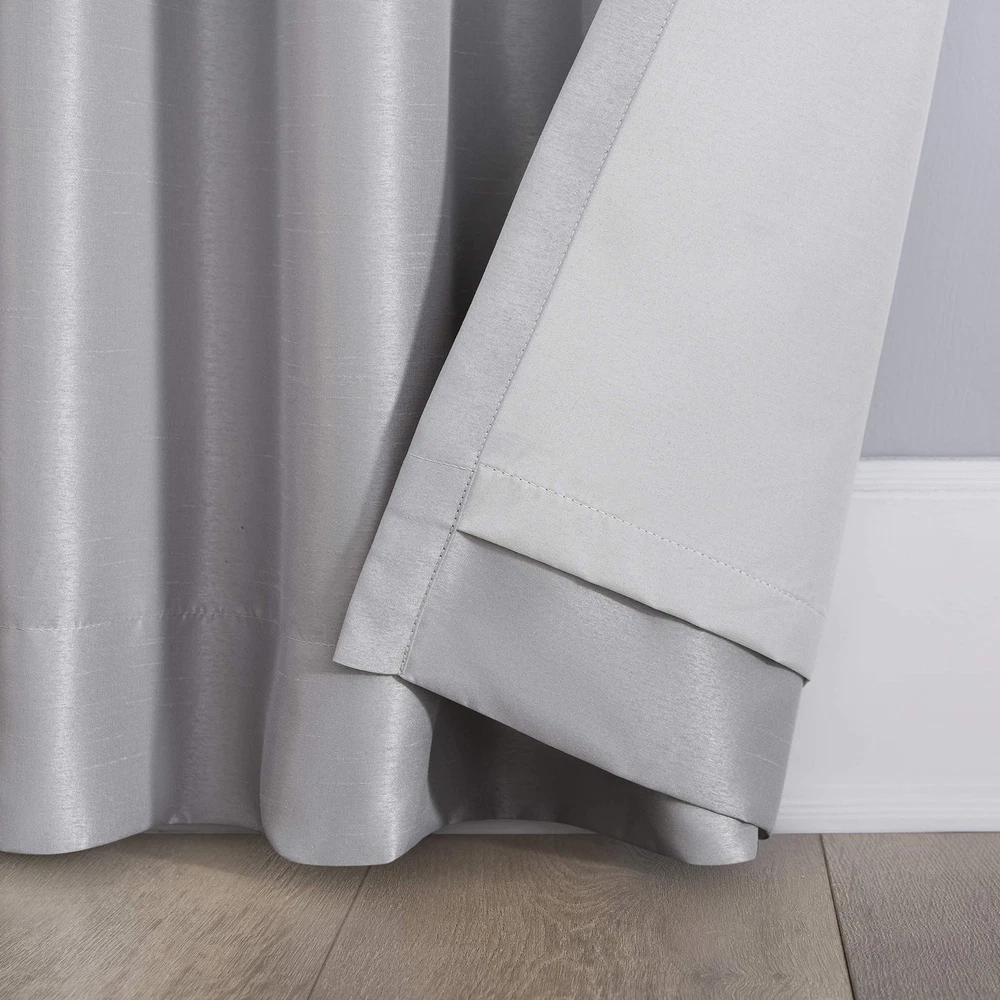 Featuring an elegant dupioni faux silk fabric with a raw slub texture, Greyson Faux Dupioni Silk Extreme 100% Blackout Back Tab Curtains provide the ultimate in light blocking technology to keep out even the harshest of light while adding opulent radiance to any room of your home. Extreme Blackout Thermal Lining is laboratory tested to block out 100% of light, reduce outside noise by up to 30%, and decrease energy lost through your windows by up to 40%. Comfort is optimized with thermal properties that help keep summer heat and winter chill out of your home. Built-in back tabs allow for easy slide-through installation on curtain rods up to 1.5" in diameter. Hang in your entertainment room to eliminate screen glare and reduce distracting outside noise, or in your bedroom for enhanced privacy and a sounder, more uninterrupted sleep. Sold as individual panels measuring 50" width by 84" length in color chrome gray. Measure carefully before selecting your desired size and quantity. Rod not included. Machine wash cold on gentle cycle. Use non-chlorine bleach when needed. Tumble dry on low heat, using a cool iron as needed. Elegant faux dupioni silk fabric with a raw slub texture imparts opulent radiance Extreme Blackout Thermal Lining blocks out 100% of outside light Energy Efficient design reduces energy lost through your windows by up to 40% Thermal properties help keep summer heat and winter chill out of your home Noise reduction by up to 30% helps you get a sounder, more uninterrupted sleep Back tabs fit curtain rods up to 1.5" in diameter