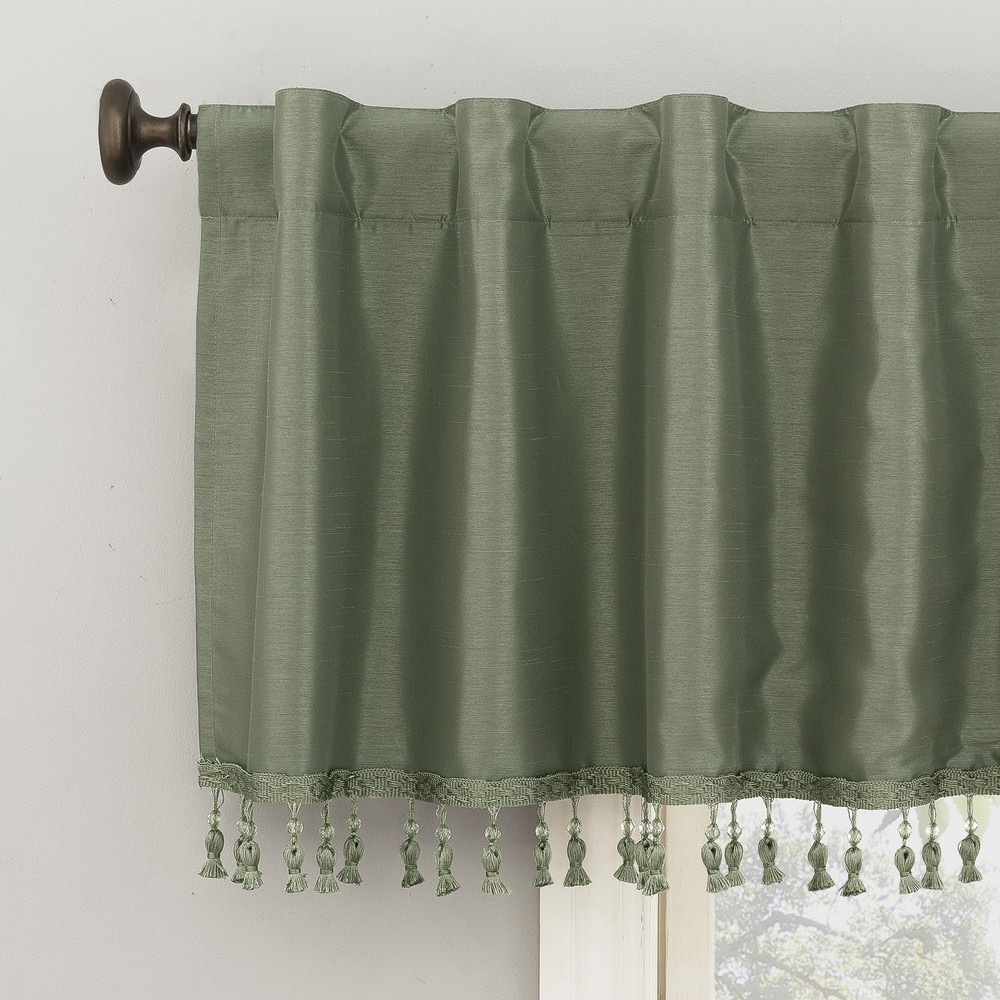 Featuring an elegant dupioni faux silk fabric with a raw slub texture, Greyson Faux Dupioni Silk Valances add a touch of glamour with ornately beaded tassels while providing the ultimate in light blocking technology to keep out even the harshest of light. Extreme Blackout Thermal Lining is laboratory tested to block out 100% of light where window is covered. Back tabs fit curtain rods up to 1.5" in diameter for easy slide-through installation. Hang with the matching Greyson Curtain on a double rod, or use as a standalone valance. Sold as individual valances measuring 50" width by 17" length in color moss green. Coordinating curtain panels are sold separately. Measure carefully before selecting your desired size and quantity. Rod not included. Machine wash cold on gentle cycle. Use non-chlorine bleach when needed. Tumble dry on low heat, using a cool iron as needed. Elegant faux dupioni silk valance with a raw slub texture imparts opulent radiance Tassels with ornate beaded detail add a touch of glamour Blocks out 100% of outside light where window is covered Coordinate with the matching curtains (sold separately) on a double rod, or use as a standalone valance Back tabs fit curtain rods up to 1.5" in diameter Valances sold individually (image features 2)