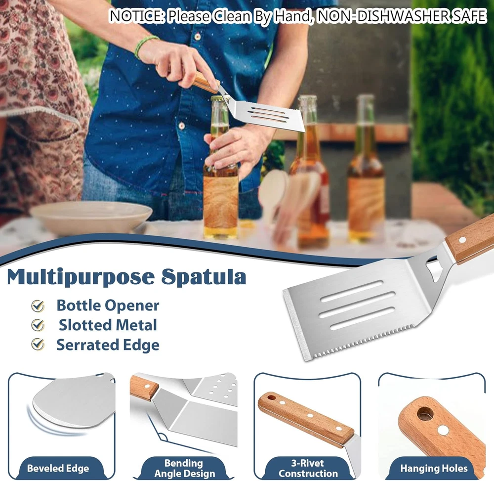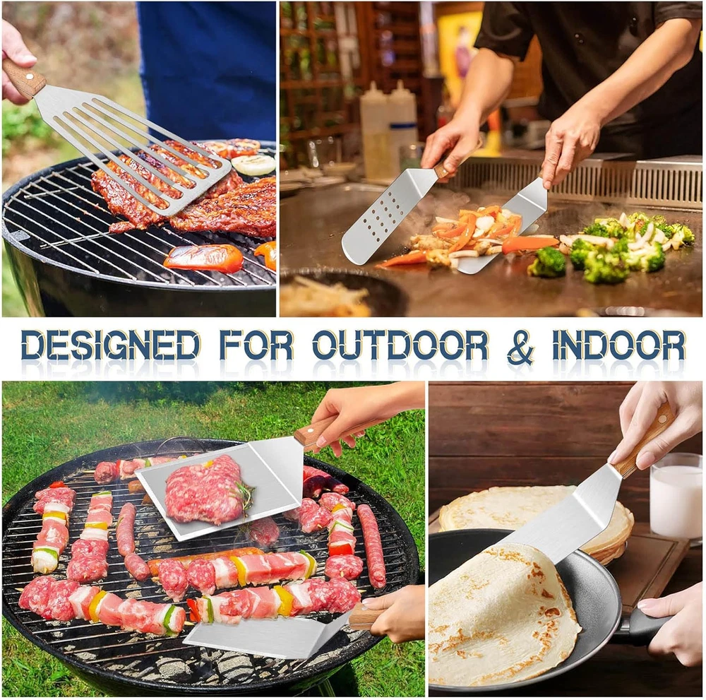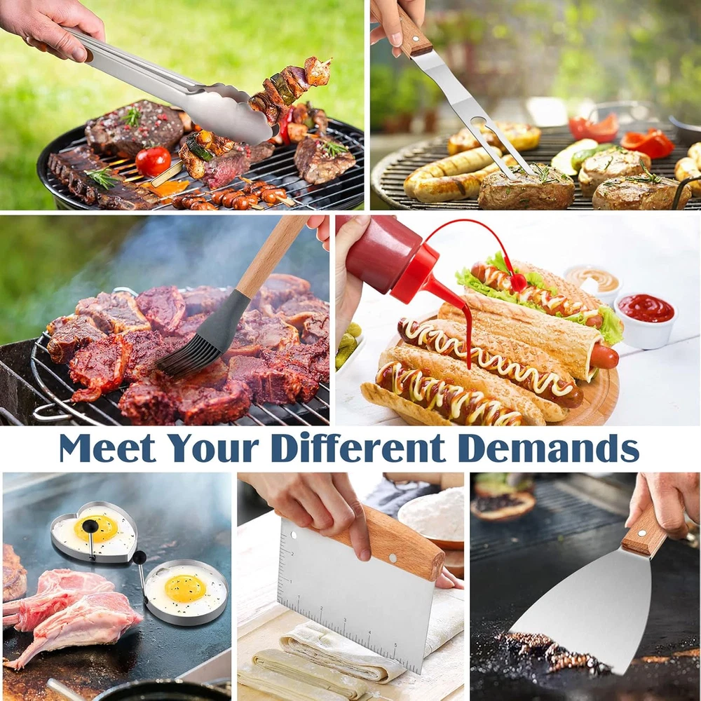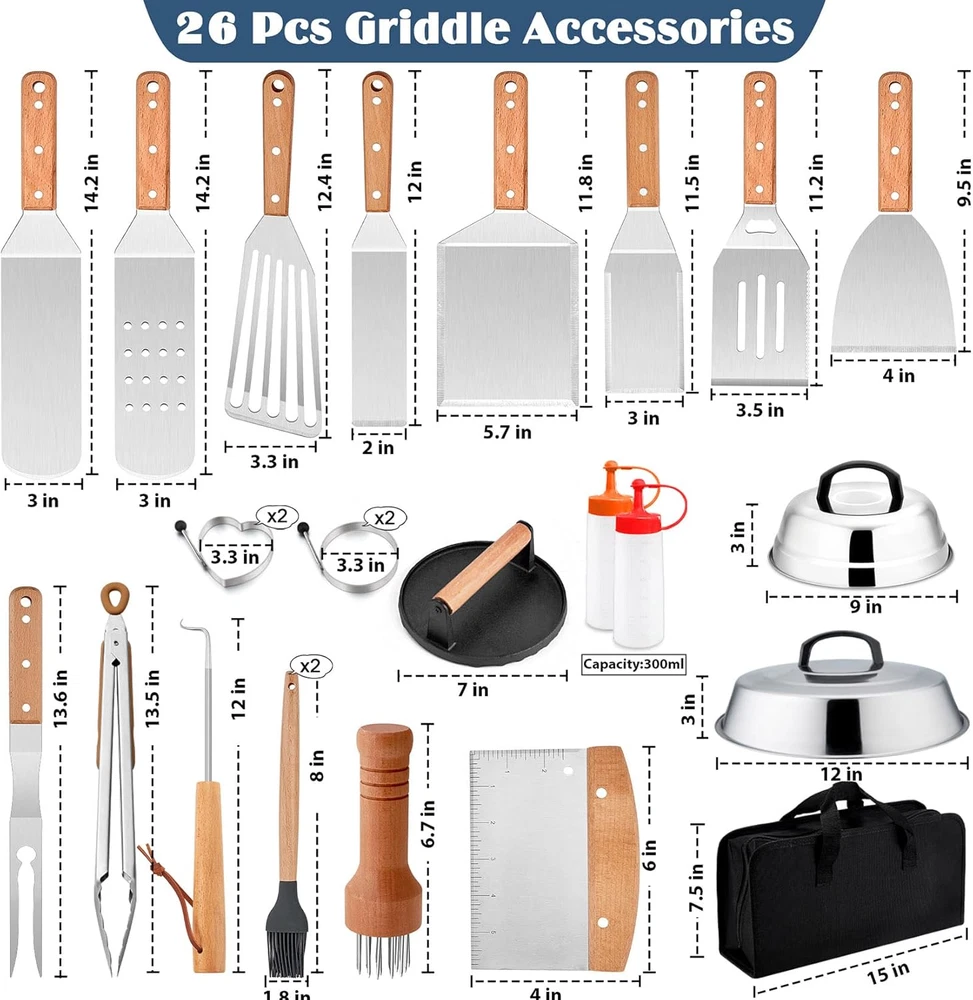 Griddle Accessories Kit BBQ Flattop Grill Tools Set for Outdoor Camping Cooking 【VALUE GRIDDLE SET】 Package Included: 2 x Melting Dome ( 12”, 9” ), Long Griddle Spatula, Perforated Spatula, Multipurpose spatula, Burger Turner, Fish Turner, Griddle Spatula, Slant Edge Scraper, Bench Scraper, Narrow Turner, Cast Iron Griddle Press, Pigtail Food Flipper ( Right Handed ), Kitchen Tong, Grill Fork, Meat Tenderizer, 2 x Basting Brushes, 2 x Squeeze Bottles, 4 x Egg Rings, Storage Bag, Screwdriver 【PREMIUM & HEAVY DUTY】Our Grill Tools Set is made of high quality stainless steel, Which is food grade and heavy gauge, No worry any toxic materials into food, 1.5mm thick metal ensures holding heavy food without bending, Matte polished finish makes cleaning easily for less hassle, BUT NON-DISHWASHER SAFE, Smooth wooden handle without rough spots, Keep your hands safe during use, 3-rivet construction increase the strength, Will not easy to fall off, Sturdy enough for long lasting use 【NECESSARY GRILL SPATULAS】 With 9 versatile spatulas, You will become the grill master on every BBQ party, Thin beveled edge sliding great under the food, 45° angled structure ensure a comfortable grip and help to flip food easily, Slotted design allows grease to drain for healthy diet, Holes on the handle are big enough to hang, Multi-Purpose Spatula has a serrated edge for cutting meat and also works as a bottle opener, Griddle Scraper with clear scale for precise measuring while using 【MELTING DOME & GRILL PRESS】 2Pcs Melting Dome help to avoid smells to be mixed together and reduce splatter, Retaining food moisture well to keep food juicy, Large cover is easy to deal with multiple steaks or large amount of vegetables, Small Lid is ideal for grilling patties or keeping food warm, Cast Iron Burger Press helps to retain and distribute heat perfectly, Pressing out excess fat or liquid from meats, Grooves texture will leave attractive grill marks on food 【THE EXTRA GRILLS TOOLS】 The Meat Flipper can pick up the foods without twisting, Won’t leave marks on the meats, Meat tenderizer has ultra-sharp needles, Help you quickly pierce the meat, Marinating it with condiments to taste more delicious, Grill Tong is strong enough to grip a large chunk of meat, Sharp Grill fork can grab meat while slicing meat, With a practical Carrying Bag, Convenient to take it anywhere Product Description Joyfair Griddle Accessories Kit is made of heavy duty stainless steel, allows these griddle tools maintaining a long service life. Suitable for most food, spatulas for flipping meat, sausages, cutting dough, basting cover for melting cheese, steaming vegetable, etc. 1 Melting Domes 2 More Details 3 Multipurpose 4 Easy to Use 1 Griddle Press 2 Pigtail Food Flipper 3 Meat Tenderizer 4 More Useful Tools Design for Outdoor & Indoor Material Type Wooden Handles Material Wooden Handles Country of Origin China Is Dishwasher Safe No Item Weight 10.3 pounds Handle Material Wood Number of Pieces 26 Package Dimensions 17.2 x 12.76 x 4.72 inches Included Components function(f) {var _np=(window.P._namespace("DetailPageProductOverviewTemplatesJava"));if(_np.guardFatal){_np.guardFatal(f)(_np);}else{f(_np);}}(function(P) { P.when('A').execute(function(A){ A.on('a:truncate:po-attribute-truncate-3:updated', function(data) { var isTruncated = !data.truncateInstance.getIfTextFits(); var seeMoreElement = document.getElementById('po-attribute-see-more-id-3'); if(seeMoreElement) { seeMoreElement.style.display = isTruncated ? '' : 'none'; } }) }); })); 2 x Melting Dome, Long Griddle Spatula, Perforated Spatula, Multipurpose spatula, Burger Turner, Fish Turner, Griddle Spatula, Slant Edge Scraper, Bench Scraper, Narrow Turner, Cast Iron Griddle Press, Pigtail Food Flipper ( Right Handed ), Kitchen Tong, Grill Fork, Meat Tenderizer, 2 x Basting Brushes, 2 x Squeeze Bottles, 4 x Egg Rings, Storage Bag, Screwdriver See more Shipping Fast shipping is very important for us. Our expedited US shipping service is FREE. Your order will be shipped within 2 business days upon full payment received. Your order will be delivered within 2-3 business days after the handling time. Warranty & Returns 30-Day FREE Return Policy offered for unsatisfactory items. Options include: Refund or Exchange for another item. Contact us Customer satisfaction is our top priority. If you encounter any issues with our product, please don't hesitate to reach out to us. We are committed to ensuring your satisfaction and will go above and beyond to assist you. Your happiness is our goal! Thank you for shopping at our store.