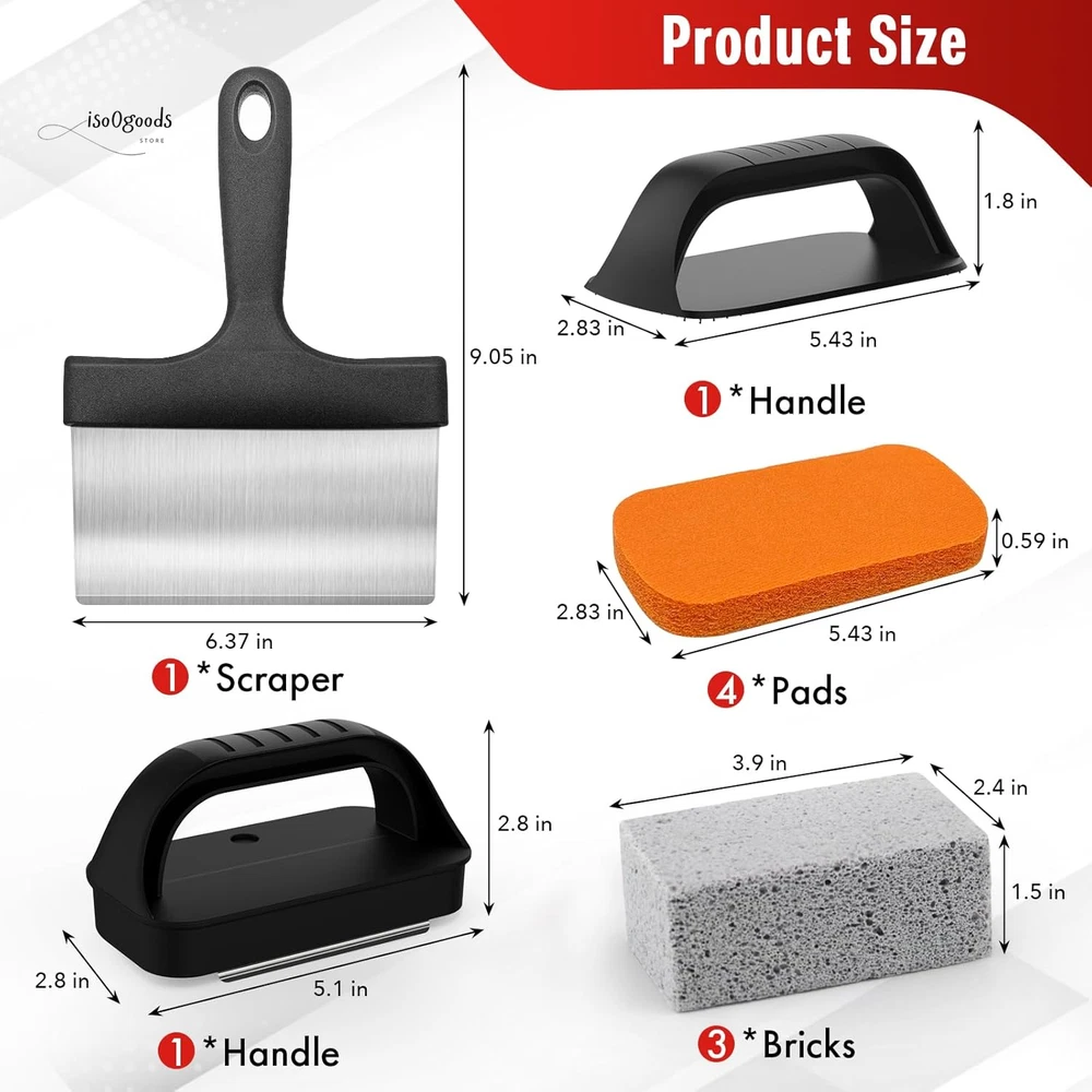 Extend the Life of Your Griddle: Kickstart a healthy lifestyle with spotless kitchen tools! Use MEKER's griddle cleaning kit before and after cooking to prevent your griddle from flaking and damage. Proper re-seasoning ensures long-lasting use and optimal performance. Multipurpose Scraper: The versatile pan scraper is perfect for cleaning your skillet and griddle. Barbecue turners make flipping food a breeze, and the heavy-duty BBQ scraper can even chop food. Discover endless uses in your outdoor barbecue area—cleaning has never been this fun! Safe & Scald-Free: The flat top grill cleaning kit comes with scouring pads and an easy-to-install handle, perfect for use on hot or cold surfaces. Protect your hands from scalding and enjoy a hassle-free cleaning experience. Efficient Cleaning: A clean griddle surface is key to optimal cooking. Our BBQ Grill Bricks are made from 100% natural pumice stone, specifically designed for flat top grills. They won’t scratch ceramic tiles or metal surfaces, and they effortlessly remove residue, stains, and dirt. Effective on cast iron, pots, stainless steel griddles, and grills—say goodbye to stubborn residue! 10 Essential Tools: Looking for a thoughtful gift? This griddle cleaning kit is a must-have for any backyard kitchen. It complements griddles and grills like Weber, Charbroil, and Coleman. Treat yourself and your loved ones to the ultimate cleaning solution! Year-Round Use: The Griddle Cleaning Kit for Blackstone is perfect for both residential and commercial griddles. Whether you're a professional chef or a weekend grilling enthusiast, this kit ensures a clean and sanitary cooking surface. Product Description: Easy to Store All Purpose Ideal Gift Healthy Life