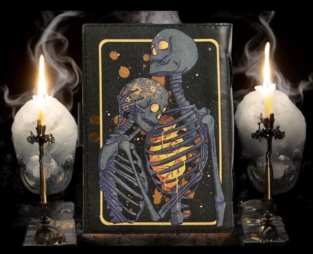 The Grimoire Printed Journal is a luxurious and limited edition notebook featuring a beautiful leather cover with a Gothic design and skull motif. This handmade journal is personalized and perfect for those seeking a unique and mystical writing experience. Made in India, this special edition notebook is a must-have for anyone looking to add a touch of occult charm to their writing. Book of Spells Grimoire Printed Journal The Lovers Tarot Notebook Spiral Gothic Notebook Skull lover Antique Journals gifts for men or women • Vintage lock closure • Genuine buffalo leather • Vintage deckle edge old paper • handmade rustic cotton paper • 100 Sheet (200 pages both side) - Leather journal witchcraft book of shadows notebook is made with 200 pages of Antique Paper which looks like it was pulled from history. You will fall in love with the the antique handmade cotton paper which is unique to our Vintage Journal Notebook. ● The vintage clasp lock will keep all your valuable writing locked inside.Sturdy hand stitched binding to make sure that no paper comes out loose from your spell notebook. ● The witchcraft supplies journal is printed with a special seven stone called “Chakra healing” which helps to reveal inner truth within yourself and encourage self-awareness and self expression. We have taken extra to make sure that the emboss is perfect in every piece. ● Sketch, Doodle, Write on your Leather Blank Spell Journal with a Calligraphy Pen Fountain Pen, Brush Pen, Ball Pen, Acrylic Colours, Watercolor and many more. We guarantee no bleed through. ● Can be used as a notepad, journal, writing notebook, sketch book. 1.25 inch thickness, easy for handwriting, drawing or sketching and compact for carrying in your bag. Ideal for alternative ● Artist Sketchbooks, Photo Album, Traveling Notes, Business Executive, Logbook, Poetry Work, Journalists, Food Planner, Instagram Scrapbook and Bible Journaling. ● Best Gift For Your Companion: A Journal Is Like A Trusted Friend. You Can Use It To Solve Queries, Get Inventive, Or Record Valuable Memories For Them To Last Forever Or You Can Just Use It As A Gift For Your Wife, Son, Or A Daughter Or For Some Enthusiastic Writer In Your Family. Even For Looking For A Miraculous Spell Book Or A D&D Gamer Looking For His Quest Book. ● Perfectly Sized For Multi-Purpose Use: Length 5", Width 1", Height 7" Inches, This Easy To Carry Personal Diary Is Perfect To Use As A Health Journal, Sketchbook, And Poetry Journal. It’S An Ideal Journal Which Records Your Daily Thoughts And Life Lists. And Also Good For Designing, Doodling, Or Calligraphy Of Your Choice.