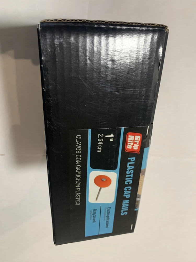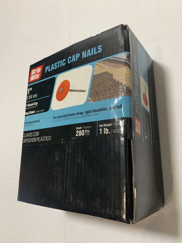 The Grip-Rite 1" Plastic Cap Nails come in a pack of 280. These roofing nails have a flat head style, a bright finish, and a gauge of 2.54. They are made of plastic material and are 1 inch in length. Suitable for various roofing applications, these nails provide secure fastening for your projects.