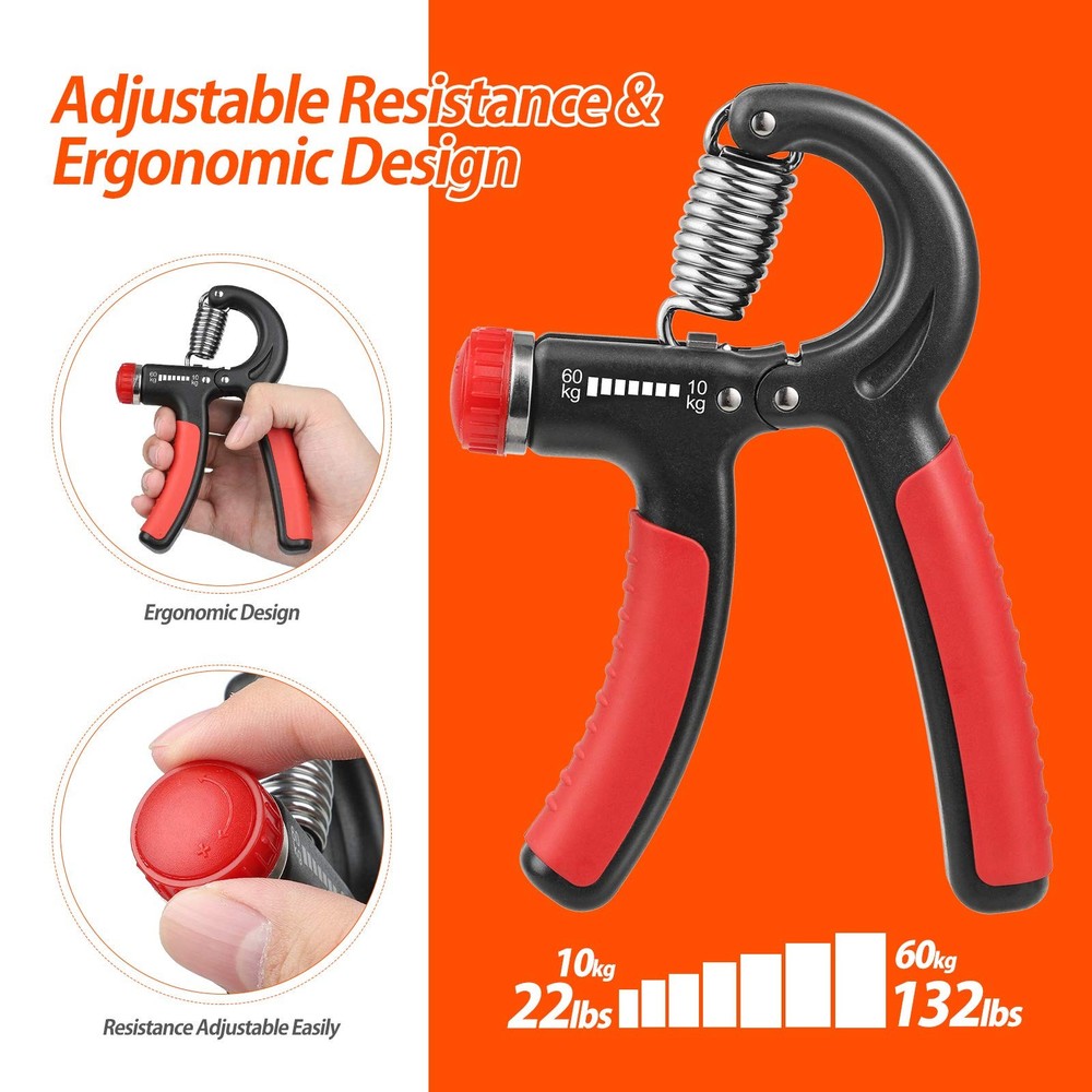 Grip Strength Trainer, Hand Grip Strengthener, Adjustable Resistance 22-132Lbs (10-60kg), Forearm Strengthener, Perfect for Musicians Athletes (Orange, 1 Pack) IMPROVE YOUR GRIP STRENGTH & BUILD STRENGTH - The adjustable grip strengthener is excellent for strengthening hands, forearms, wrists and fingers. It’s easy and efficient, and it helps to strengthen your grip, relieve , and increase stamina. Ideal for anyone wanting to develop and maintain strong healthy hands. ADJUSTABLE RESISTANCE & PORTABLE PERSONAL HOME GYM - Adjustable resistance, you can adjust it from 22 lbs (10 kg) to 132 lbs (60 kg) according to your need. Can be done at home or in office with just 5-10 minutes per day. Perfect for athletes, musicians, rock climbers, tennis players, etc. HIGH QUALITY & DURABLE - Our grip strength trainer is made of heavy-duty plastic and reinforced metal alloy materials, unlike our competitors, which will break or even be made of low-quality materials. Durable and safe, it will not damage your hands and fingers, which will bring you an excellent user experience. EASY TO CARRY & PORTABLE DESIGN - We designed this hand exerciser grip strengthener with you in mind. No matter you’re beginner or an experienced person, you can start grip training anytime and anywhere. hand gripper is made of lightweight and high-quality materials so that you can easily put them in your bag or pocket and carry them anywhere. 24/7 USA - Finding the right grip strength trainer from a reliable, trustworthy company is challenging. You, the , are always #1. We hope you enjoy your grip trainer and if you have any questions regarding your hand grip strengthener, just send a message, and of our friendly, USA-based members will offer you any help you need. Click the ADD TO CART button now and try our product completely risk !