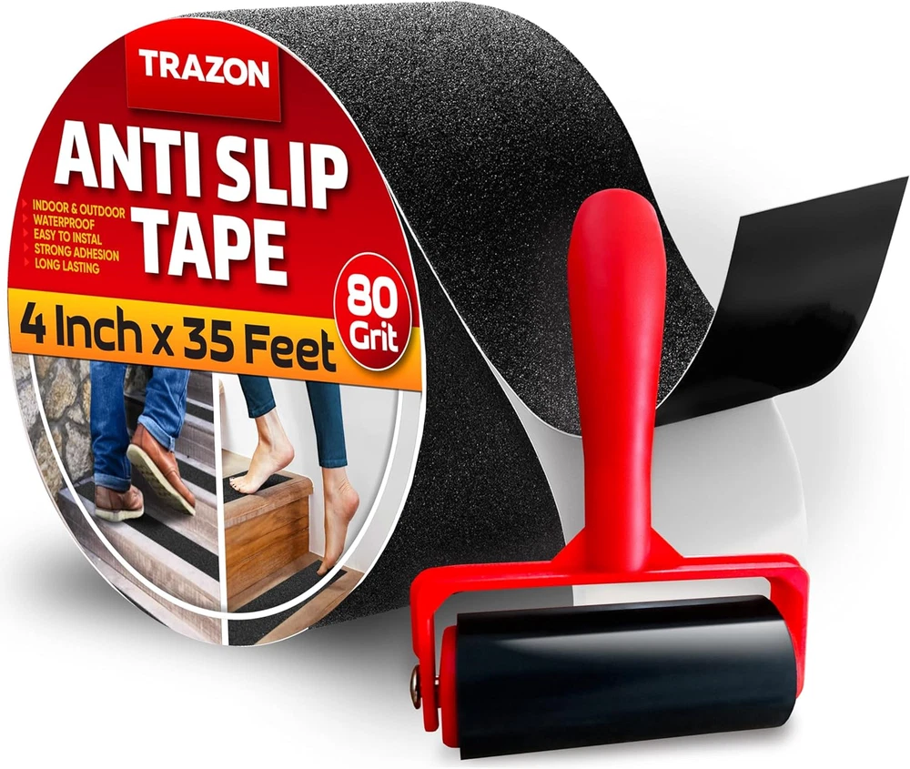 Store New Arrivals Add to Favorite View Feedback Contact Grip Tape - Heavy Duty anti Slip Tape for Stairs Outdoor/Indoor Waterproof 4Inch X 35Ft Safety Non Skid Roll for Stair Steps Ramp Traction Tread Staircases Grips Adhesive Non Slip Strips Walk Black Description Item model number 4 Inch x 35 Feet Unit Count 35 Feet Number of Items 1 Compatible Material Wood, Laminate, Hardwood, Tile, Stone, Concrete, Metal, Plastic, Glass Color Black Water Resistance Level Waterproof Brand Trazon Material PVC Country of Origin China Item Weight 1.85 pounds Recommended Uses For Product Indoor & Outdoor Surface Recommendation Wood, Laminate, Hardwood, Tile, Stone, Concrete, Metal, Plastic, Glass Size 4 Inch x 35 Feet Special Feature Anti Slip, Long Lasting, Weather Resistant, Heavy Duty, Self-Adhering Product Dimensions 5.28 x 5.28 x 4 inches Manufacturer Trazon Professional grade anti slip adhesive tape: Durable waterproof anti skid tape for steps is perfect for outdoor and indoor use. We use premium heavy duty 80 grit tape which creates the ideal texture to fully prevent slipping. Non skid tape provides extra foot traction for your additional protection on any slippery surface, including stairs, patio, entryways, ladders, deck ramp, laminate, skateboard, scooters, tile, slippery floor, trailers, boats, sporting equipment, and forklifts. Waterproof, long lasting & peel resistant in any weather: Our abrasive grip tape roll for stairs was specifically designed to withstand heavy foot traffic and any weather conditions, including rain, snow, frost, sun, water, and heat. Stair tread tape creates an exceptional long term grip on all surfaces for many years. Works on multiple surfaces: Non slip tape strongly adheres to all surfaces, including smooth and rough coverings. You can stick this anti slip traction tape on wood, tile, stone, concrete, metal, plastic and glass, all of which require extra foot traction. Enjoy all around protection and ultimate comfort in your home, as well as in hotels, restaurants, businesses and educational establishments. Made for you safety: Our adhesive non slip tape for steps is designed specifically to make your home safe for you and your family. Superior anti skid tape for steps outdoor creates a safer environment for walking, working, stepping and standing. Reduce the risk of falls, trips and slips for your loved ones, especially the eldery, children and pets. Easy to use with our customer suport. Non skid tape measures 4 in by 35 ft - the perfect size for all your needs. Simply cut out a piece of any size, peel the protective film, and apply the tape on a clean surface. Designed in the USA and produced according to the highest quality standards. Your new favorite anti slip tape is just a few clicks away! If you have any problems, contact us. We will solve it for you! Product Description MAKE YOUR SURROUNDING A SAFE PLACE FOR YOU AND YOUR FAMILY! Non slip tape strongly adheres to all surfaces , including smooth and rough coverings. You can stick this anti slip traction tape on wood, tile, stone, concrete, metal, plastic and glass, all of which require extra foot traction. Enjoy all around protection and comfort in your home, as well as in hotels, restaurants, businesses and educational establishments. This allows you to get the maximum grip of the foot with the desired coverage. It has strong acrylic adhesive which adheres firmly to the surface you need. The waterproof anti slip tape is 35-foot long and 4 inches wide making it an all around tape for your home. PROFESSIONAL GRADE ANTI SLIP ADHESIVE TAPE We use premium heavy duty 80 grit aluminum oxide which creates the ideal texture to fully prevent slipping . Non skid tape provides extra foot traction for your additional protection on any slippery surface , including stairs, patio, entryways, ladders, deck ramp, laminate, skateboard, scooters, tile, slippery floor, trailers, boats, sporting equipment, and forklifts. PEEL RESISTANT IN ANY WEATHER Waterproof and durable - Trazon anti slip tapes are adapted for indoor and outdoor stairs . The stair grip tape is made of the best materials to provide satisfaction and durability in all weather conditions for long use WATERPROOF & LONG LASTING Our abrasive grip tape roll for stairs was specifically designed to withstand heavy foot traffic and any weather conditions , including rain, snow, frost, sun, water, and heat. Resistant to oils & detergents . Stair tread tape creates an exceptional long term grip on all surfaces for many years. Home & Workplace Stairs Our adhesive non slip tape for steps made with 80 grit aluminum oxide for the best traction and the perfect texture to make sure you and your surrounding are safe. Indoor & Outdoor Use. Waterproof High strength adhesive tape and durable waterproof anti skid tape for steps outdoor and indoor usage prevents slip on your slippery surfaces. Ladders & Step Stools Stair tread tape holds well on all surfaces and in all weather conditions. Ideal use grip tape for stairs, entryways, ladders and slippery floor. Ramps & Industrial Areas Just peel and stick to wood, concrete, stainless steel, plastic, tiles, cloth, ramps and more. Anti-Slip Tape Use Tips Make sure that the surface is clean and dry, free of oils, sand or dust. Temperature of the surface should be above 40˚F (at low temperatures, the surface can be heated with a heat gun). Apply to smooth surface. Prepare the application area: ensure it is smooth by filling in any cracks or holes. Porous surfaces should be sealed. Peel the protective film about 1'' from one end, apply the first part of the tape to the surface and continue removing the film while sticking the tape to surface. Once your tape is in place, firmly press it to the surface to ensure maximum adhesion. Apply extra pressure to edges. Note: On stair treads, apply anti-slip at about 0.5-1'' away from the edge of the tread to prevent premature wear or curling of the tape edge. We do not recommend applying anti slip tape