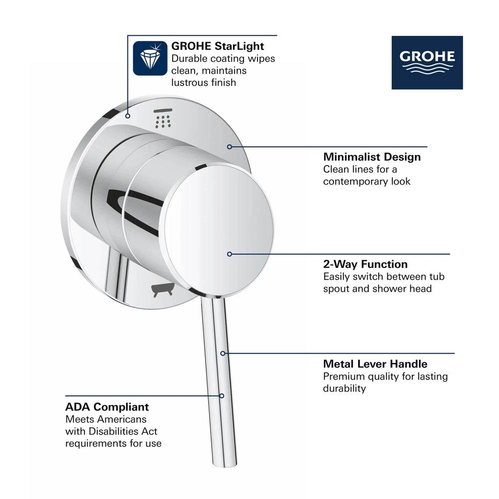 Powered by Frooition All Categories Grohe 29 104 Concetto Single Lever 2-Way Diverter Valve Trim Only for Tub/Shower (Valve Sold Separately) Overview Item Description Grohe 29 104 Key Data: 3-1/8" W x 3-1/8" H Number of Functions: Rough-in Valve Sold Separately Grohe 29 104 Features: Two-way diverter trim - Directs water flow from mixing valve to two distinct functions Diverts water between shower head and hand shower Premier finishing process - finishes will resist rusting and corrosion through everyday use Single metal lever handle transitions between two functions ADA compliant Fully covered under Grohe's limited lifetime warranty Rough-in valve not included - when adding to cart valve options will be presented Product Benefits / Technologies: StarLight Finish: Continuously improving over the last 70 years Grohe's unique plating process has been refined to produce and immaculate shiny surface that is recognized as one of the best surface finishes the world over. Grohe plates sub layers of copper and/or nickel to ensure that a completely non-porous, immaculate surface awaits the chrome layer. This deep, even layered chrome surface creates a luminous and mirror like sheen. Grohe 29 104 Specifications: Overall Height: 4-13/16" Escutcheon Height: 3-1/8" Depth: 2-5/8" Includes 1 handle Why Choose BuildInc? OUR PROMISE TO YOU About Us At Build, we promise to provide the best selection we can, most competitive pricing, and unmatched customer service. Our store has quality home improvement products from trusted manufacturers like Moen, American Standard, Delta, Kraus, Kichler, Progress Lighting, Schlage, Kwikset, Baldwin, Broan, NuTone, Air King, and Rev-A-Shelf. With over 200,000 home improvement products for you to choose from, we have just what you need to get your project done. Fast & Free Shipping We promise to make it our priority to get you your items as fast as we can. We ship from 440 warehouses around the country, ensuring that your product will get to you as soon as possible. We know you're eager to get your hands on your new purchase, we would be too. As a bonus, most items ship for free. Returns We are happy to accept returns of unused or defective items for a refund within 30 days from the date of delivery. For returns outside 30 days, please contact our Customer Service team to go over our options. For full details, please view the Shipping and Payments tab above. To initiate a return simply go to the eBay Returns Portal and submit a return request. We ask that all items be returned with all original components via a traceable method. Once your return is received and processed, we will quickly get your refund or replacement issued. If for any reason you are unsatisfied with your purchase or for product or warranty questions, please contact Customer Service team for assistance. More Items! View more great items! About Us | Shipping | Returns | Contact Us | FAQ | Collections | Special Offers! Powered by Frooition Frooition Frooition | No-js Template | eBay design, eBay store design, eBay shop design, eBay template design, eBay listing design (ver:froo_no_js) This listing is currently undergoing maintenance, we apologize for any inconvenience caused.
