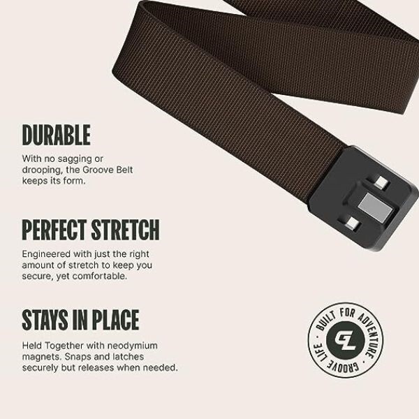 The Groove Belt B1-012-os in Walnut Brown is a versatile and stylish men's belt. It features a wood grain buckle with a magnetic closure for added convenience. The belt is designed with a stretchable material and adjustable sizing, making it comfortable to wear and suitable for various occasions such as golfing, work, or formal events. The walnut brown color adds a touch of sophistication, while the braided/woven style gives it a classic and timeless look. This belt is a practical accessory that combines both functionality and fashion. GROOVE BELT IS MADE FOR KICKING ASS ADVENTURING TACTICAL GRILLIN' MEAT TRACKING BEARS LOOKING GOOD Set it and forget it: Adjust once, wear all day. Groove Belt, where comfort meets durability for moms, dads, athletes, and weekend warriors. Magnetic Magic : Snap-on ease with rare-earth magnets in A380 aluminum alloy buckle. Proprietary webbing for secure, comfy wear all day. Easy Fit Guarantee: Match your pant size, and we handle the rest. Check our sizing guide or email customer service for personalized assistance! NO BS Warranty: Groove products, designed for adventure. Our No BS Warranty covers manufacturing damages – no excuses, just excellence.