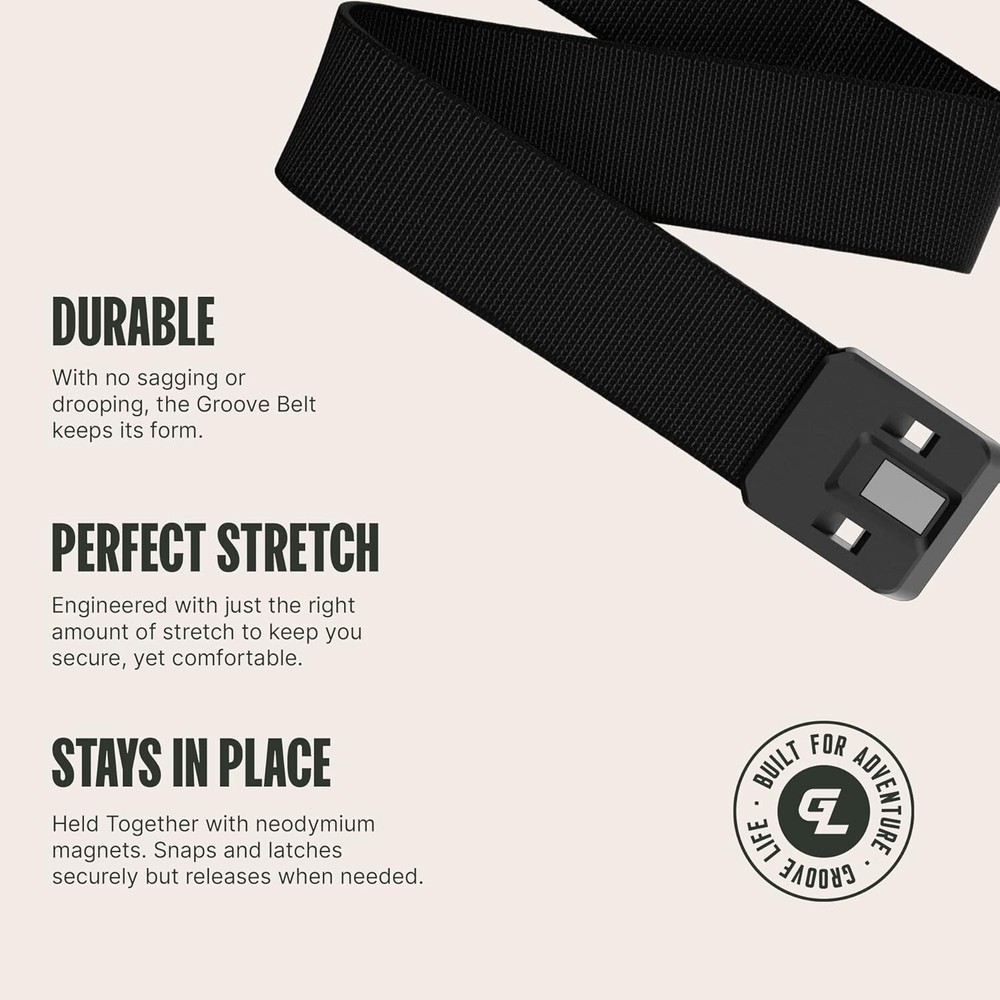 Groove Belt Men's Stretch Nylon Belt with Magnetic Aluminum Buckle, Coverage DESIGN - There’s a reason the Groove Belt is our best selling product. This tactical belt is ultra-comfortable and durable, it’s the perfect everyday belt for hard-working moms and dads, athletes, and weekend warriors. The average person adjusts their belt 5+ times per day, but the Groove Belt only needs to be adjusted one time ever. MATERIALS - Its signature magnetic clasp also makes this the easiest belt to snap on during your morning hustle and wear all day long without hassle. Our tactical belt began with our proprietary webbing, engineered with just the right amount of stretch to keep you secure, yet comfortable. We then added the world’s best belt buckle that clicks seamlessly into place using rare-earth neodymium magnets set in an A380 aluminum alloy. SIZING - We’ve made it real easy. Just match your pant size and we’ll do the rest. Check out our sizing guide in the product images for additional details. You can always call our customer service department for more assistance! We would love for you to say hi! NO BS satisfaction - Adventure and innovation are at the core of who we are. products are driven by those values and are designed for a lifestyle of adventure. In the event you adventure too far, and you feel like your Groove product is not living up to your standards, we’ll do what we can to make it right. Our 94 No BS satisfaction covers any manufacturing damages to your belt. If it's not our bad, (lost, torn, cosmetic, etc.) we’ll cover that too! fees and taxes may apply. BORN IN ALASKA. BUILT IN TENNESSEE - Born in the Alaskan wilderness. Adventure Guide Peter Goodwin realized his lifestyle demanded better gear backed by unbelievable customer service. was launched in a freezing garage in Port Alsworth, AK. Five s later, employs over 200 people in Tennessee. Product details Fabric type Aluminum,Nylon Care instructions Hand Wash Only Origin Made in the USA and Imported Country of Origin China About this item DESIGN - There’s a reason the Groove Belt is our best selling product. This tactical belt is ultra-comfortable and durable, it’s the perfect everyday belt for hard-working moms and dads, athletes, and weekend warriors. The average person adjusts their belt 5+ times per day, but the Groove Belt only needs to be adjusted one time ever. MATERIALS - Its signature magnetic clasp also makes this the easiest belt to snap on during your morning hustle and wear all day long without hassle. Our tactical belt began with our proprietary webbing, engineered with just the right amount of stretch to keep you secure, yet comfortable. We then added the world’s best belt buckle that clicks seamlessly into place using rare-earth neodymium magnets set in an A380 aluminum alloy. SIZING - We’ve made it real easy. Just match your pant size and we’ll do the rest. Check out our sizing guide in the product images for additional details. You can always call our customer service department for more assistance! We would love for you to say hi! NO BS - Adventure and innovation are at the core of who we are. products are driven by those values and are designed for a lifestyle of adventure. In the event you adventure too far, and you feel like your Groove product is not living up to your standards, we’ll do what we can to make it right. Our 94 No BS covers any manufacturing damages to your belt. If it's not our bad, (lost, torn, cosmetic, etc.) we’ll cover that too! fees and taxes may apply. BORN IN ALASKA. BUILT IN TENNESSEE - Born in the Alaskan wilderness. Adventure Guide Peter Goodwin realized his lifestyle demanded better gear backed by unbelievable customer service. was launched in a freezing garage in Port Alsworth, AK. Five s later, employs over 200 people in Tennessee. See more About this item