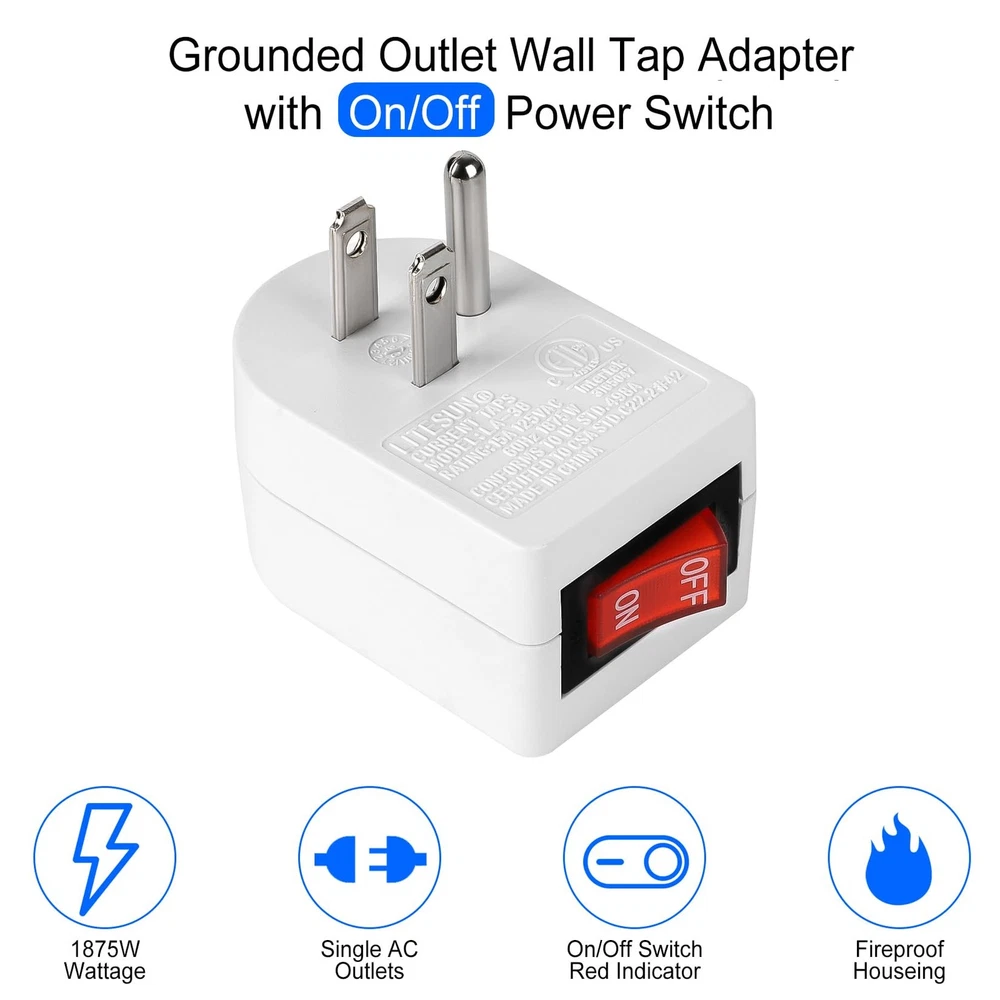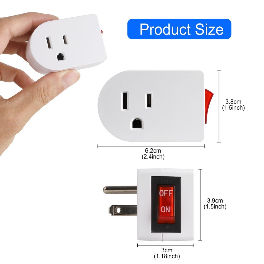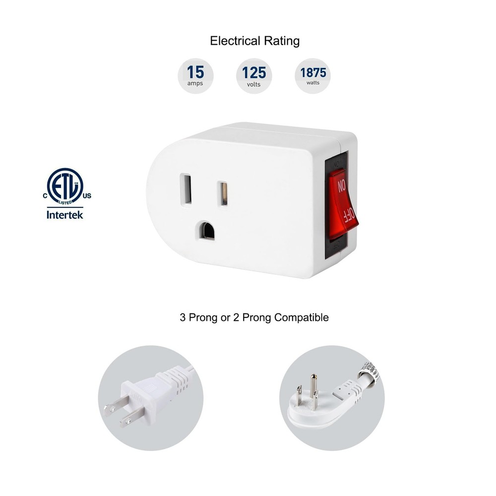 Grounded Outlet with on off Switch (4 Pack), Single Power Adapter Outlet 15A 187 ETL Certified. Rating - 15Amp, 125V, 60Hz, 1875W Unit works with any standard AC outlet. The power switch is designed with an indicator light, making it easy to see if the power is on or off. Versatile Use: This grounded power outlet with switch can be used to power various home appliances, such as lamps, televisions, computers, printers and other electronic devices. Cost-effective 4 pack of grounded outlet switch plug. Single port plug with switch for 3 prong grounded or 2 prong polarized cords. Easy install, With its small size and light weight. Space-saving Design: This compact and space-saving power outlet with switch has a small footprint and does not block the other outlet, making it ideal for use in tight spaces Reliable and Durable: This grounded power outlet with switch is made of high-quality materials and is designed for long-lasting use. 15A a power switch that can withstand up to 1875W of power This ON Off Switch is perfect for home and office use. With a grounded outlet and on/off switch, you can easily control the power to electrical devices. The 3-prong plug outlet switch is rated up to 15A 1875W and features a white finish that complements any decor. The compact design makes it easy to install in any standard outlet, and the built-in on/off switch makes it easy to turn devices on and off without having to unplug them. Perfect for use with lamps, fans, holiday decorations, and other electrical devices. Shipping We offer FREE shipping on all orders! We ship within Three business days of payment, usually sooner. We use a selection of shipping services such as UPS, FedEx, USPS etc. We only ship to the lower 48 states, no APO/FPO addresses or PO Boxes allowed. Local pickups and combined shipping options are not provided at this time. Return You can return a product for up to 30 days from the date you purchased it. Any product you return must be in the same condition you received it and in the original packaging. Please keep the receipt. Payment We accept payment by any of the following methods: PayPal Please pay as soon as possible after winning an auction, as that will allow us to post your item to you sooner! Feedback Customer satisfaction is very important to us. If you have any problem with your order, please contact us and we will do our best to make you satisfied. Contact Us If you have any queries, please contact us via ebay. We usually respond within 24 hours on weekdays. Please visit our eBay store to check out other items for sale! Thank you for shopping at our store.