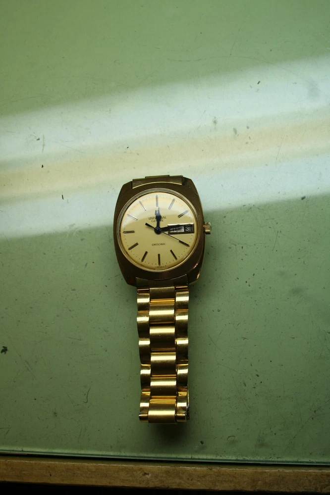RARE FIND! Working Universal Geneve Unisonic Tuning-fork wrist watch with day/date. Clean dial, crystal, and case. Movement 253 -- 15 jewels 16ky Electro-plate -- model# 2-831-628 -- serial# 553105 Bracelet has original fold-over clasp and is in excellent condition.