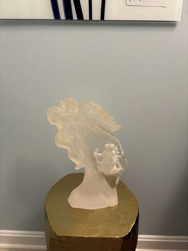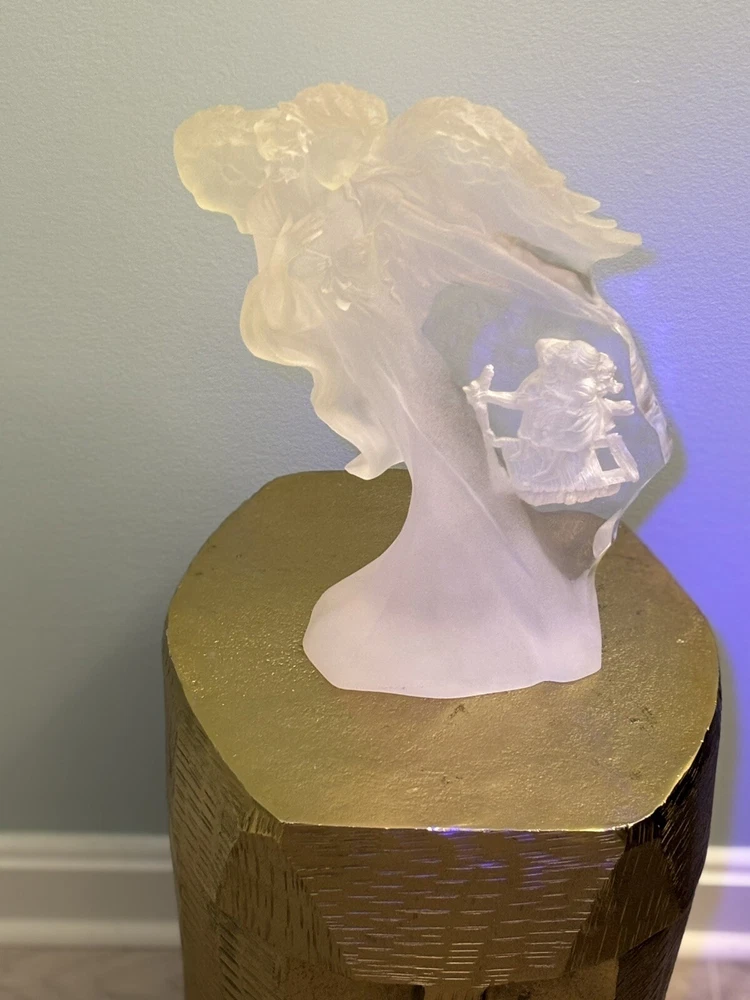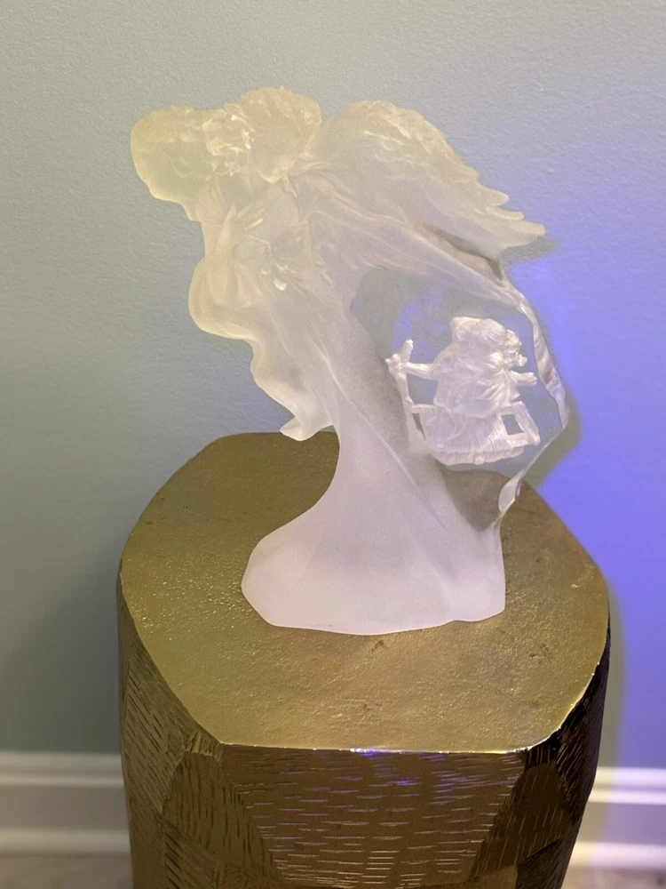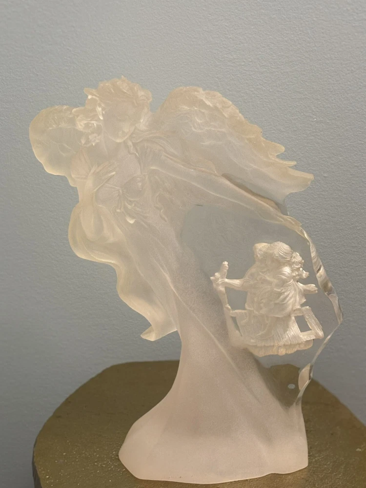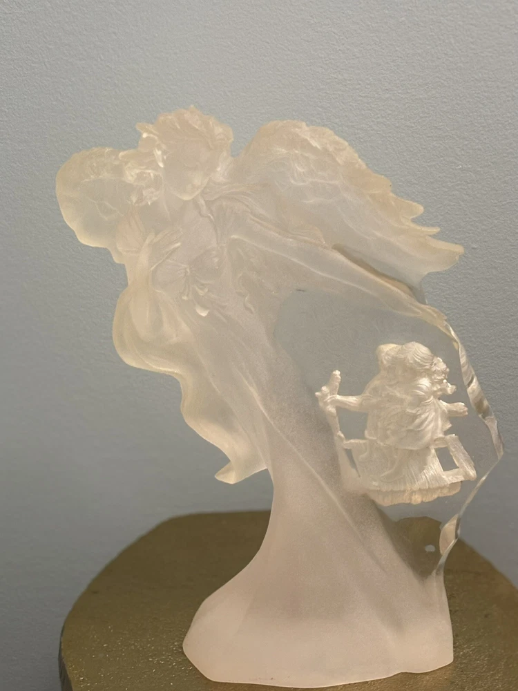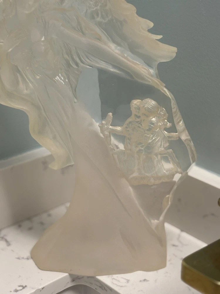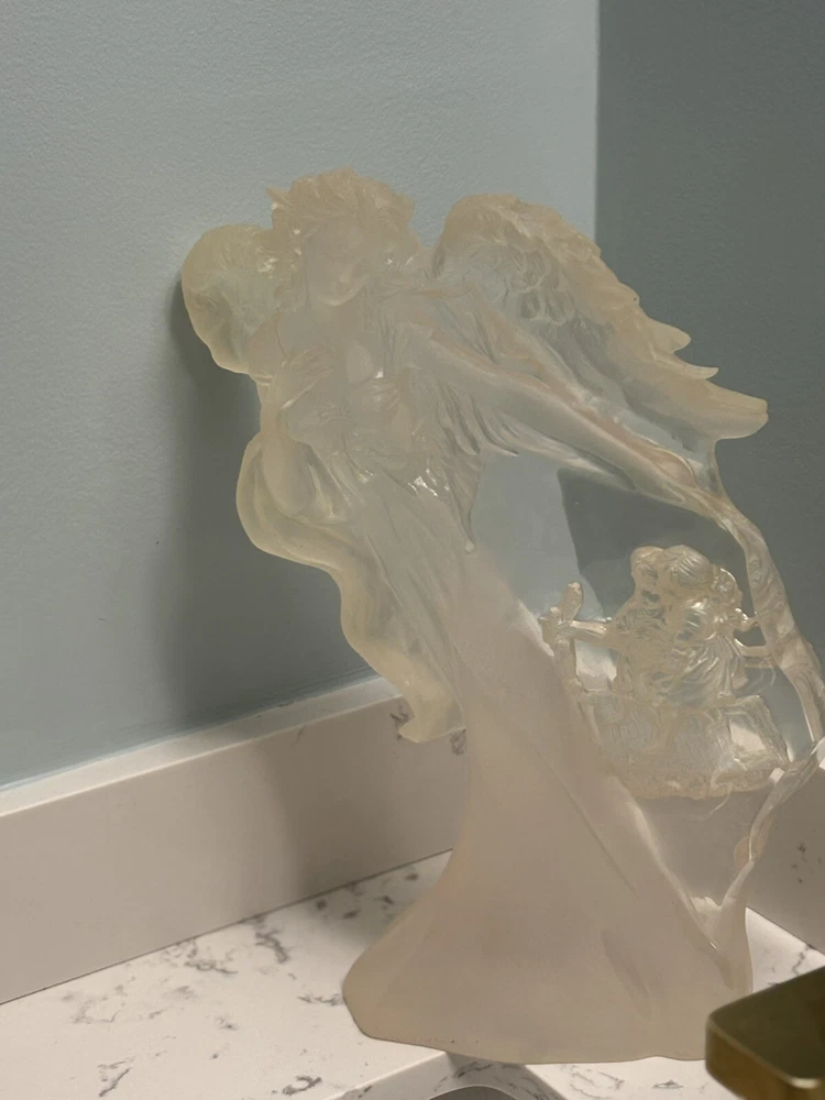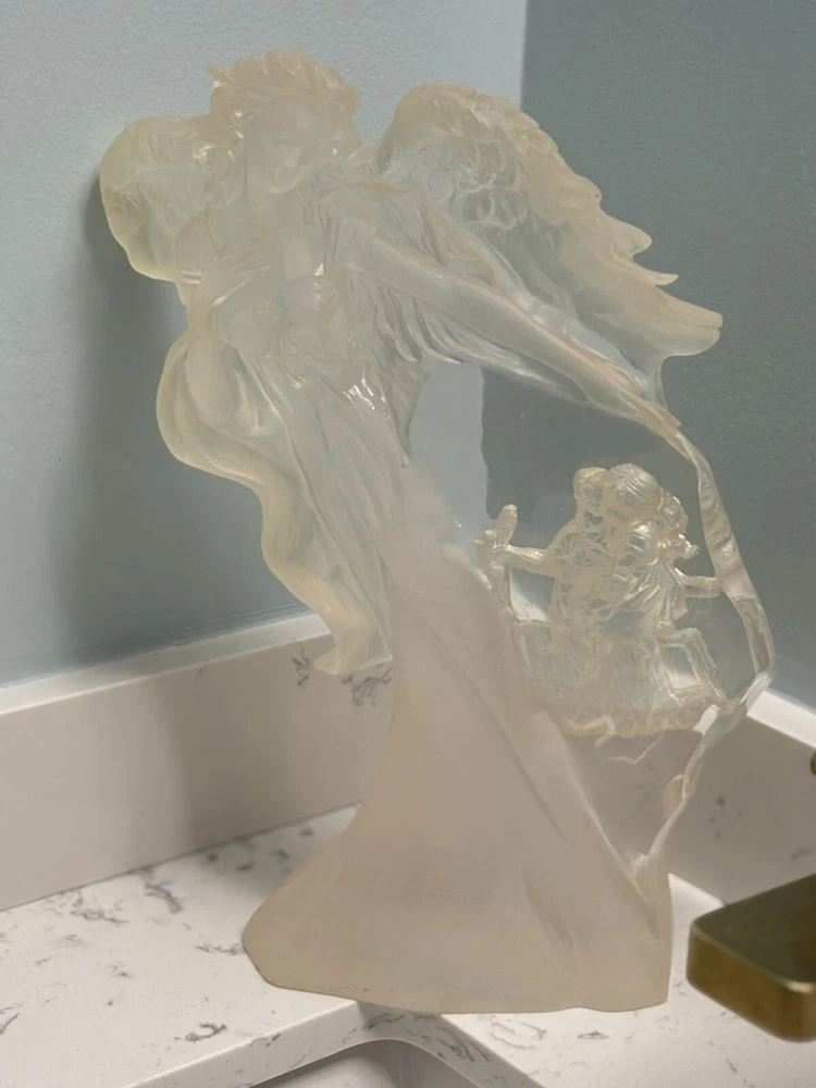 This vintage Guardian Angel statue is a beautiful addition to any room. Made from acrylic/lucite material, it features a frosted finish and a 3-D effect that adds depth to the intricate carvings. Measuring 12.5 inches in length, 12 inches in height, and 7 inches in width, this statue is perfect for teens and adults alike. The statue depicts a guardian angel watching over children, and it is waterproof, making it suitable for indoor use. The raised relief and translucent features add to the overall charm of the statue, which is ideal for collectors of angelique items. This original piece from the late 20th century is a must-have for anyone who believes in angels and wants to add a touch of religious theme to their decor. Thank you for your consideration! Returns accepted within 30 days; buyer pays return shipping