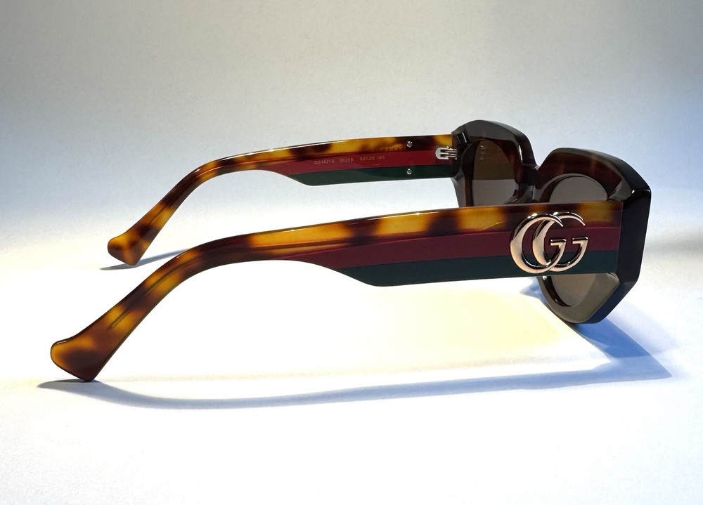Gucci Cat Eye Brown Lenses Polished Tortoise with Gucci Colors Acetate Frame MADE IN ITALY Specifications: Style: Cat Eye Model: GG1421S Color Number: 002FB Lens Width: 52 mm Temple Length: 145 mm Frame Material: Acetate Frame Color: Tortoise with Gucci Colors Lens Color: Brown The package includes: Sunglasses, Case, Cleaning Cloth. Condition: Each pair of sunglasses undergoes an extensive in-house inspection and cleaning process. The sunglasses are guaranteed to function as intended. We offer a 100% satisfaction guarantee. Shipping Information: Our items ship from California, USA. We will ship your item within 24 hours of receiving payment, excluding weekends and holidays. For any inquiries via email or messages, please allow us 24 hours to respond. Shipping Address: To protect our customers from fraudulent orders, we only ship to confirmed addresses. Please ensure your address is correct before placing your order. The recipient's name and address on eBay must match. We cannot make changes after your order has been placed. We do not ship to forwarding services, hotels, motels, or any unconfirmed addresses. No exceptions. Customer Service: We offer a 30-day money-back guarantee. If you encounter any issues, please contact us through the eBay system and select "Others" as the topic. We will provide you with the return information. 100% Satisfaction Guarantee: Thank you for your purchase!