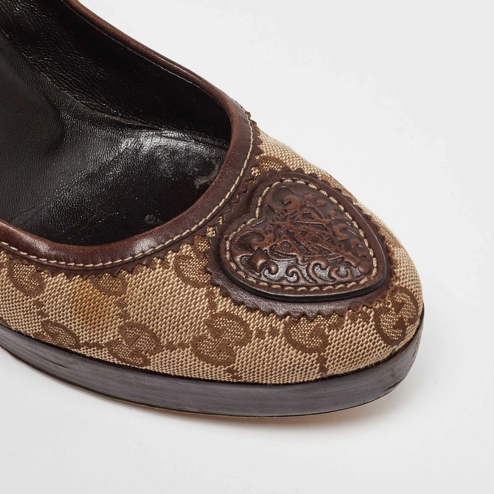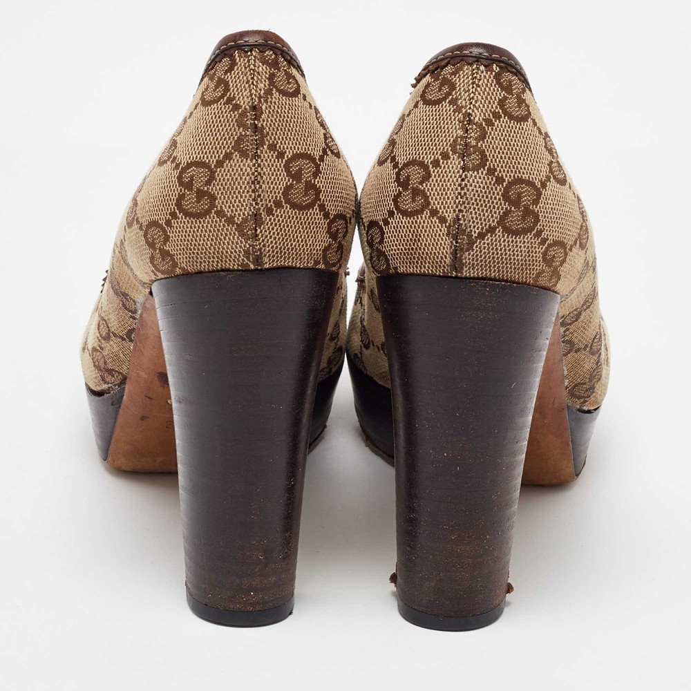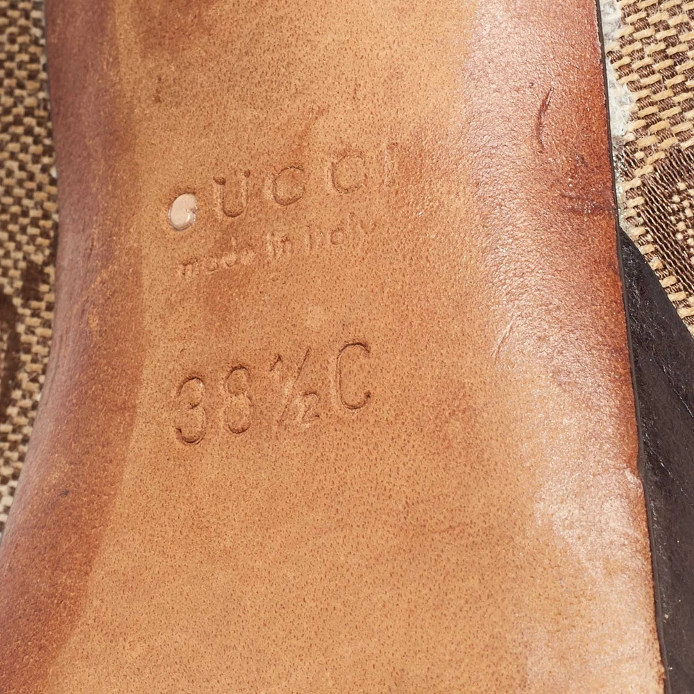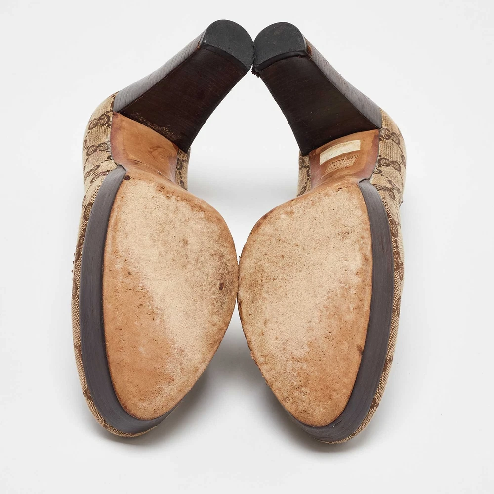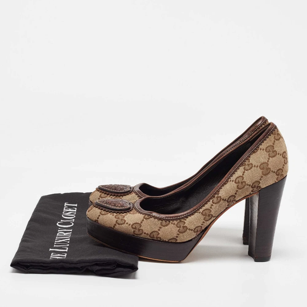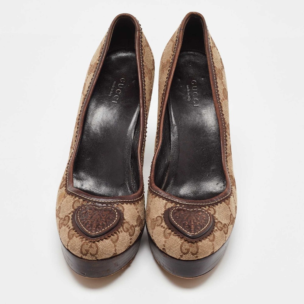 Make a chic style statement with these designer pumps. They showcase sturdy heels and durable soles, perfect for your fashionable outingsCertified by The Luxury Closet - This item has gone through a detailed authentication process overseen by our experts. We offer a lifetime guarantee of authenticity on all our items. Import duties, taxes and charges are not included in the item price. These charges are the buyers responsibility. Please check with your country’s customs office to determine what these additional cost will be prior to buying. Our eBay Store About Us Contact Us Add to Favorite Sellers Gucci Beige/Brown GG Canvas and Leather Platform Pumps Size 38.5 $165 Make a chic style statement with these designer pumps. They showcase sturdy heels and durable soles, perfect for your fashionable outings Product Details Brand Color Beige Dimensions Material Canvas, Leather Size 38.5 Outsole Width 7 cm Outsole Length 24 cm Heel Height 10.5 cm Includes The Luxury Closet Packaging Certified by The Luxury Closet This item has gone through a detailed authentication process overseen by our experts. We offer a lifetime guarantee of authenticity on all our items. How We Check The in-house team of experts at The Luxury Closet is highly trained to verify the authenticity and the condition of the luxury products. They ensure that only 100% authentic items are put on sale.The evaluation process is unique with its own mix of assessment criteria and differs according to the category. Each item is evaluated based on the following combination of hallmarks, hardware, stitching, symmetry, material, craftsmanship, stamping, codes, hologram stickers, and packaging. Our authenticators also check if the items have been modified or amended (e.g., aftermarket diamonds, replaced batteries, repaired bags, etc.) International Buyers Import duties, taxes and charges are not included in the item price. These charges are the buyers responsibility. Please check with your country’s customs office to determine what these additional cost will be prior to buying.
