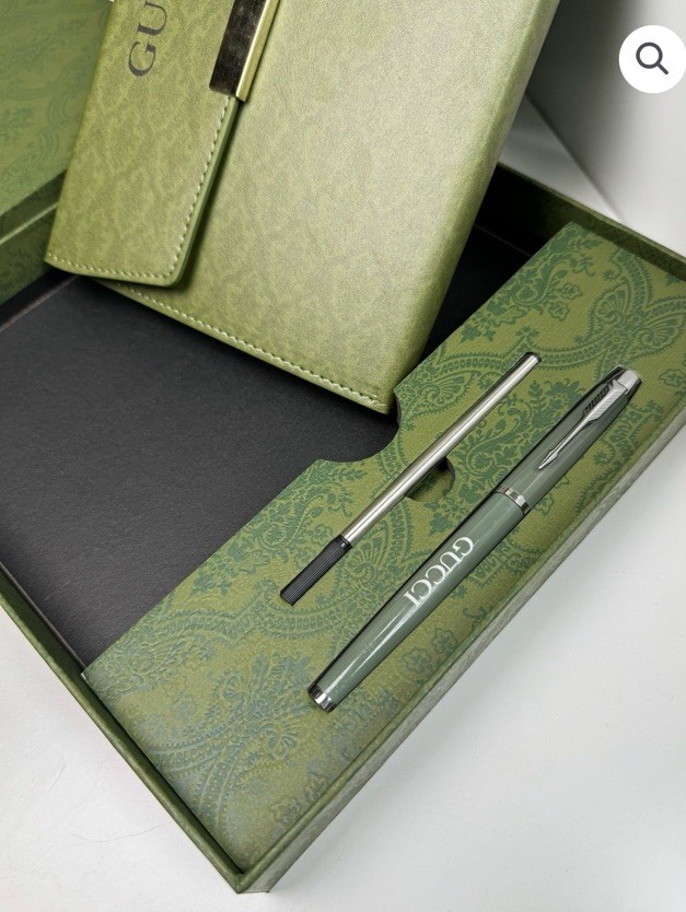 Includes: Notebook Ballpoint Pen Pen Refill The Gucci NIB Writing Set is a luxurious stationery item that includes high-quality paper notebook and writing instruments. This collectible set is perfect for those who appreciate fine craftsmanship and elegant design. With the iconic Gucci brand, this writing set is sure to impress with its refined aesthetic and attention to detail. Ideal for both personal use and as a stylish gift for someone special. This