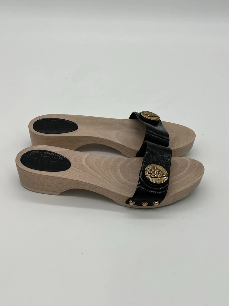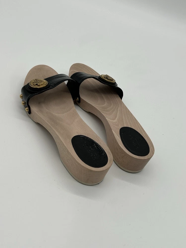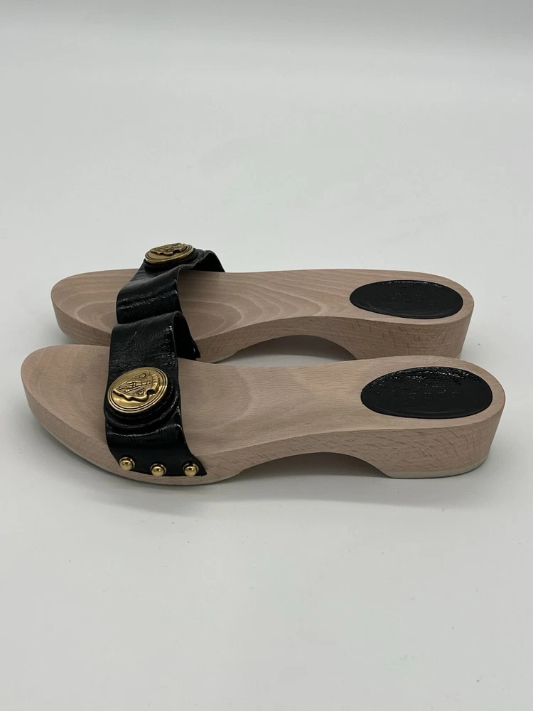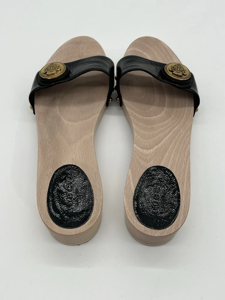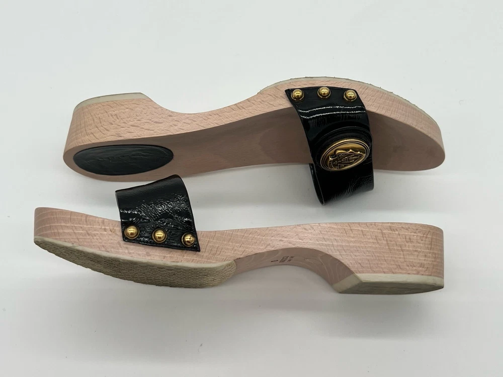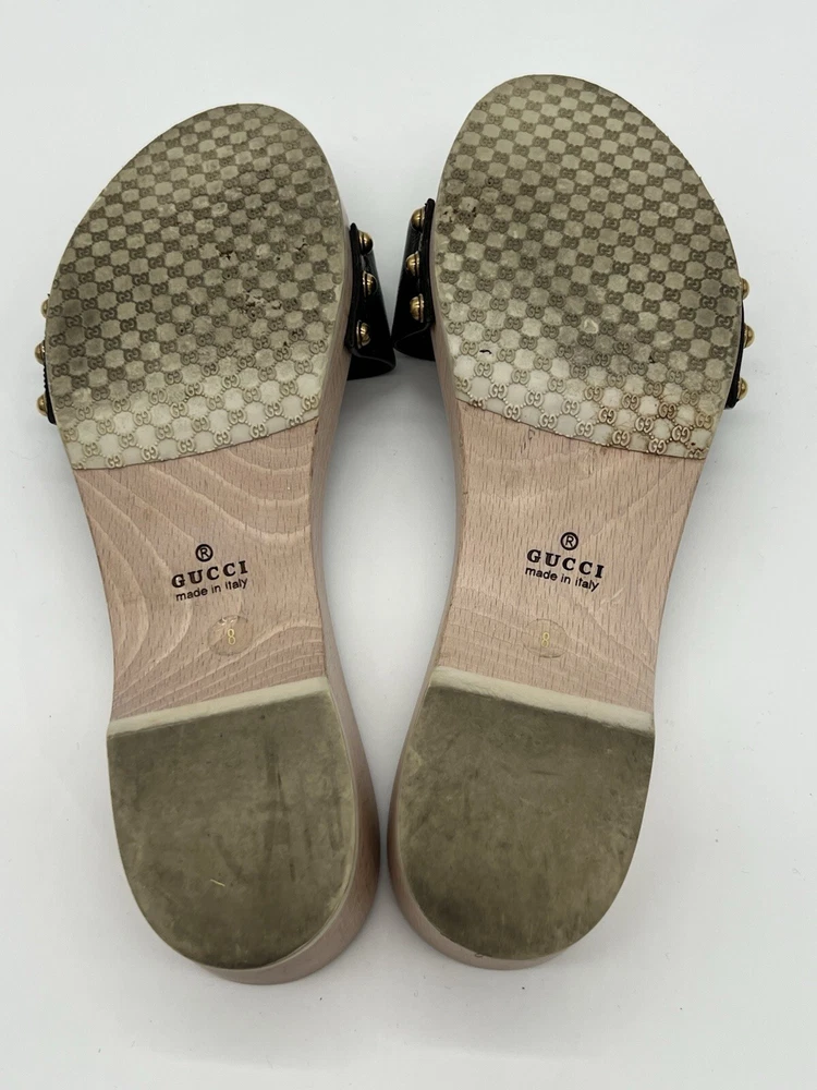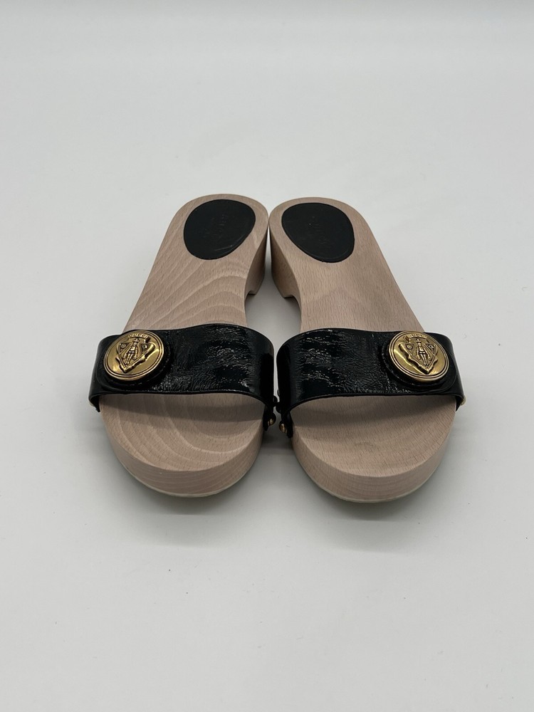 Gucci Hysteria Women Sz 8B Black Patent Leather Slide Wood Soles Fashion Sandals. Shoes are in used condition and have signs of wear but shoes are still in excellent condition. Upper leather is in excellent condition and very clean , inside is clean and the soles are in great condition. Nice comfortable shoes for casual wear. Condition is pre-owned. Shipped with usps priority mail. Sold as pictures. Thank you! Feel free to message me for any questions. Thank you