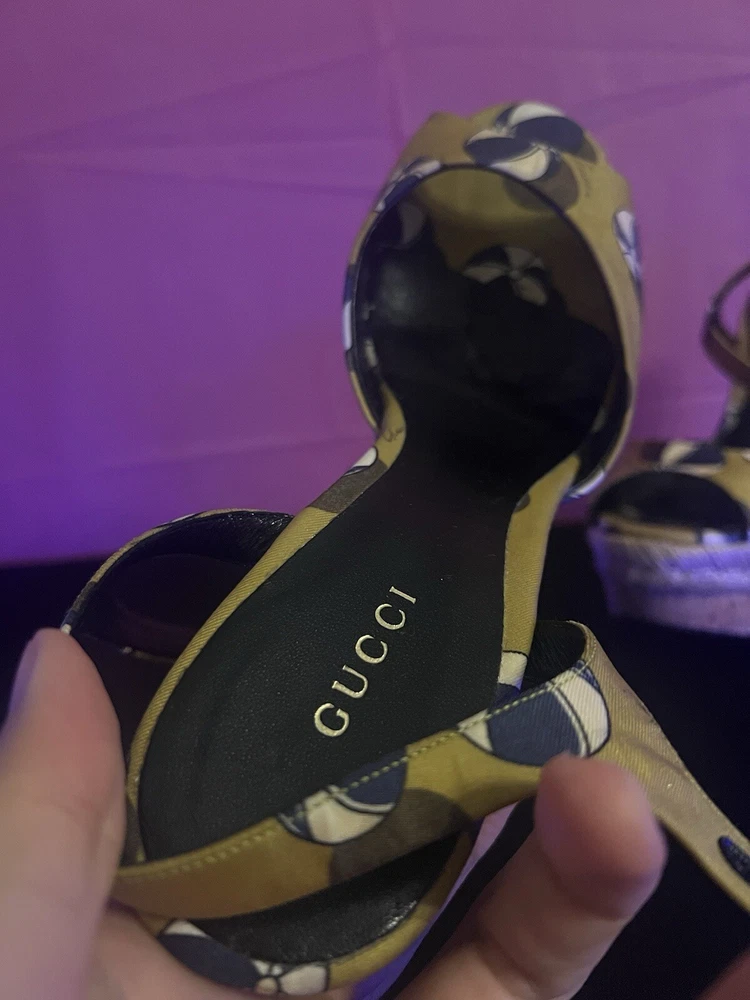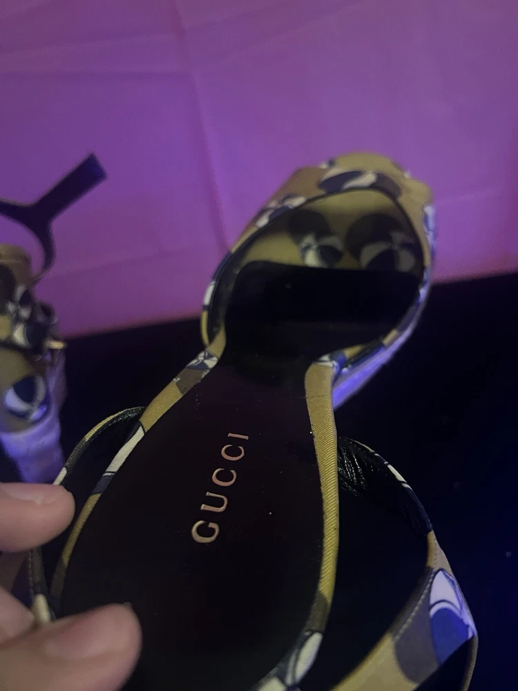The shoes are pre-owned and have wearing on the rubber outer soles. The inner soles are in good condition, and the Gucci logo can be seen in full view.
