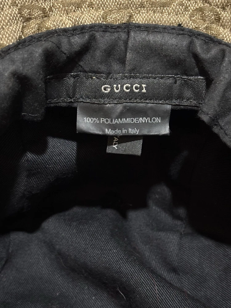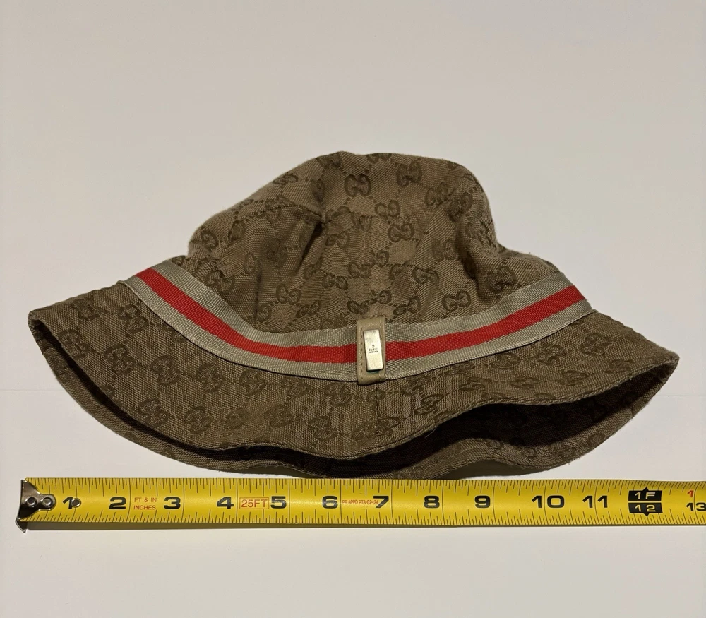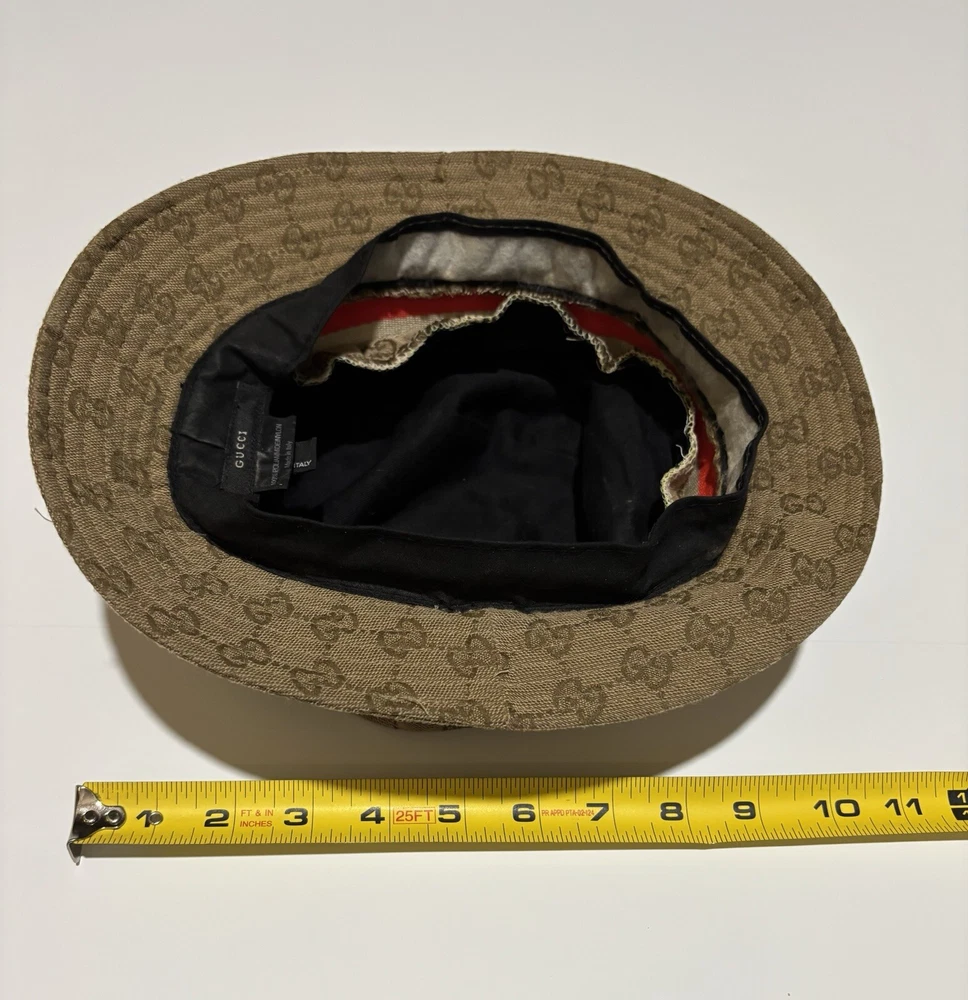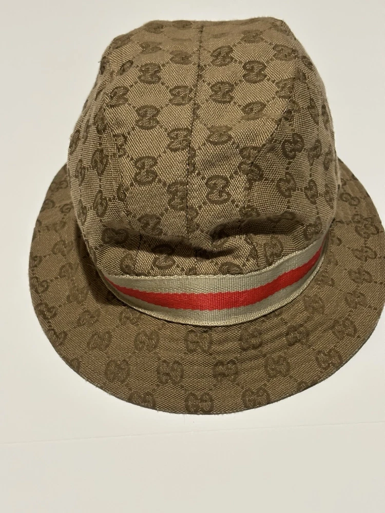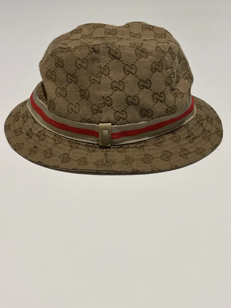Elevate your style with this vintage Gucci fedora hat. Made with a durable nylon and polyamide fiber blend, this beige canvas hat is perfect for any occasion, whether you're traveling, attending a party, or just out and about. The hat features the iconic Gucci logo pattern and is lined for added comfort. This unisex L-sized hat is perfect for anyone looking to add a touch of Italian designer style to their wardrobe. Whether you're going for a boho, classic, or retro look, this hat is sure to complement any outfit. Don't miss out on the opportunity to own a piece of Gucci history. This amazing hat is preowned and may show lite wear.
