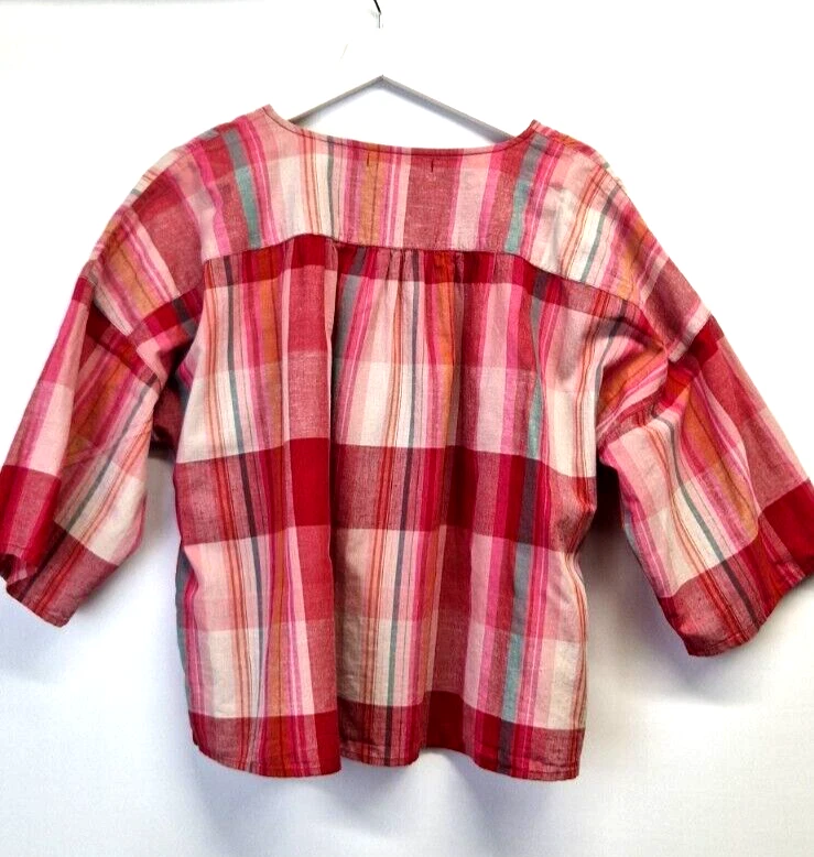Gudrun Sjoden plaid Short Sleeve Cotton Linen Button Up Crop Top Large red 17