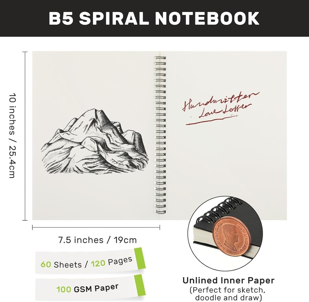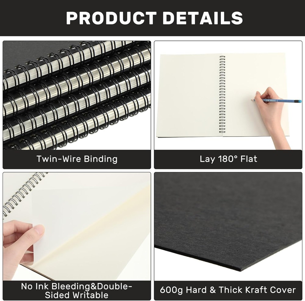 Gueevin 12 Pack Sketch Books Bulk 7.5" X 10 Spiral Bound Sketch Pads for Drawing 12 Pack Set: receive 12 bulk sketchbooks for drawing, all featuring sleek black covers, ideal for artists of all levels; Each notebook measures 10 x 7.5 inches ( 25.4 x 19 cm) , providing ample room for creativity and unrestricted hand movements; Ideal for beginners, painting enthusiasts, designers, and professional artists, unleash your imagination effortlessly; A warm present for parents, grandparents, friends, and teachers, great for most occasion Blank Inside Pages: drawing pad bulk is utilized of completely blank inner papers without the limit of the lined, promise a more free way for sketching, drawing, illustrating, painting, writing.; Everyone can be a painter; With 120 blank pages/ 60 sheets in each of the spiral notebook, you can record the beautiful things in life or doing serious art projects with these sketch book for kids Quality Material: the blank sketchbook for artist is made of 100gsm paper and 600gsm cover; Hard paper cover makes sure the durability of the sketch pads for drawing, you can stick the subject name, usage and other notebook detail information with the stickers; The cover of notebook and journal is durable enough for long time use; Paper resists feathering, ghosting, and bleeding without any extra bulk Spiral Bound Design: the spiral sketch pads are designed with sturdy spiral bound, so it is easy to lay flat, flip and fold over, and it allows easy, clean tear out of sheets; The drawing notebooks for artists can prevent ink from inks through the pages, suitable for pencil, pen, ballpoint pen, colored pencil, oil pastel,charcoals and crayons Suitable for Artists of All Levels: Whether it is recording the beautiful things in life or doing serious art projects, this sketchbook can meet your needs. This art sketchbook is an ideal for teen and adult, school and office supplies; The drawing notebooks are ideal for diary, sketchbook, scribbles, doodling, drawings, painting, creative writing, journal notebook, memo pad, work record, study notes, scrapbooks, poetry work and so on